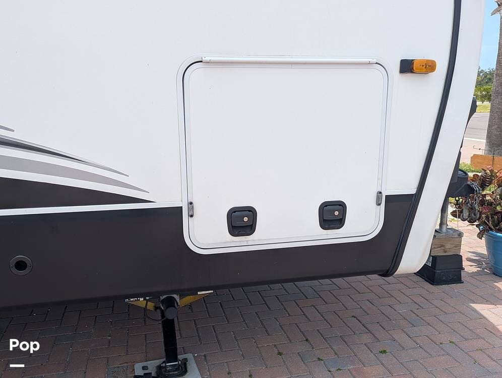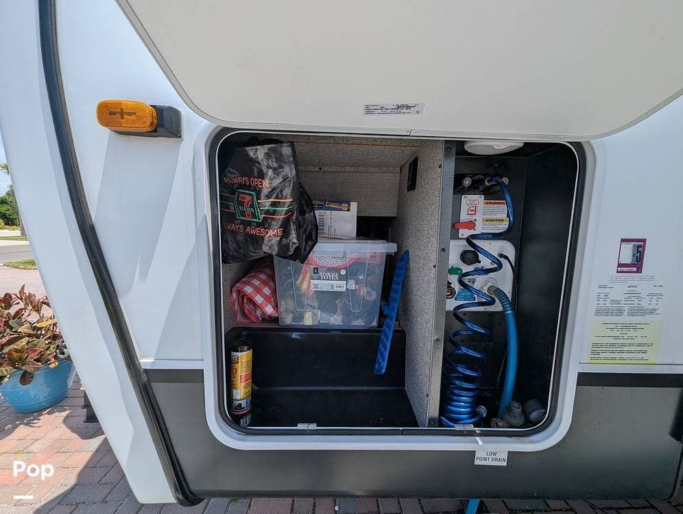 Outside the RV, there is storage and a roof ladder for easy maintenance access. It is easy to hook up this RV as there is an electric tongue jack, and it is pre-wired for solar.