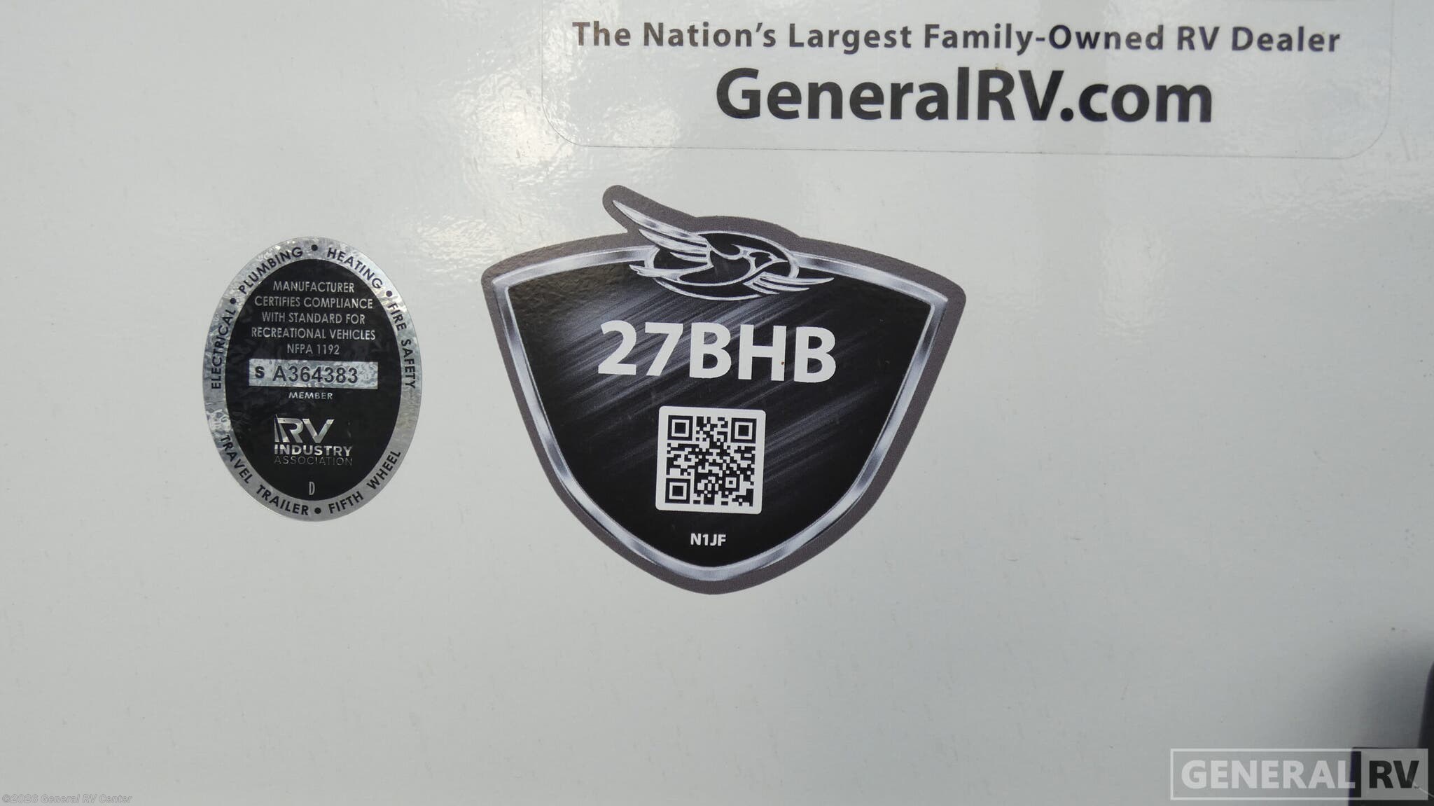 Jayco Jay Feather travel trailer 27BHB highlights: Double Size Bunks Dual Entry Entry Bench Seat Outside Kitchen Exterior Storage Get out and experience new campgrounds with this spacious trailer that offers a slide out jack knife sofa and dinette giving you dining, relaxing and sleeping space as well as more interior floor space to move from the front to the back. The dual entries are a great feature as well when you have eight campers on your trip. And having the second exterior entry/exit to the full bathroom is convenient for all. The cook will love the choice of making meals inside with full amenities or on the outside kitchen when relaxing under the 21' power awning with LED lights. And the front bedroom gives you a queen bed, dual wardrobes and windows for great views when inside. With any Jay Feather travel trailer by Jayco, you will experience an easy-to-tow, lightweight dual axle RV that is built on an American-made frame with an aerodynamic, rounded front profile with a diamond plate to protect against road debris, and includes Azdel composite in the perimeter walls, and Stronghold VBL vacuum-bonded, laminated floor and walls, plus the Magnum Truss roof system. Also included are features in the Customer Value package, and the Sport package which offers aluminum tread entry steps, roof-mount solar prep, an LED TV, and the Glacier package which includes an enclosed underbelly. The interior provides residential-style kitchen countertops with a decorative backsplash, residential plank-style vinyl flooring for easy care, a decorative wallboard for style, and ball-bearing drawer guides with 75 lb. capacity to mention a few of the amenities. Choose your favorite today!