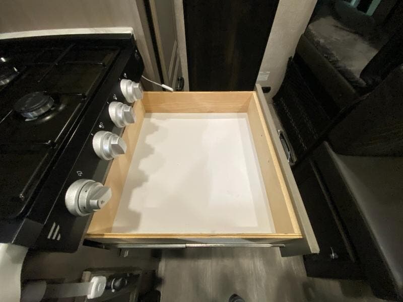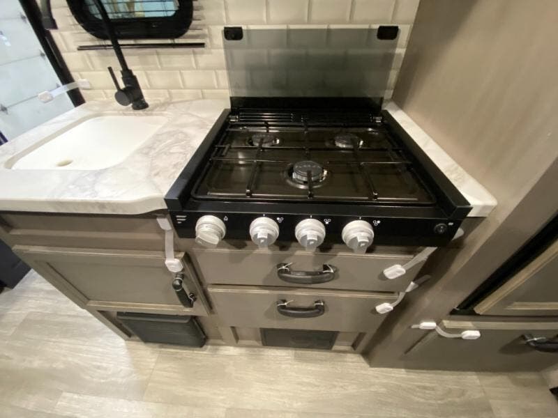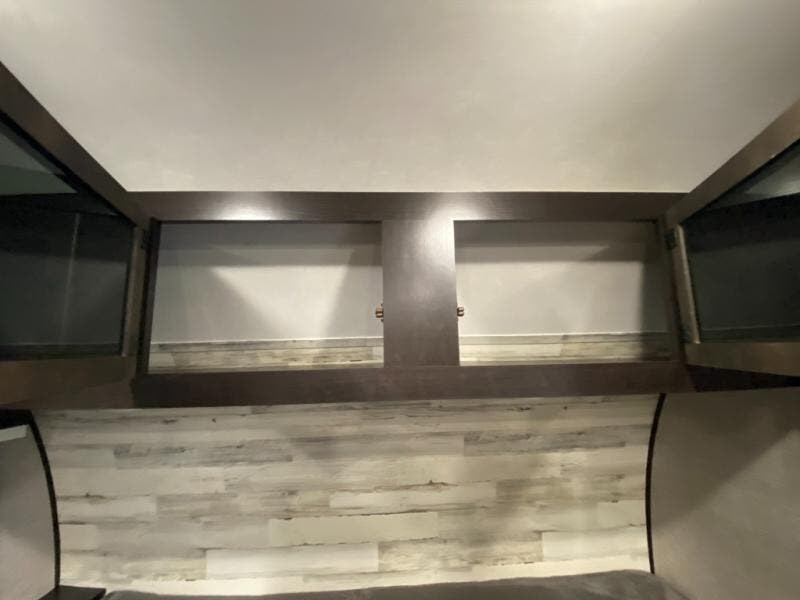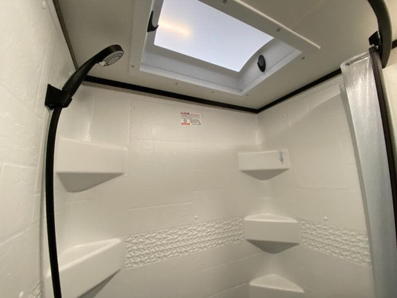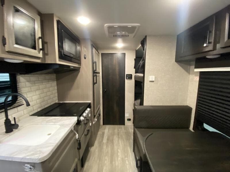 If you've been looking for a lightweight travel trailer with more sleeping space, your search is over with this model! There are bunk beds in the back near the full bath for convenience, a front queen bed, plus a booth dinette that will double as dining and sleeping space. This model also includes overhead compartments for your belongings, plus exterior storage for you fishing poles or tackle boxes.