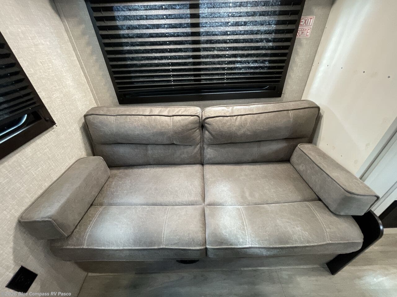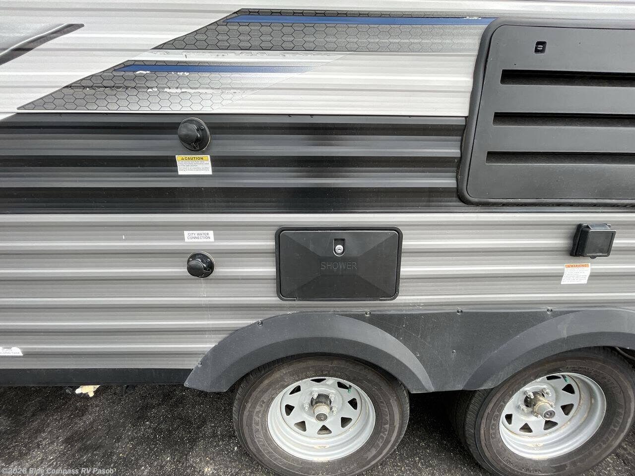 Looking for a couples trailer or a manageable RV that will sleep four when you utilize the furniture as sleeping space? Look no further to find a queen bed up front for two, and the jack-knife sofa plus the booth dinette provide sleeping space for two more. The cook will enjoy making meals with everything nearby to keep everyone fed, plus the refrigerator and pantry offer food storage. Everyone can get cleaned up in the full bathroom either in the morning or before bedtime, and the bathroom will come in handy during those night time trips. The outside offers a 16' power awning to relax under as you plan your activities, and there is storage for camping games, charcoal and such along the exterior.