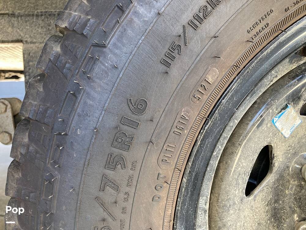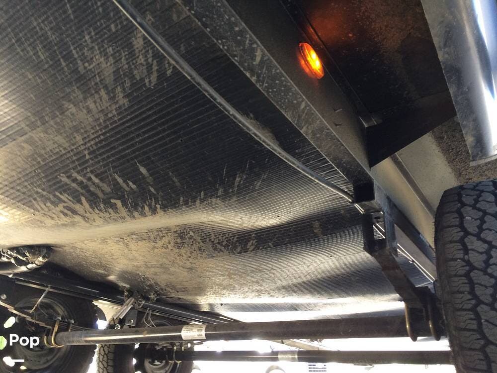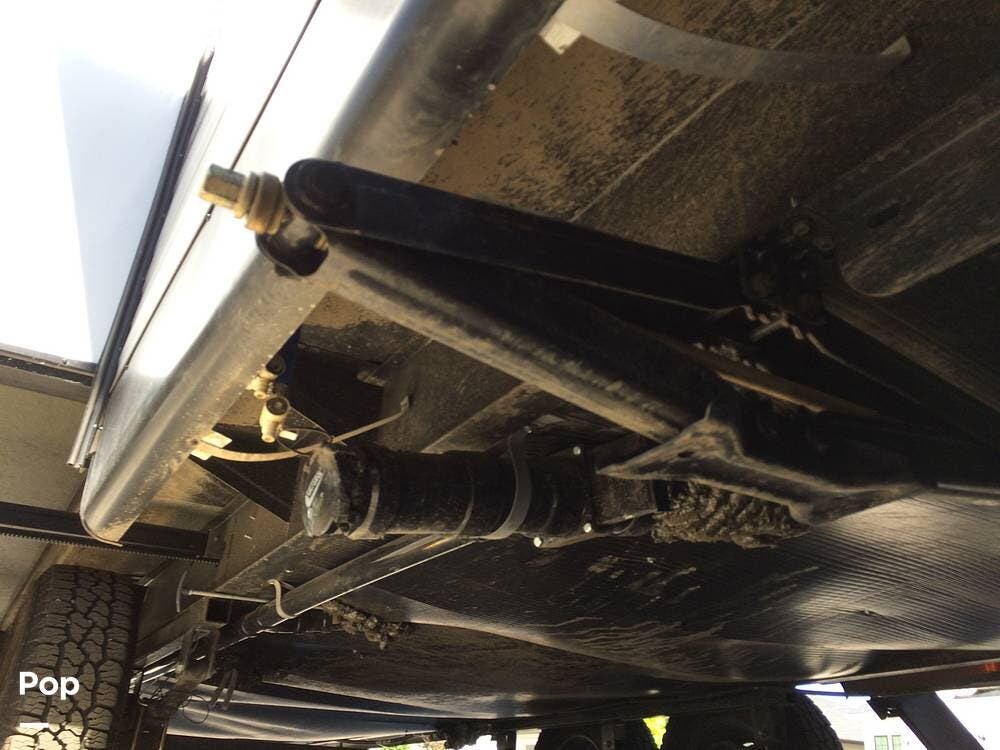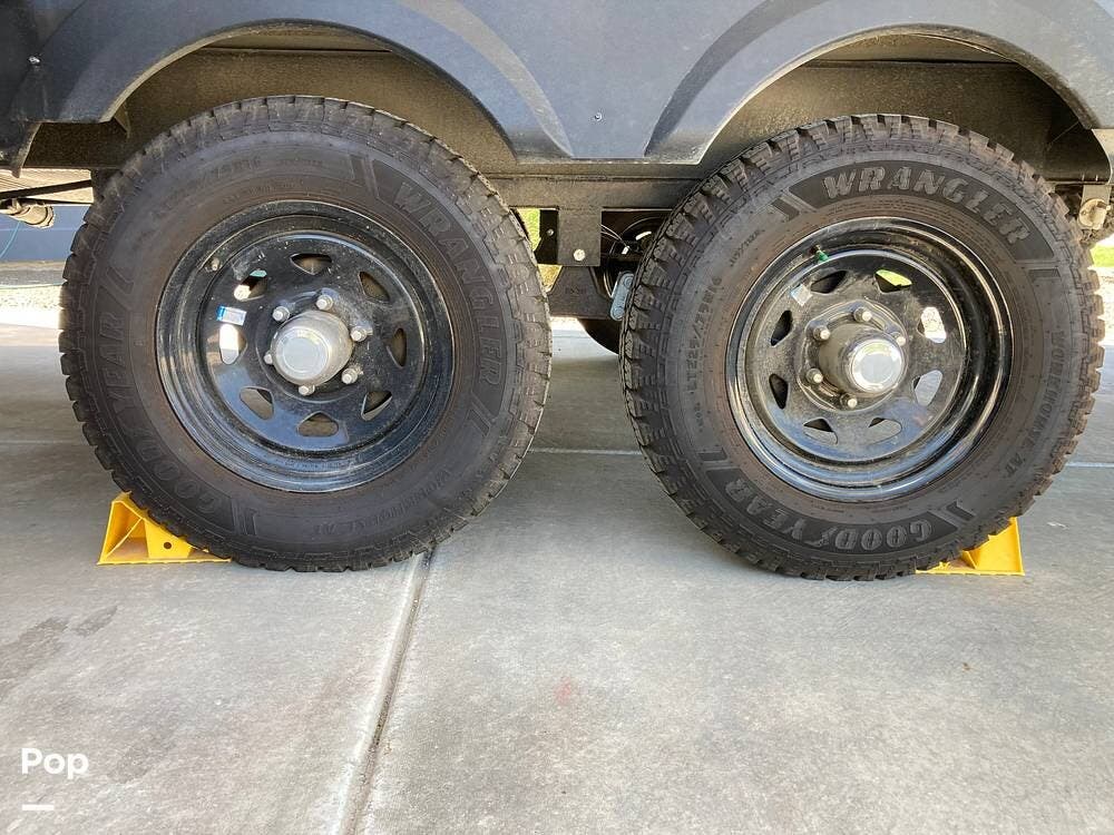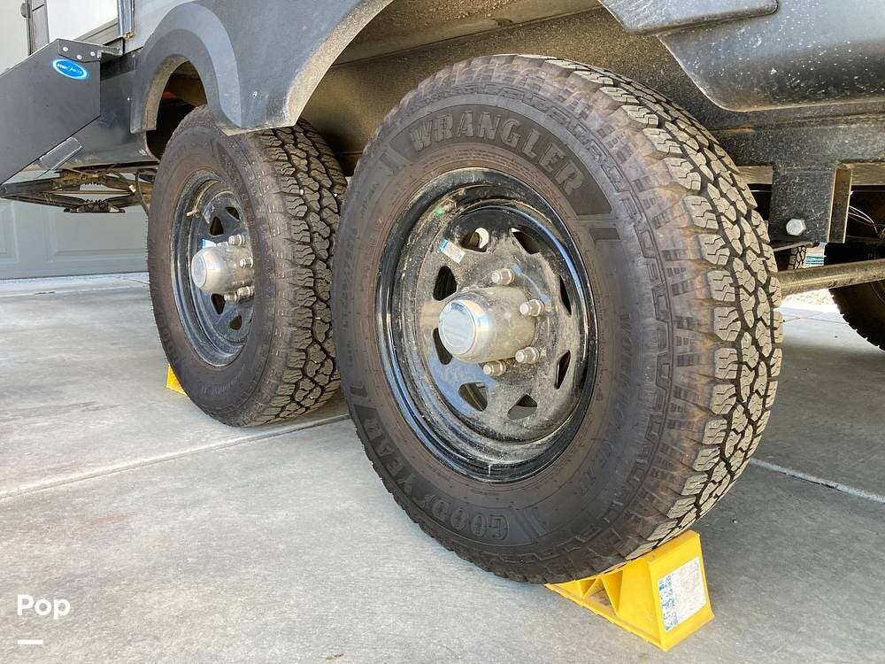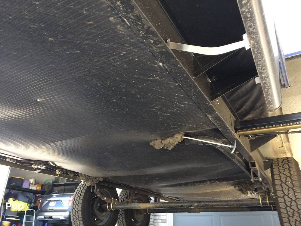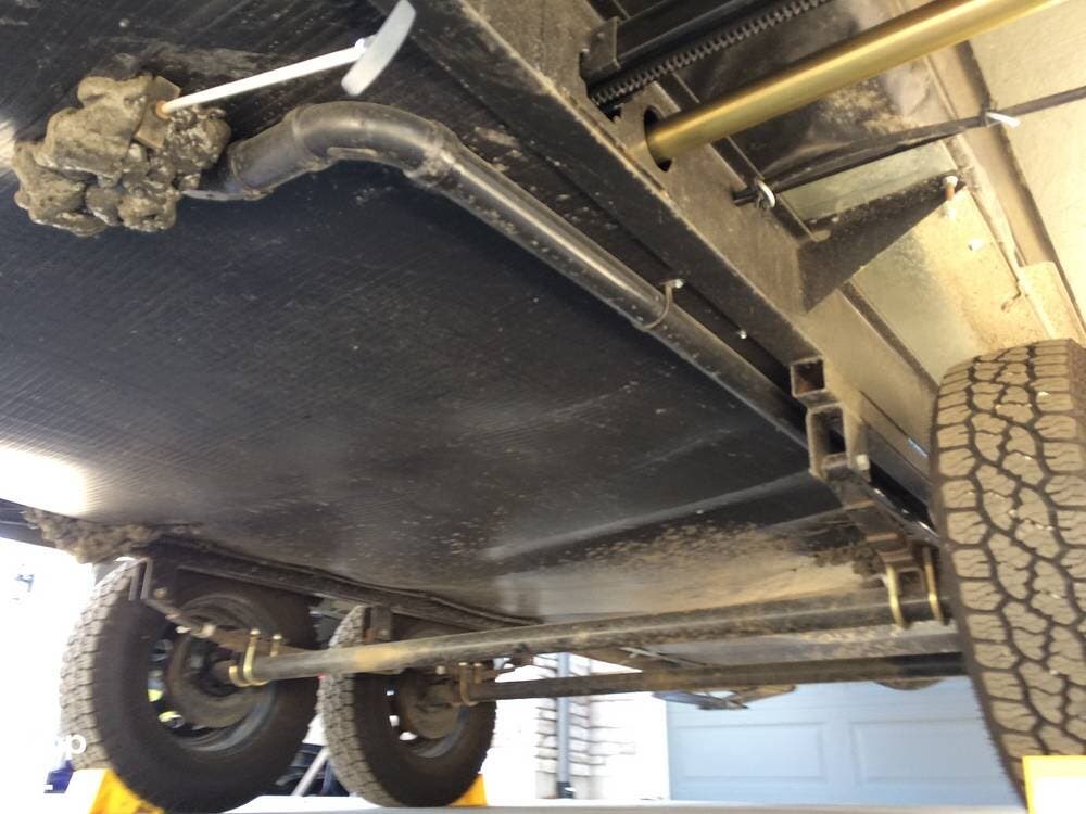 There's an electric hitch stand, Husky stabilizer bars, two house batteries, a new spare tire, and a roof access ladder.