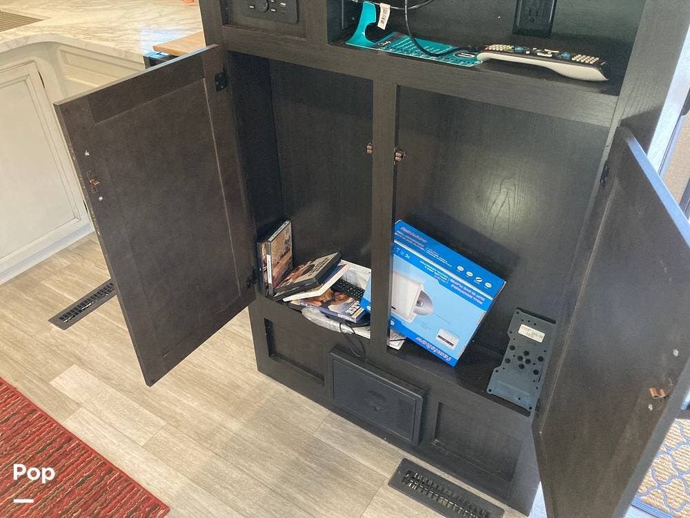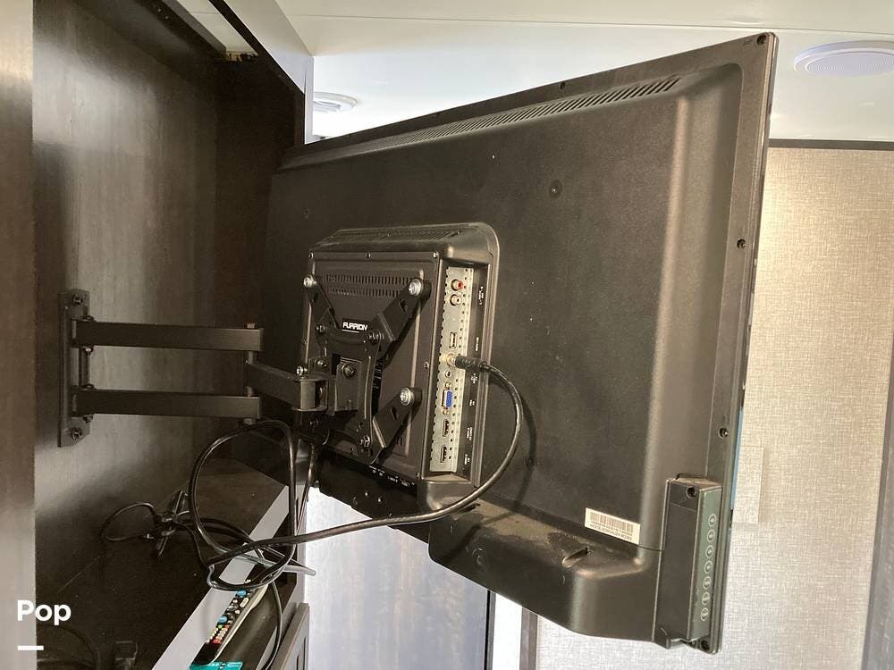The living area has a sofa sleeper, a huge swiveling HDTV, overhead storage, a large closet by the entrance door, and a stereo system.