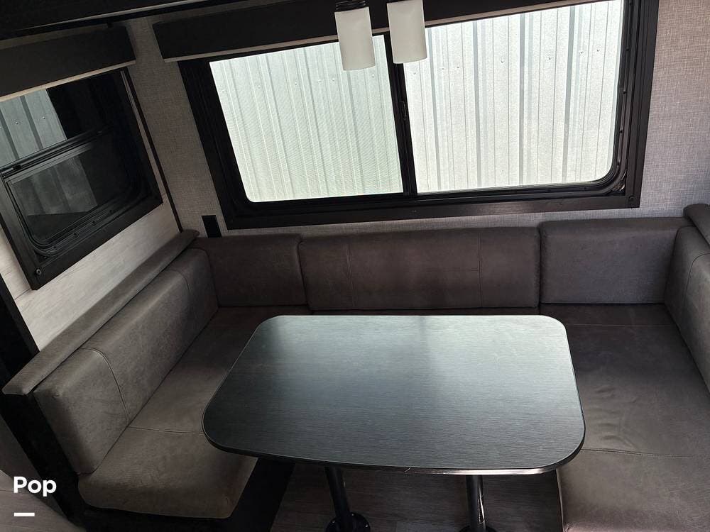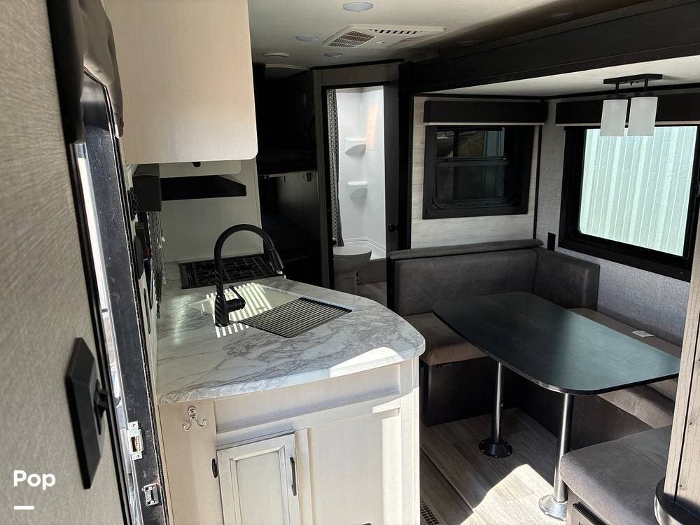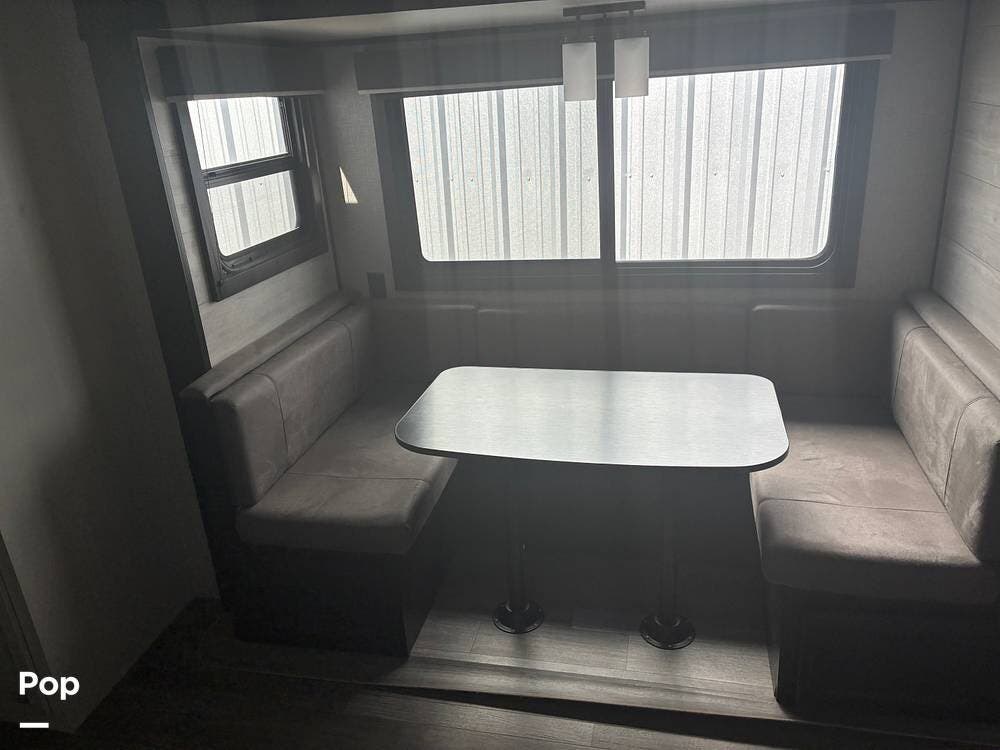 Inside, the living space feels open thanks to a large slide-out that houses the dinette and jackknife sofa. Large windows provide natural light and cross ventilation. The dinette easily converts into additional sleeping space, making the trailer capable of accommodating up to 8 people comfortably.