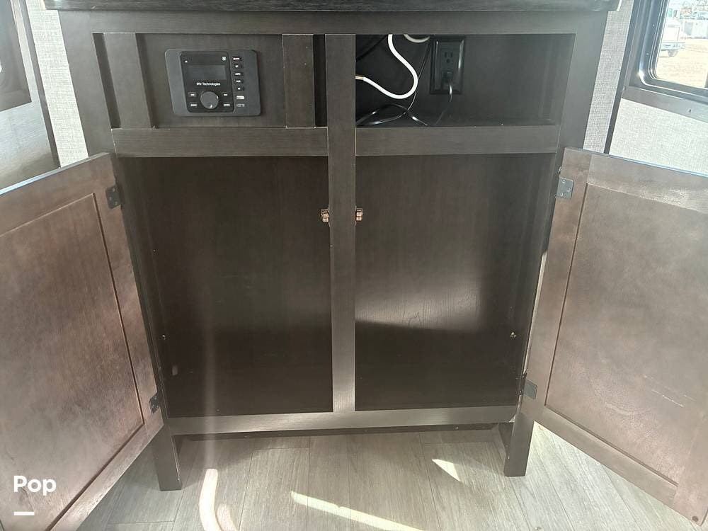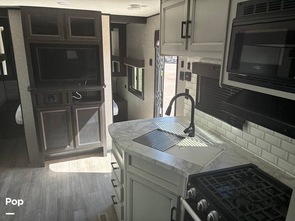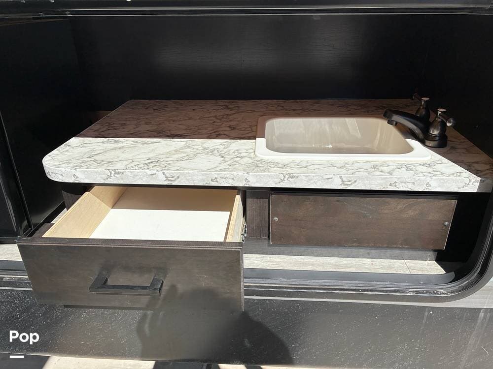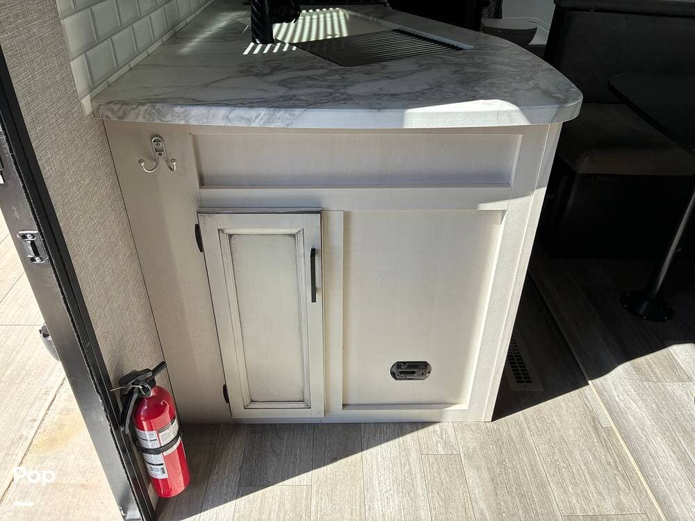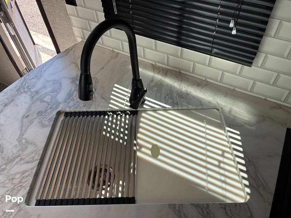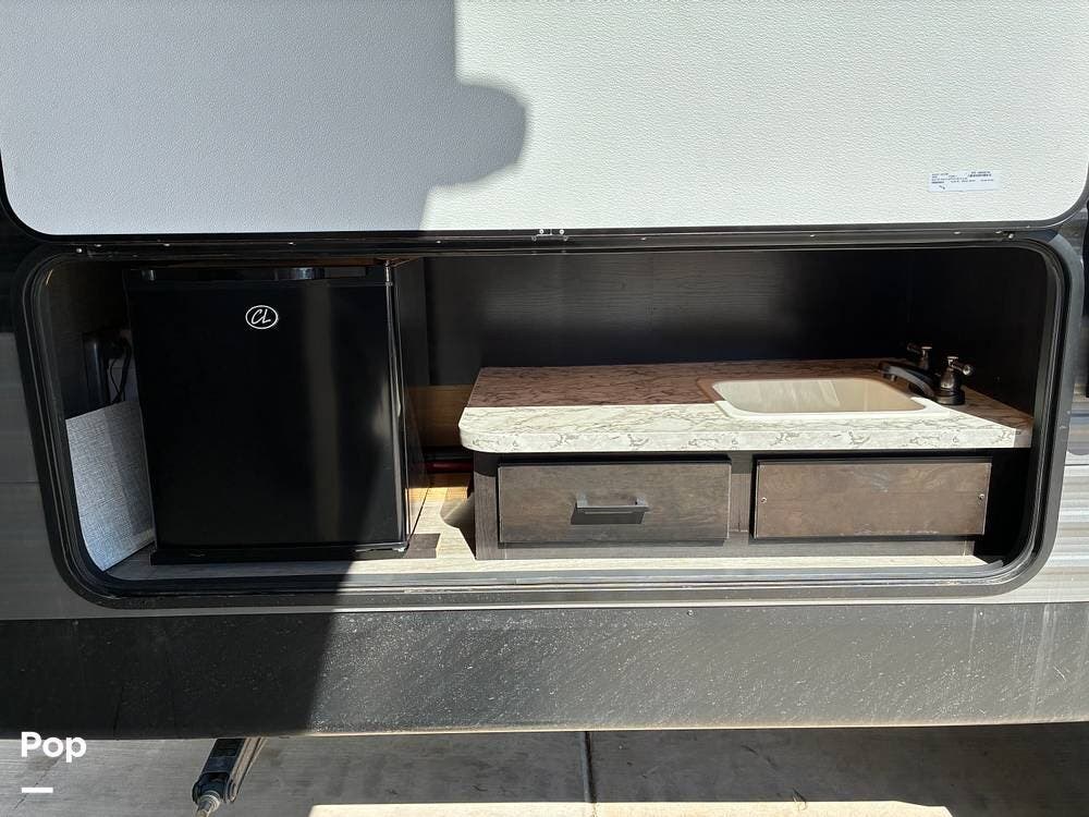 Some of the exterior features include a power awning with LED lighting, exterior marine-grade speakers, pass-through front storage, stabilizer jacks, a backup camera, and the sleek graphics and smooth fiberglass front cap, which give it a clean, modern look at the campground. Also, the RV is equipped with an exterior kitchen featuring a mini fridge, sink, and prep space -- perfect for outdoor cooking and entertaining.