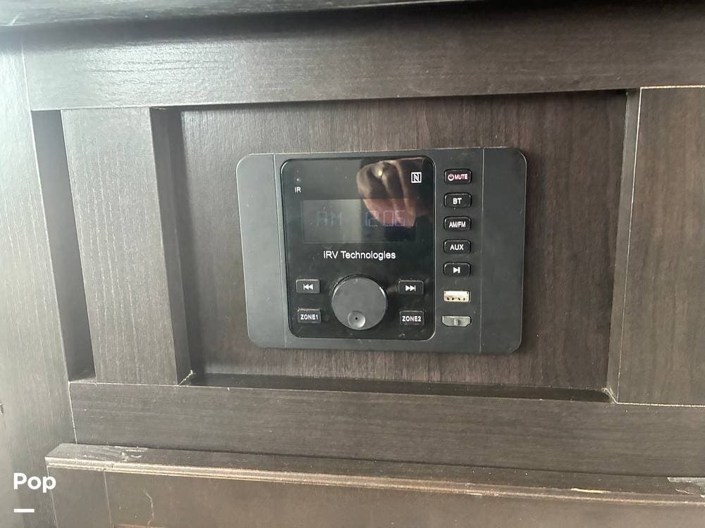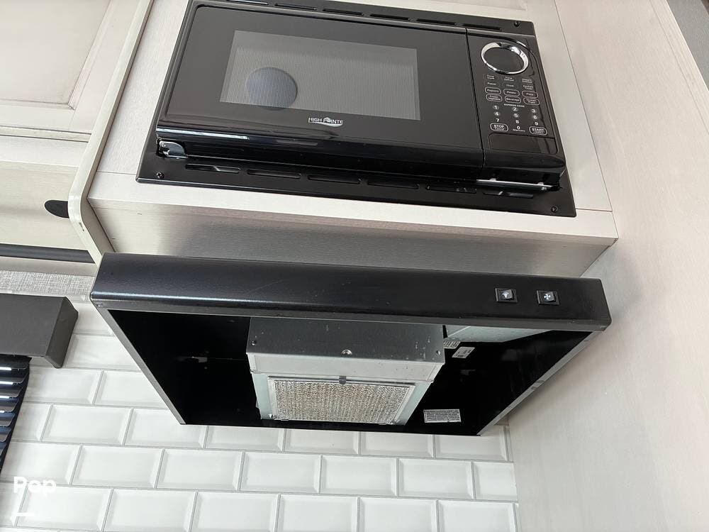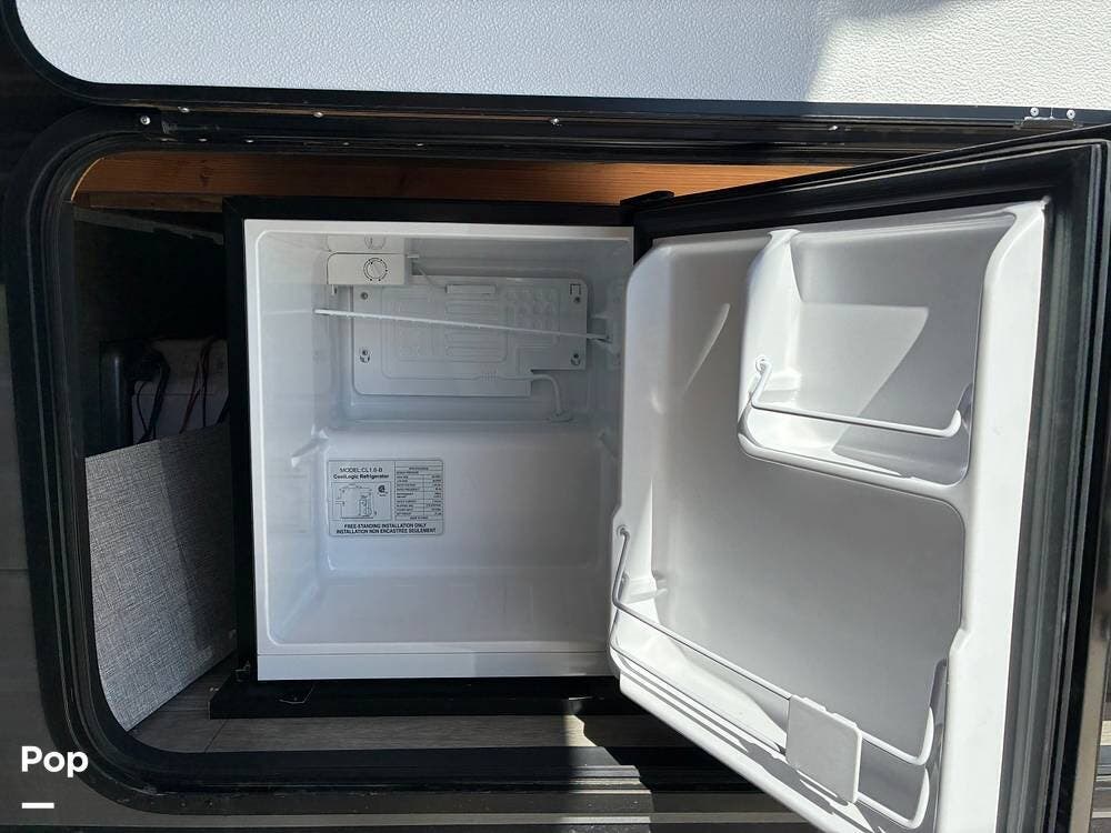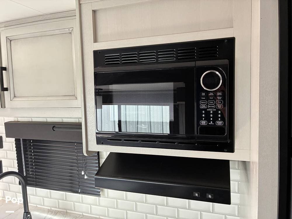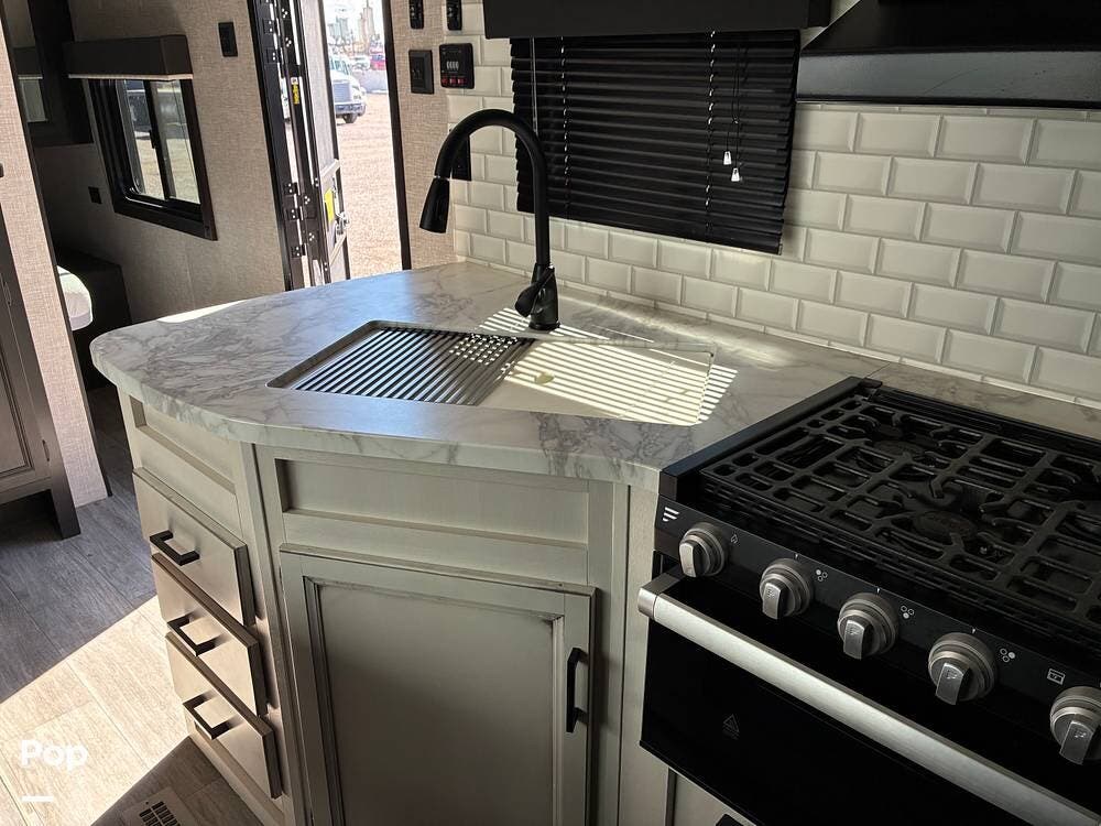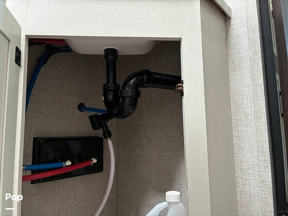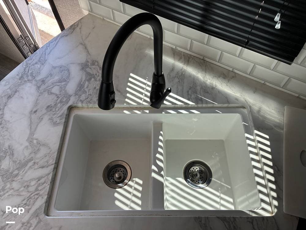 Some of the exterior features include a power awning with LED lighting, exterior marine-grade speakers, pass-through front storage, stabilizer jacks, a backup camera, and the sleek graphics and smooth fiberglass front cap, which give it a clean, modern look at the campground. Also, the RV is equipped with an exterior kitchen featuring a mini fridge, sink, and prep space -- perfect for outdoor cooking and entertaining.