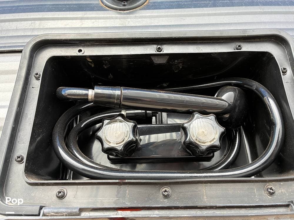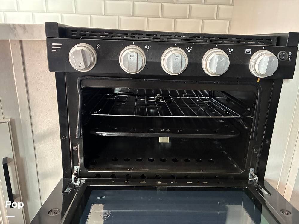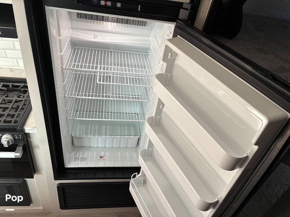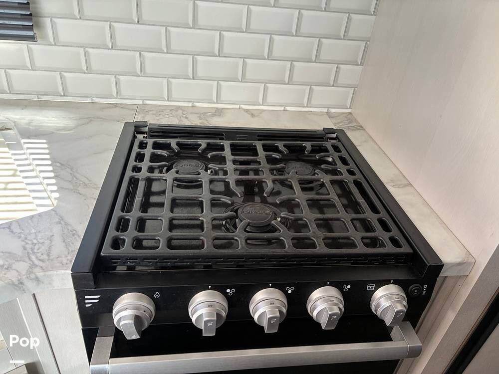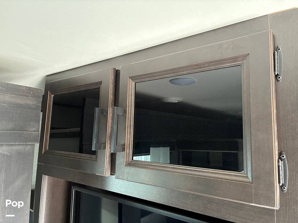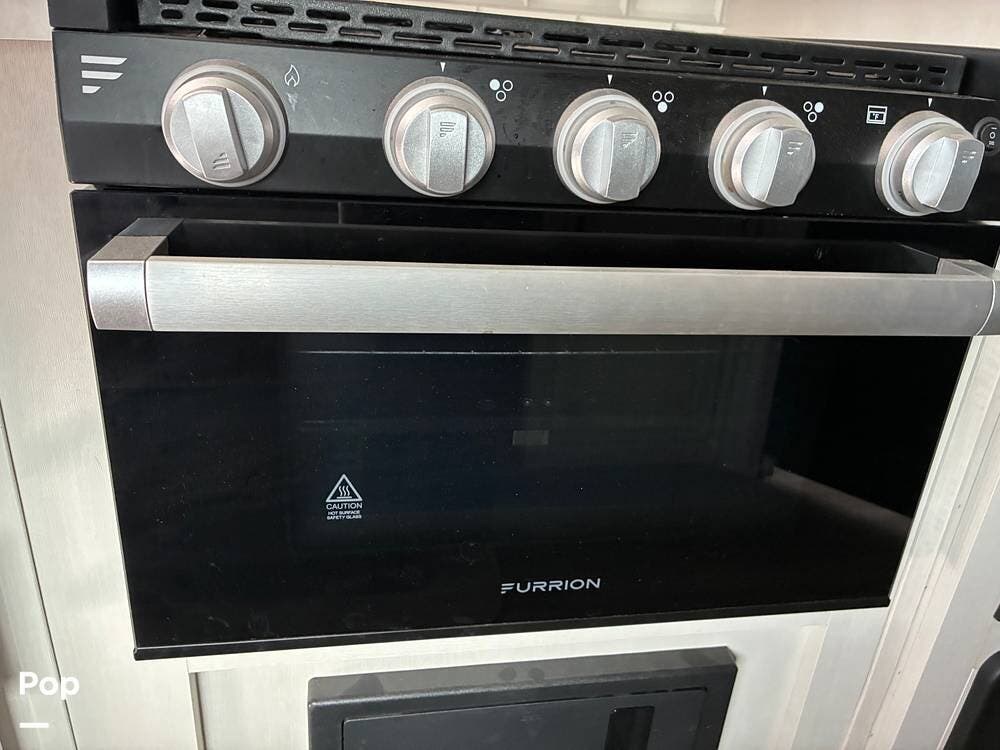 Some of the exterior features include a power awning with LED lighting, exterior marine-grade speakers, pass-through front storage, stabilizer jacks, a backup camera, and the sleek graphics and smooth fiberglass front cap, which give it a clean, modern look at the campground. Also, the RV is equipped with an exterior kitchen featuring a mini fridge, sink, and prep space -- perfect for outdoor cooking and entertaining.