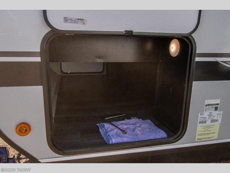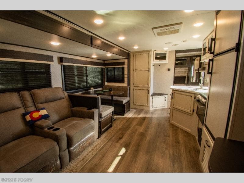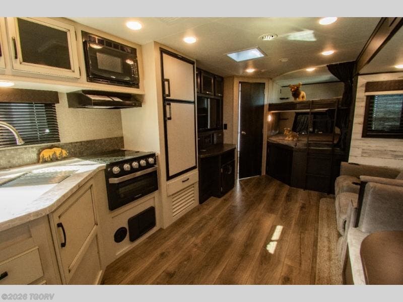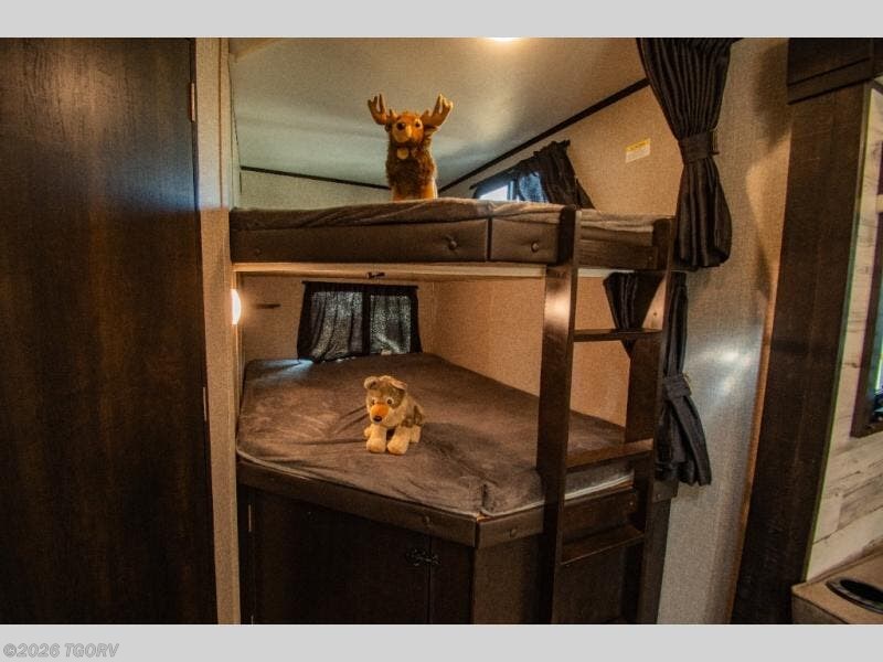 Your kiddos will love camping in this travel trailer with their own set of double size bunk beds with a ladder for their safety and a privacy curtain, plus they are conveniently next to the rear corner bathroom to make late night trips to the bathroom even easier. After you have cooked your delicious meal at either the indoor kitchen using the Furrion range, or the outdoor kitchen, you can head to the booth dinette to enjoy eating it comfortably. When you're ready to wind down, head into the front private bedroom where you will find a walk-around queen bed ready to give you a good night's rest!