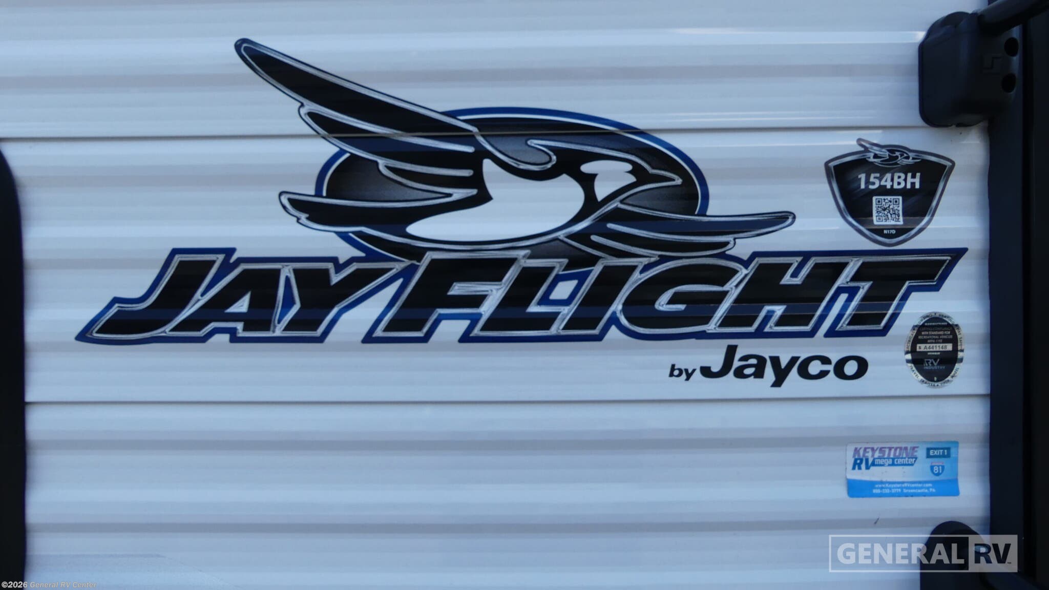 Jayco Jay Flight SLX 7 travel trailer 154BH highlights: Bunk Beds Private Bathroom Booth Dinette 10' Power Awning You can spend more time enjoying your surroundings and less time hassling with your RV when you take this Jay Flight SLX 7 travel trailer out to the campsite! There is a set of 29" x 75" bunk beds that will allow you to sleep two people without taking up extra floor space, and the booth dinette can transition from a table into a bed in order to accommodate one other person. The private bathroom includes a tub/shower and toilet so that you don't even need to use the campsite's facilities. A 3-cubic foot refrigerator will store all of your fresh items, and the two-burner range will help you turn those items into a full meal. As soon as you enter this trailer, there is a wardrobe to your left, so you can keep some belongings easily accessible. The Jayco Jay Flight SLX 7 travel trailer is quite easy to own because it weighs less than 3,500 pounds, and it comes with a single axle. Built on a fully integrated A-frame with galvanized-steel, impact-resistant wheel wells, the Jay Flight SLX 7 has quality at its very foundation. That quality continues on to the electric self-adjusting brakes, easy-lube hubs, Magnum Truss roof system, friction-hinge entry door with window, and LP quick connect. Some of what the mandatory Customer Value Package includes are two stabilizer jacks with sand pads, American-made Goodyear Endurance tires, Keyed-Alike entry and baggage doors, and JaySMART LED lighting.