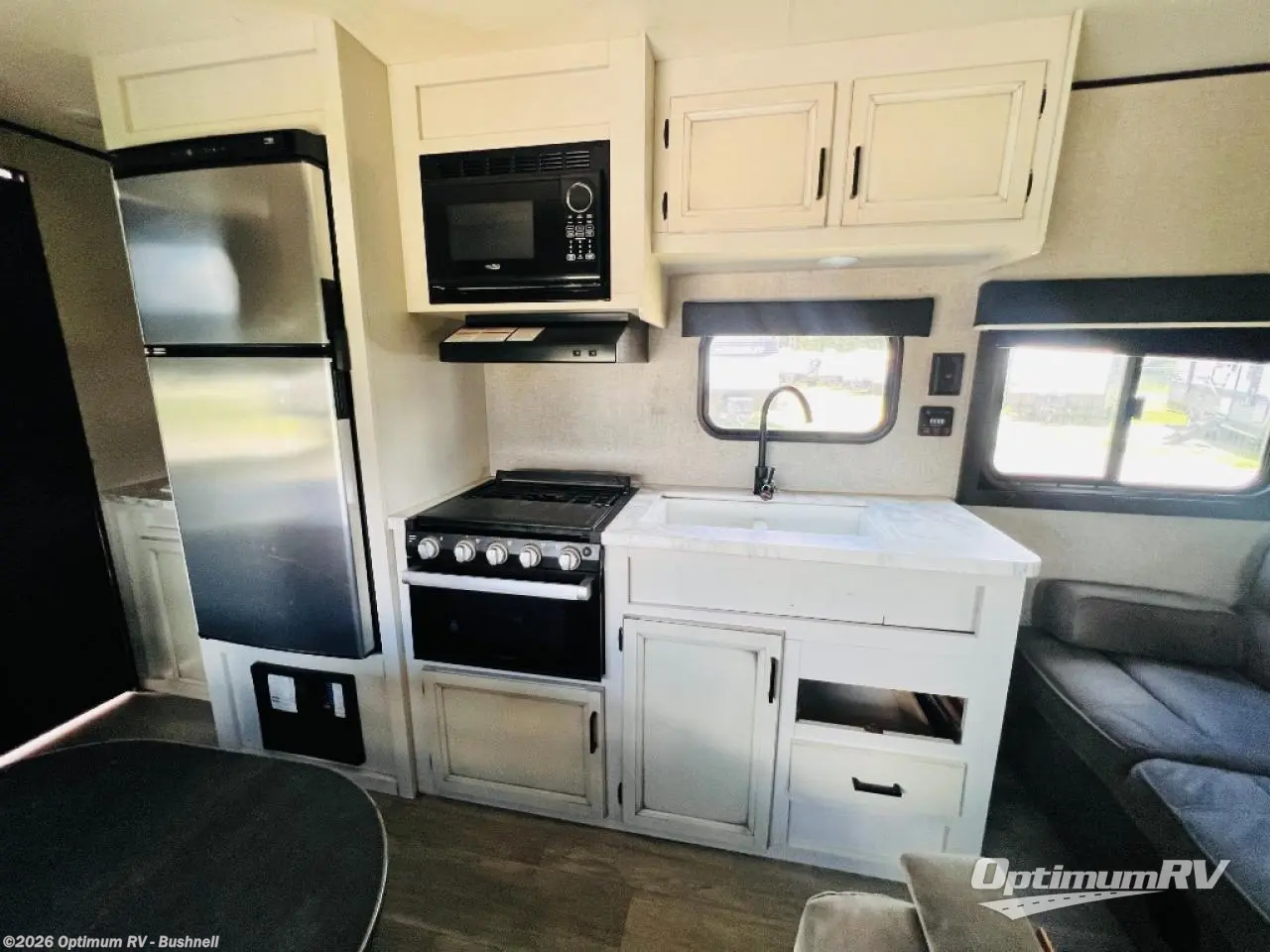This easy to setup trailer offers a semi-private bedroom up front with a queen bed, semi-private double size bunks in the rear thanks to the curtains, and a private toilet and tub/shower room. The bathroom sink is just outside the door allowing two people to get ready for bed at once. The galley kitchen offers full amenities, and two can dine at the booth dinette and some can relax on the jack-knife sofa. Both furnishings offer extra sleeping space. And you might like to add the Chil N' Stor option which adds a fridge and counter space along the exterior to serve meals outside and store extra beverages.