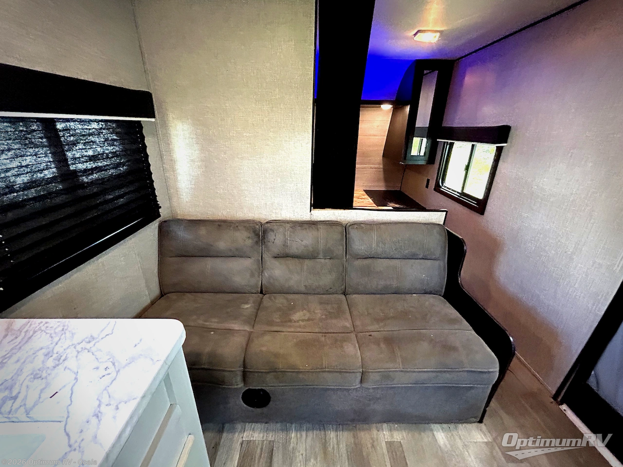 This easy to setup trailer offers a semi-private bedroom up front with a queen bed, semi-private double size bunks in the rear thanks to the curtains, and a private toilet and tub/shower room. The bathroom sink is just outside the door allowing two people to get ready for bed at once. The galley kitchen offers full amenities, and two can dine at the booth dinette and some can relax on the jack-knife sofa. Both furnishings offer extra sleeping space. And you might like to add the Chil N' Stor option which adds a fridge and counter space along the exterior to serve meals outside and store extra beverages.