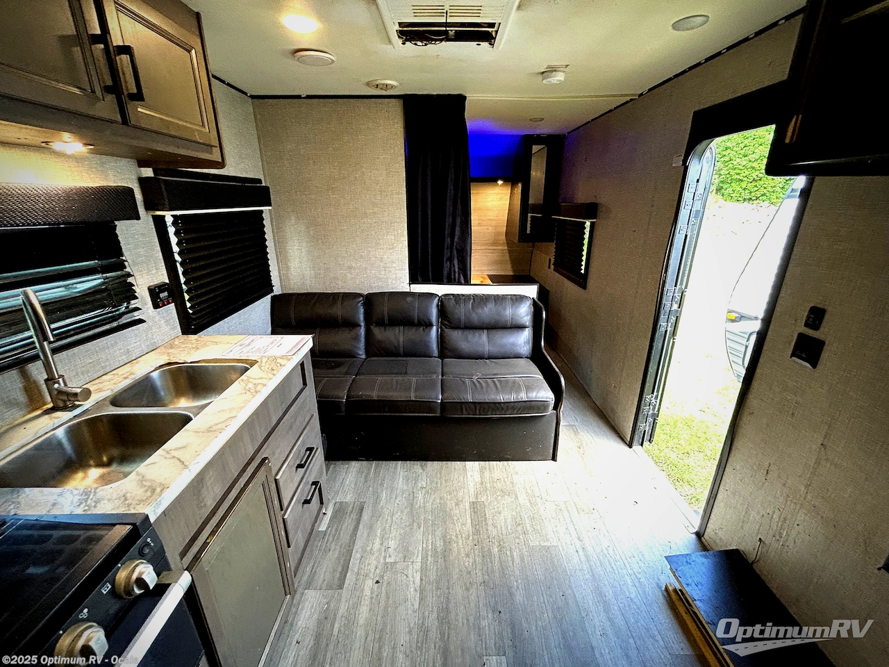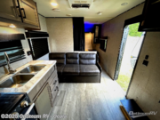 This easy to setup trailer offers a semi-private bedroom up front with a queen bed, semi-private double size bunks in the rear thanks to the curtains, and a private toilet and tub/shower room. The bathroom sink is just outside the door allowing two people to get ready for bed at once. The galley kitchen offers full amenities, and two can dine at the booth dinette and some can relax on the jack-knife sofa. Both furnishings offer extra sleeping space. And you might like to add the Chil N' Stor option which adds a fridge and counter space along the exterior to serve meals outside and store extra beverages.