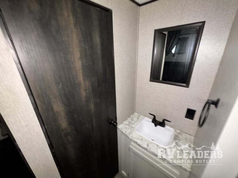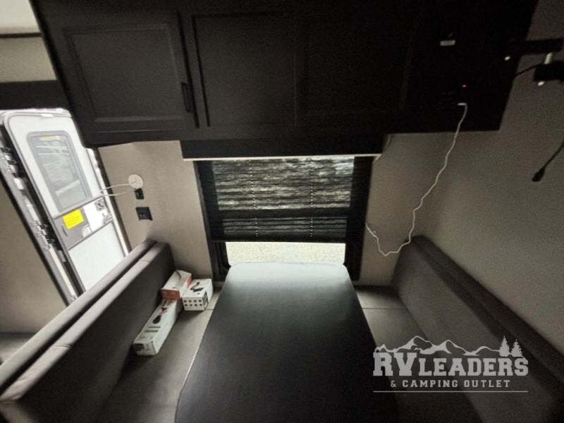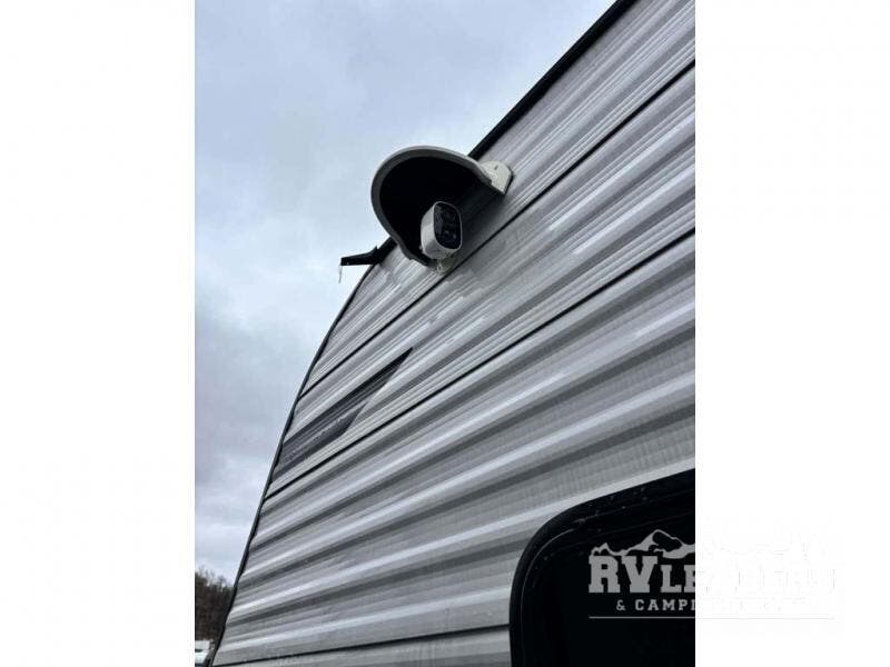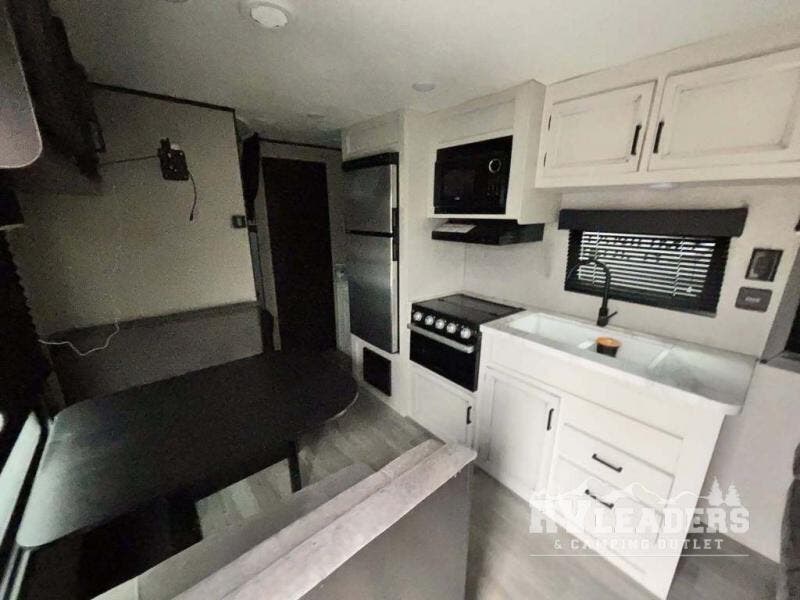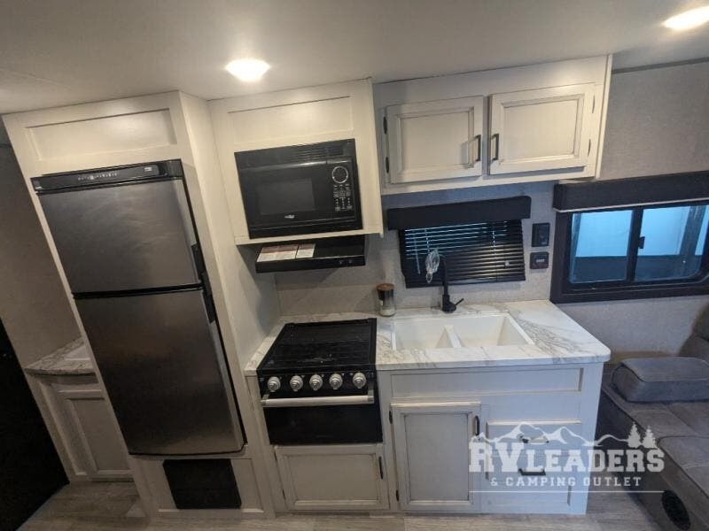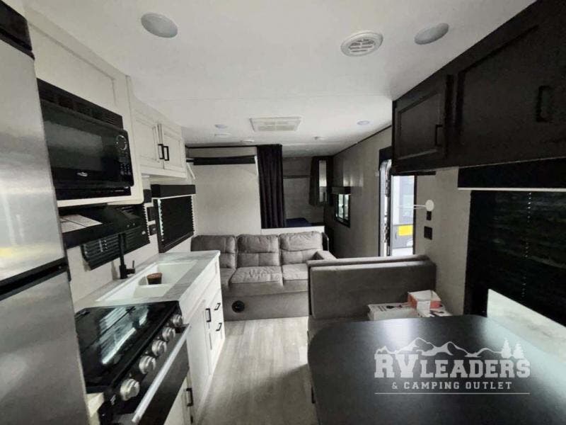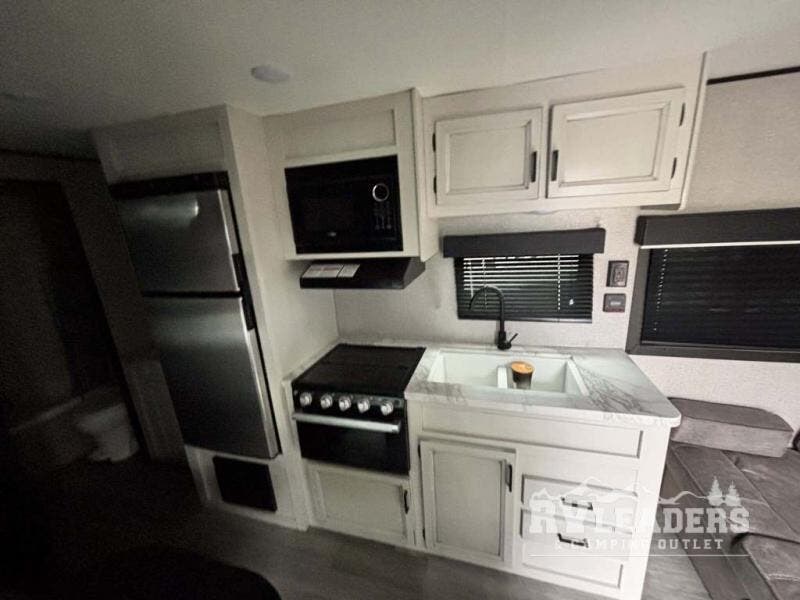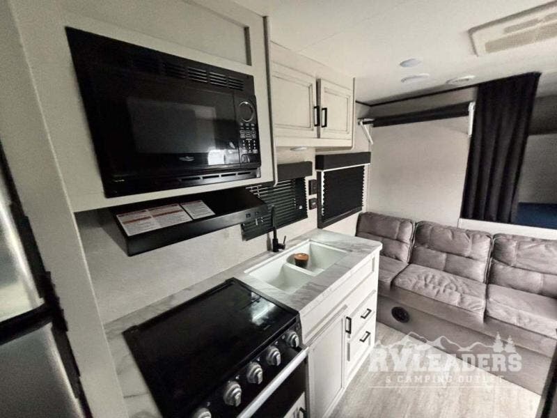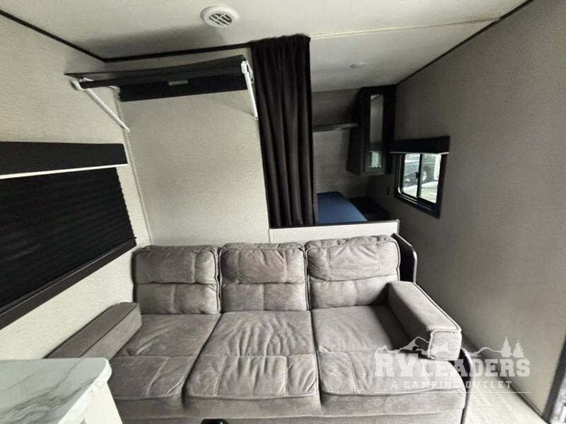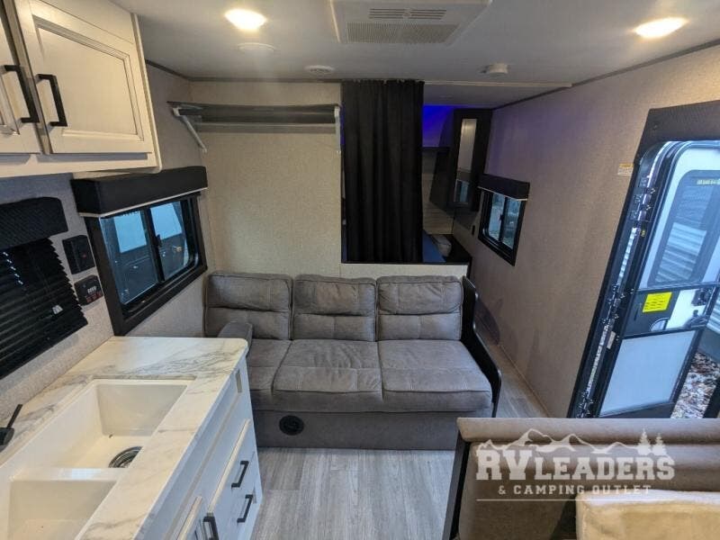 This easy to setup trailer offers a semi-private bedroom up front with a queen bed, semi-private double size bunks in the rear thanks to the curtains, and a private toilet and tub/shower room. The bathroom sink is just outside the door allowing two people to get ready for bed at once. The galley kitchen offers full amenities, and two can dine at the booth dinette and some can relax on the jack-knife sofa. Both furnishings offer extra sleeping space. And you might like to add the Chil N' Stor option which adds a fridge and counter space along the exterior to serve meals outside and store extra beverages.