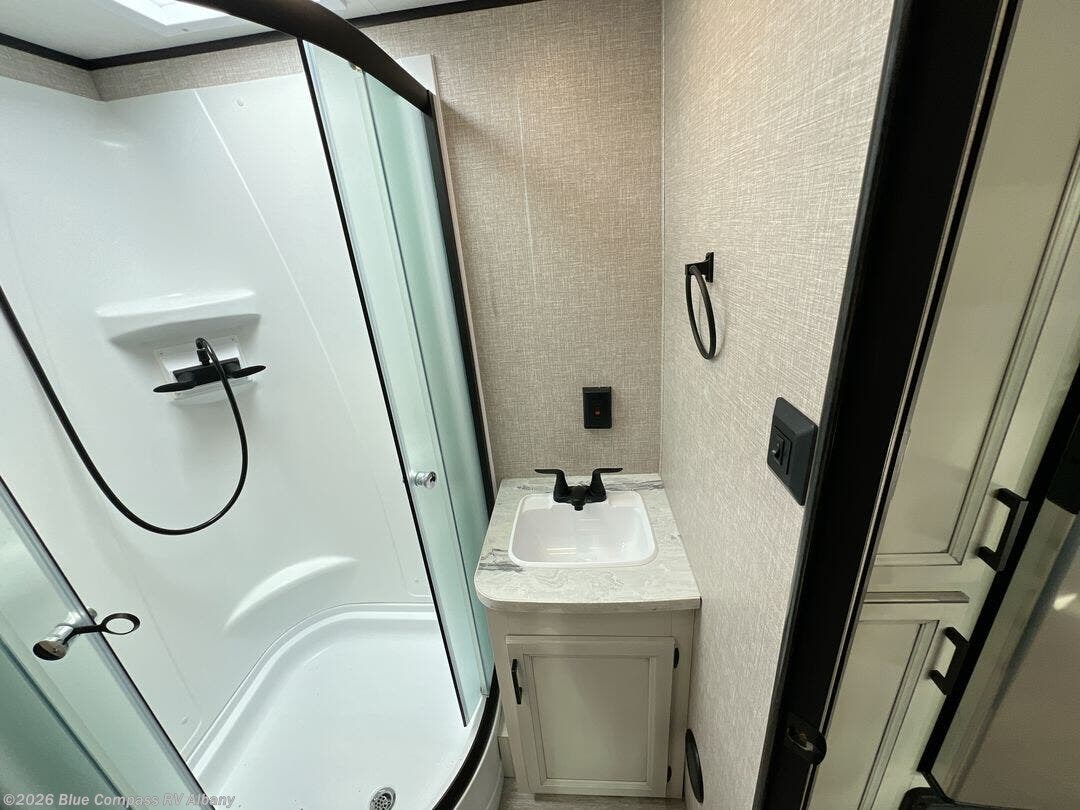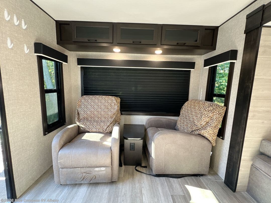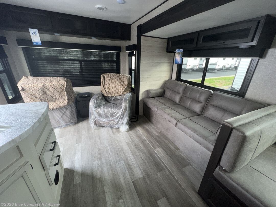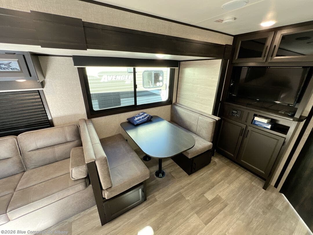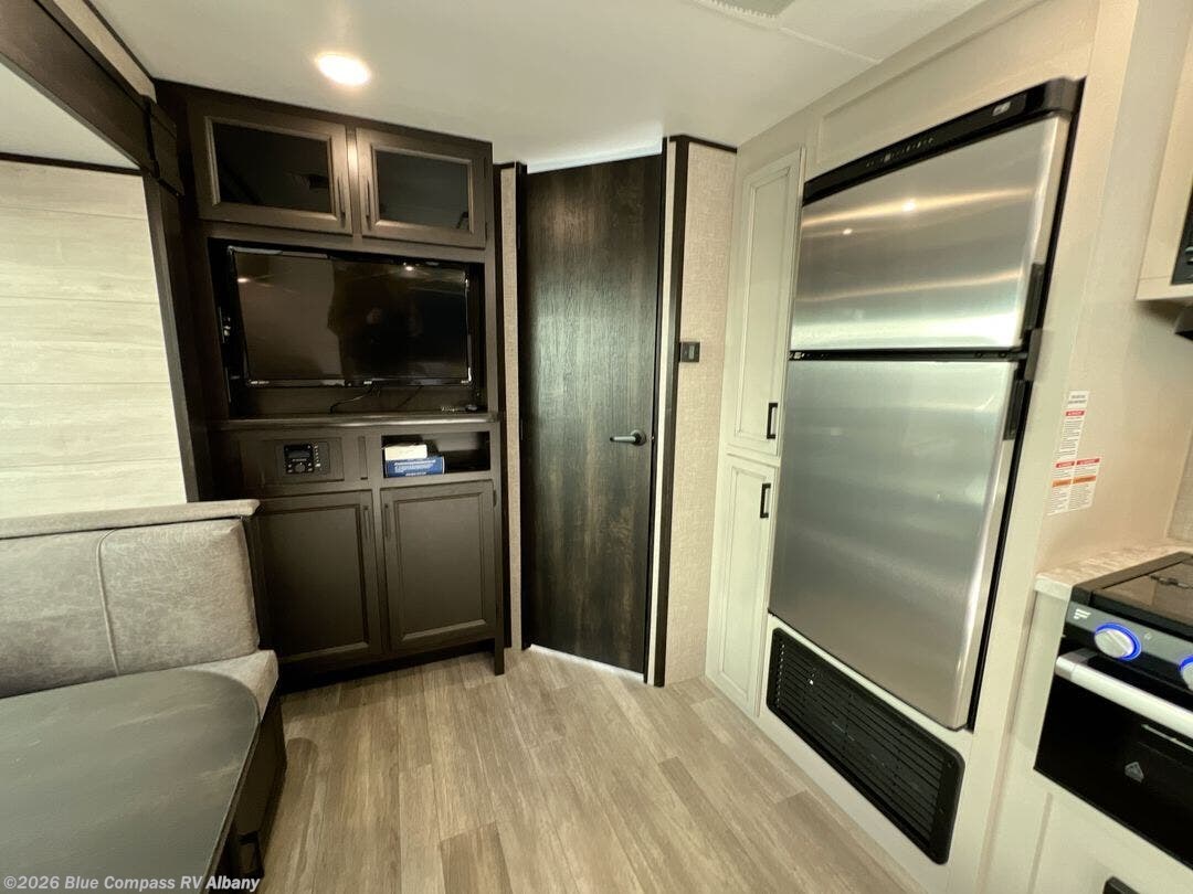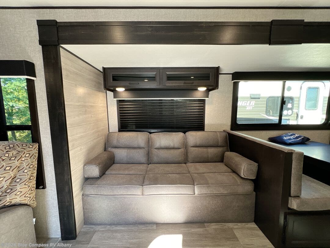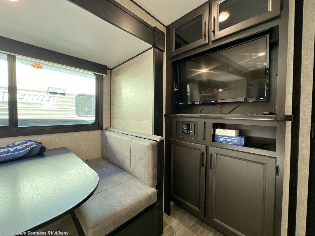 When you want to travel and see new places, this trailer gives you the flexibility to sleep two to four, plus offers a full walk-through bathroom with access from the main area and the front private bedroom. You will also appreciate having a second entry/exit door in the bedroom, a walk-around queen bed, plus dual wardrobes giving you your own side of the bed. The bathroom also has a radius shower and linen storage. The kitchen includes full amenities to make your own meals, and a pantry to keep your dry goods and snacks. You will love the rear swivel rockers with table in between to place your drinks, and the jack-knife sofa plus booth dinette offer more seating, sleeping space, and extra floor space since they are within a slide.
