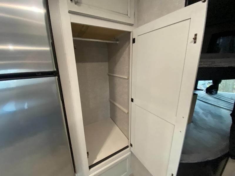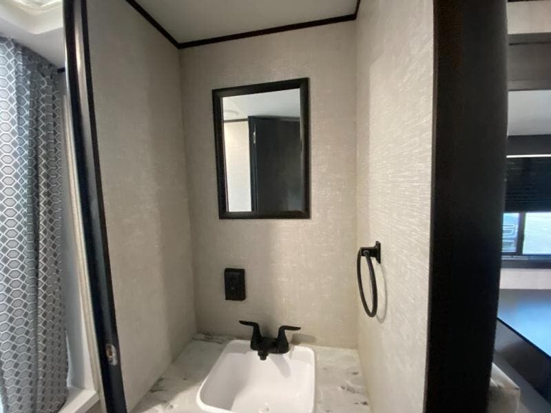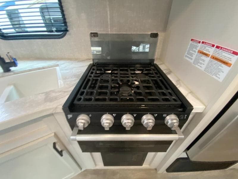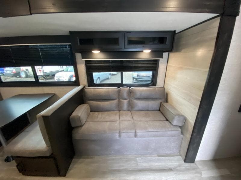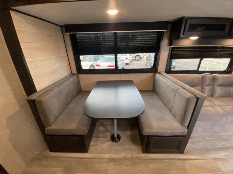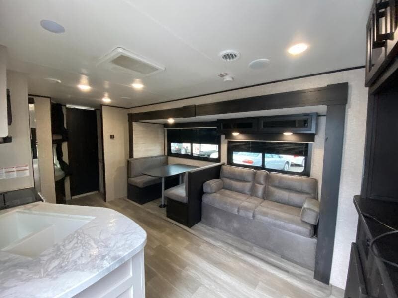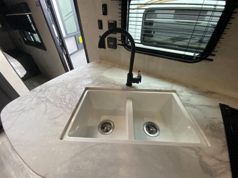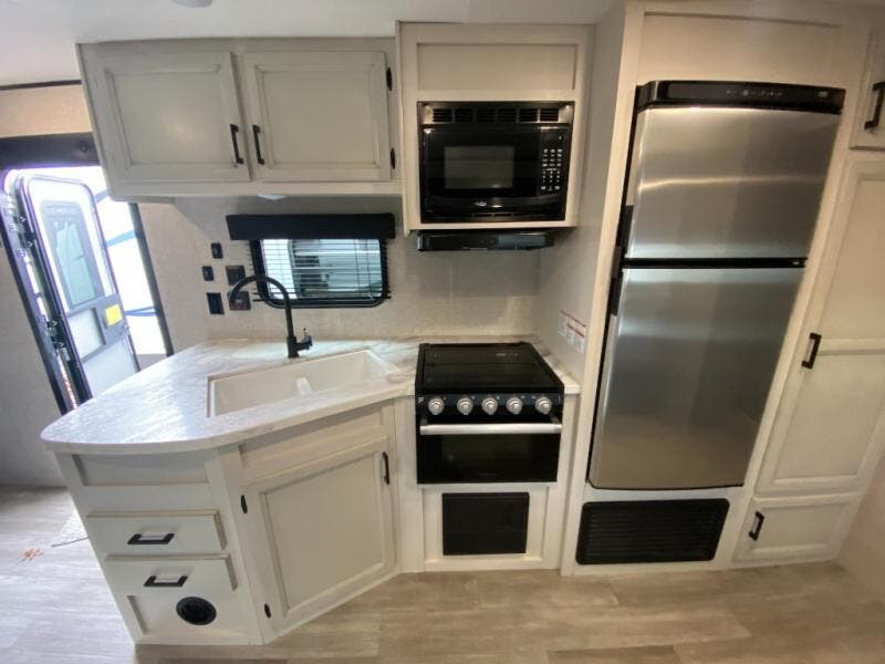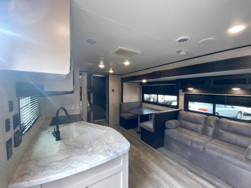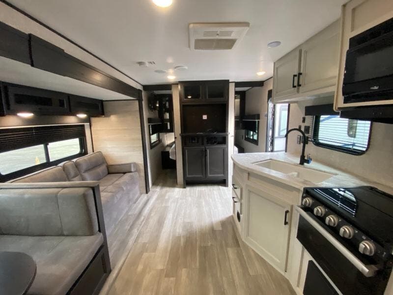 A larger family or group of friends can enjoy camping together in this trailer thanks to the booth dinette and jack-knife sofa slide providing more interior floor space and a place for two or maybe more to sleep at night. And the double size bunks are a fun place to sleep when you need four more spots, plus the privacy curtain will come in handy. The private toilet and tub/shower will keep everyone refreshed and the bathroom sink is just outside the door allowing two people to get ready at one time. The front bedroom offers the owners privacy and there is dual access, two wardrobes and a queen bed to enjoy. The cook will find full amenities indoor, plus there is an outside kitchen to make more meals.
