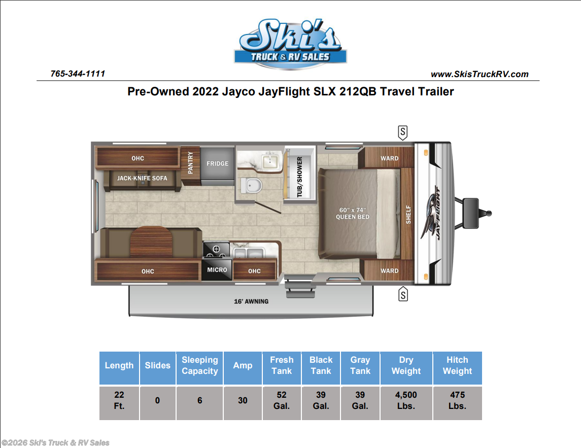 Pre-Owned 2022 Jayco Jay Flight SLX 212QB Travel Trailer; 22 Foot; Non Slide; Sleeps 6; Hitch Weight: 475 Lbs.; Dry Weight: 4,500 Lbs.; 30 Amp; Power Tongue Jacks; Manual Stabilizer Jacks; 52 Gal. Fresh Water Cap.; 39 Gal. Black Water Cap.; 39 Gal. Gray Water Cap.; Two 20 Lbs. Propane Tanks; Outside Propane Port; 13,500 BTU AC; 20,000 BTU Furnace; 6 C.F. Gas/Elec. Refrigerator; 6 Gal. Gas/Elec. Water Heater; Microwave; 3-Burner Stove/Oven; Two TV Jacks; AM/FM; Speakers; Pantry; Booth Dinette; Stainless Steel Sink; Jack-knife Sofa; Queen Bed; One Bathroom with Tub/Shower; 16 Foot Power Awning with LED Lights; Backup Camera Prep.; Outside Shower; Exterior Storage; Foldup Steps; Grab Handle; Black Tank Flush; Magnetic Door Latch; Climate Package; Tinted Windows; Pleated Shades; Goodyear Tires; Spare Tire; Financing Available; Very Clean Pre-Owned Travel Trailer for the Price: $13,495. Call 765-344-1111 or visit us online at for more information and photos.