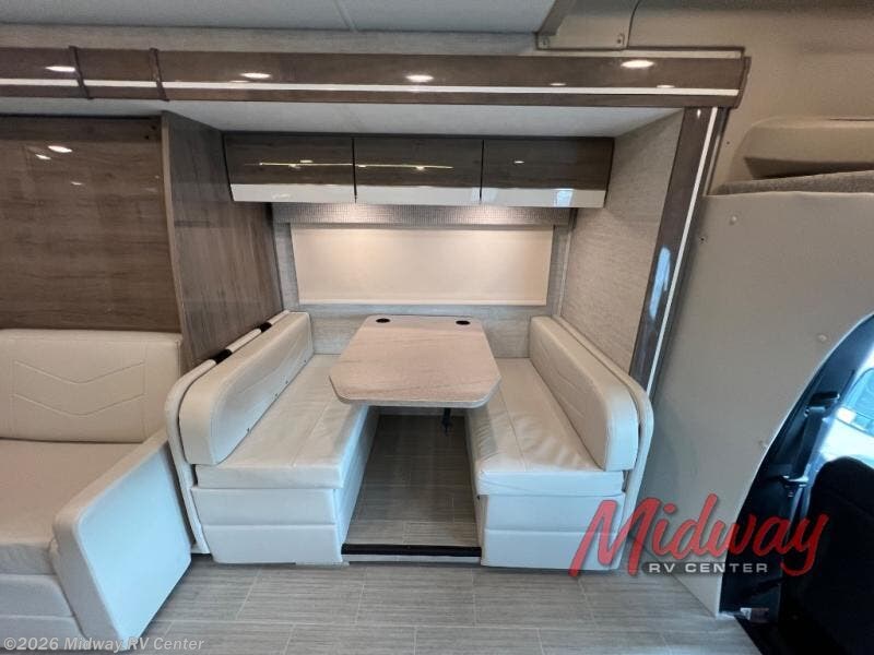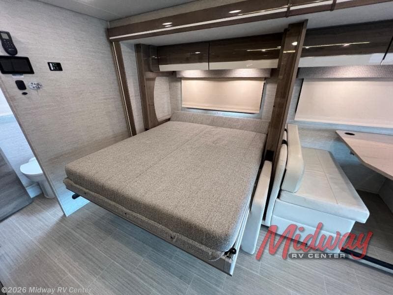 Each Melbourne Class C diesel motorhome by Jayco features durable Stronghold VBL lamination, bead-foam insulation, and a seamless front cap that resists wear and tear from the elements. There are seatbelts in all designated seating locations, and the captain's seats swivel around so they can become a part of the living area once parked. You'll appreciate an Onan 3,600-watt LP generator on board, as well as a 13,500 BTU A/C and a 30,000 BTU furnace to keep you comfortable year around. The interior of the Melbourne will have you feeling right at home with high-intensity LED lights, an 83" interior height with a padded vinyl ceiling, hardwood cabinet doors and drawers, and more!
