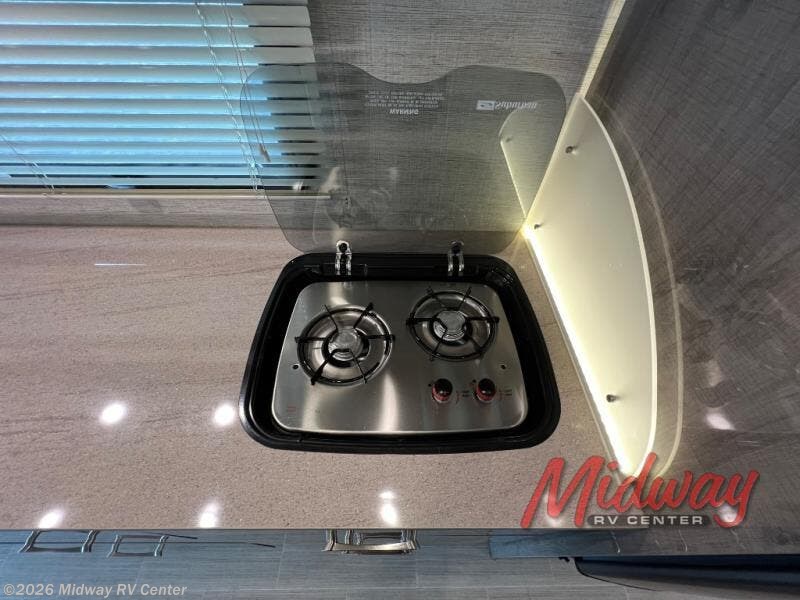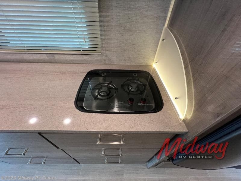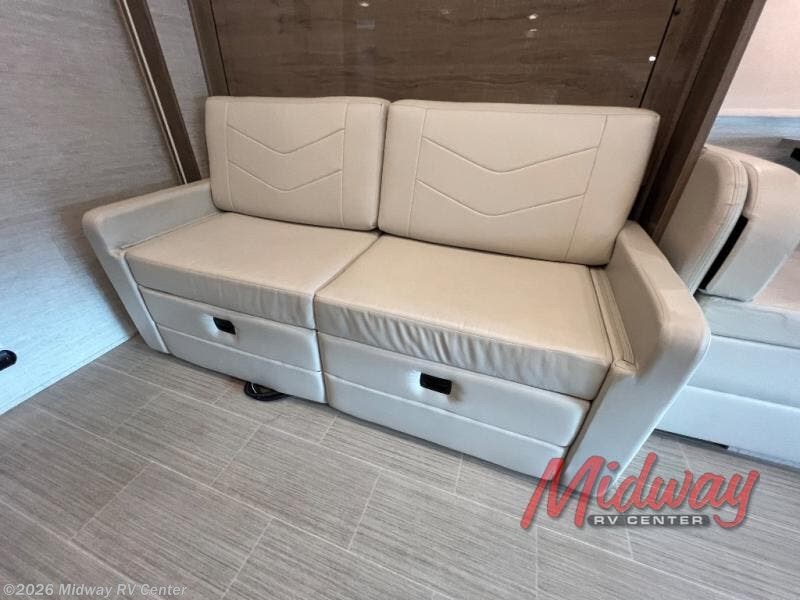 Pack up and head to the antique show for the weekend in this versatile coach. There is a sofa within the full-wall slide that includes a queen Murphy bed to sleep on a night, and if you have any friends tag along they can sleep on the booth dinette or cab-over bunk. The full rear bath includes a 24" x 32" shower, a stainless steel sink, plus a large bath wardrobe to store clean towels and toiletries. Head to the kitchen to prepare lunch on the Suburban two burner drop-in cooktop, and you'll appreciate the large pantry for dry goods and snacks. You can choose the optional theater seating in place of the booth dinette, or the optional front entertainment center in place of the cab-over bunk if you're not needing the additional sleeping space.