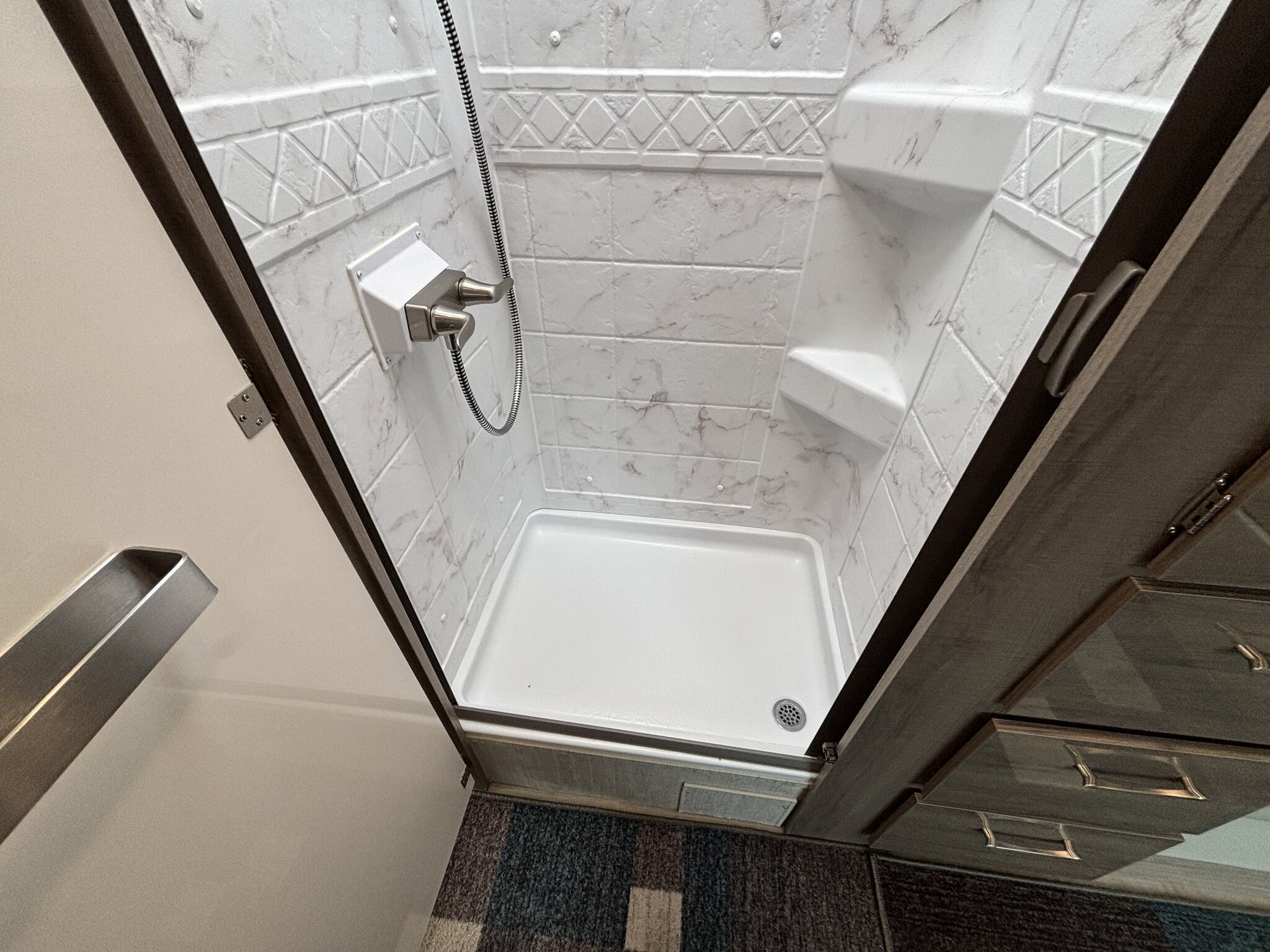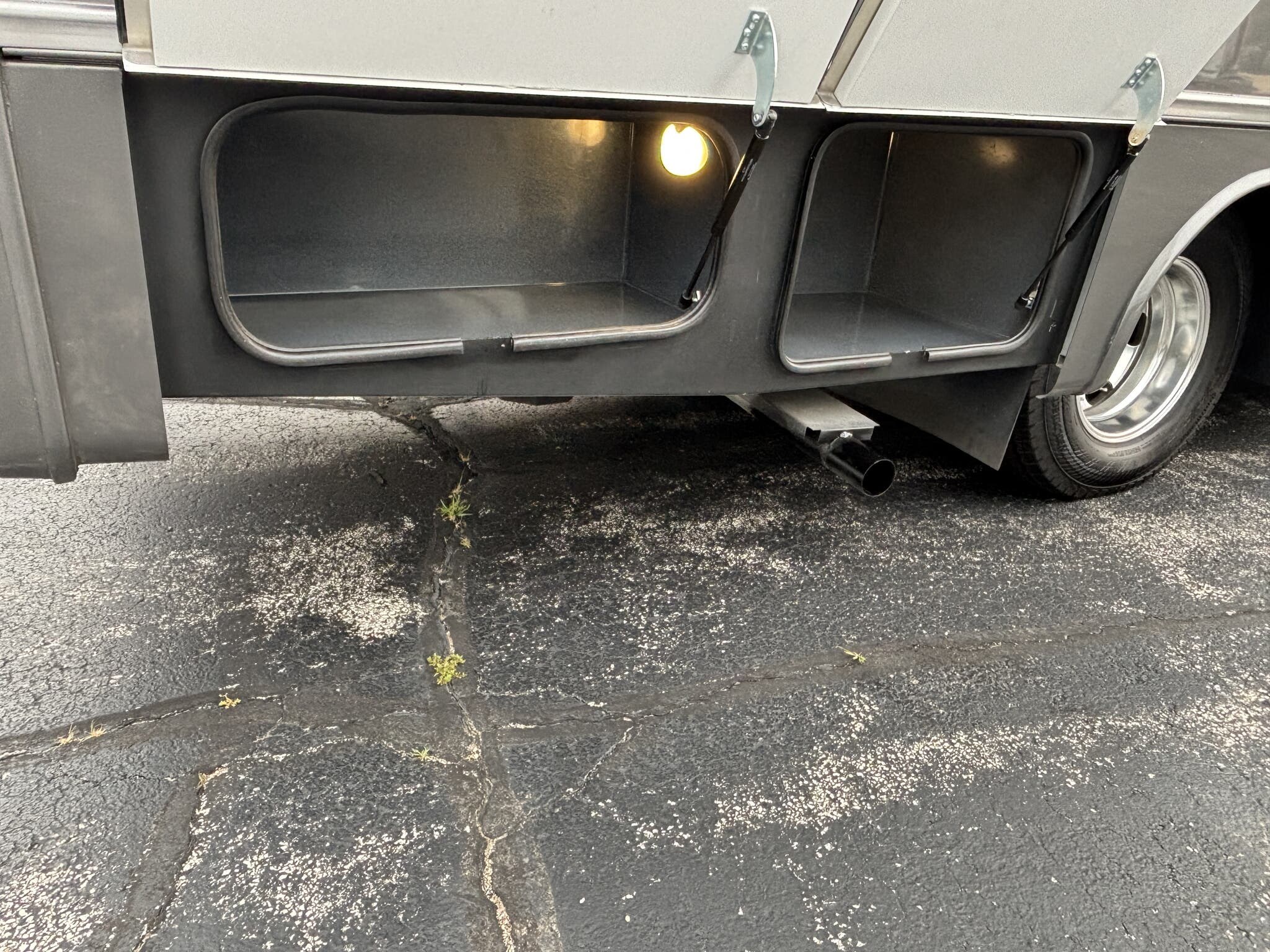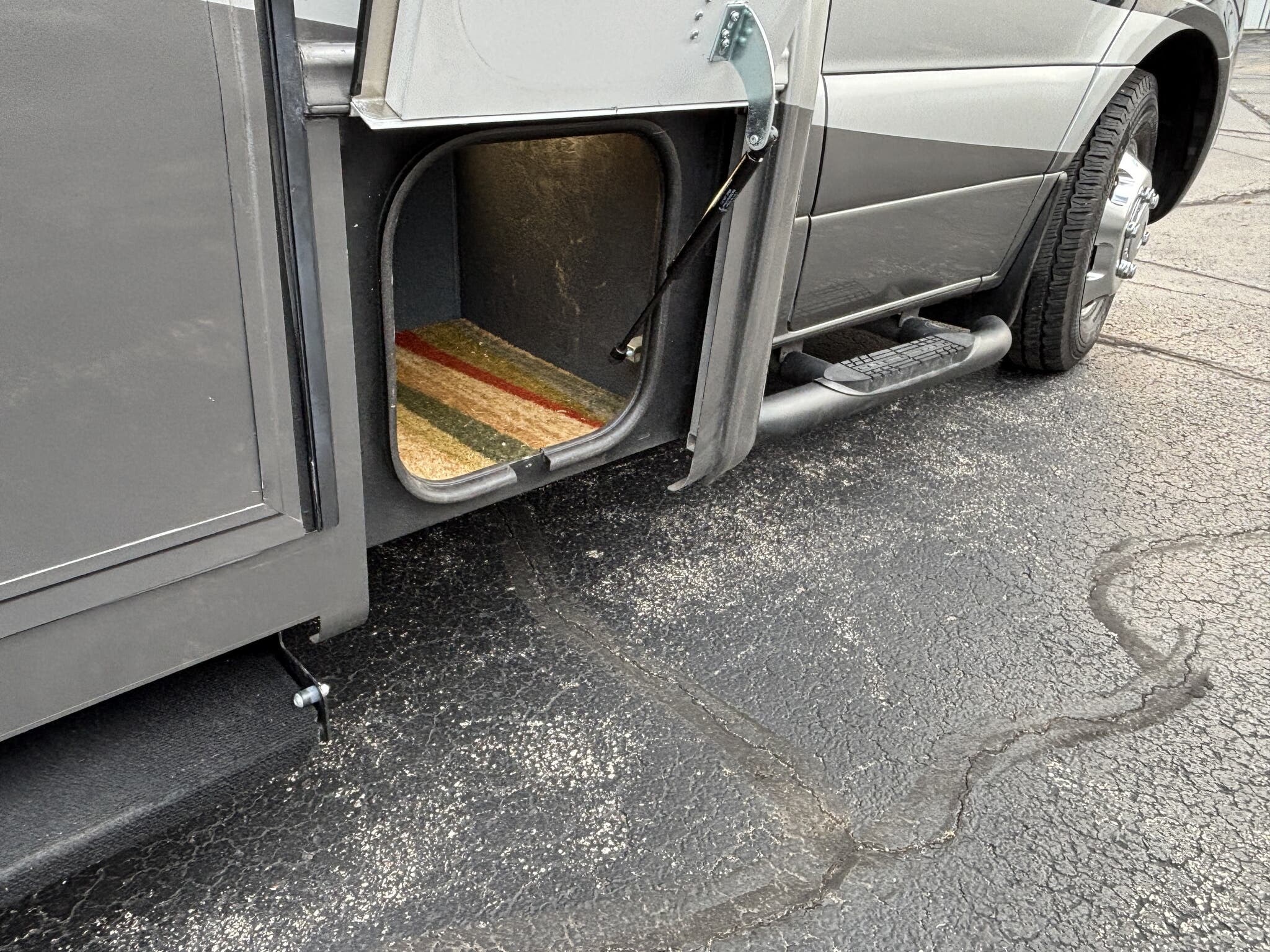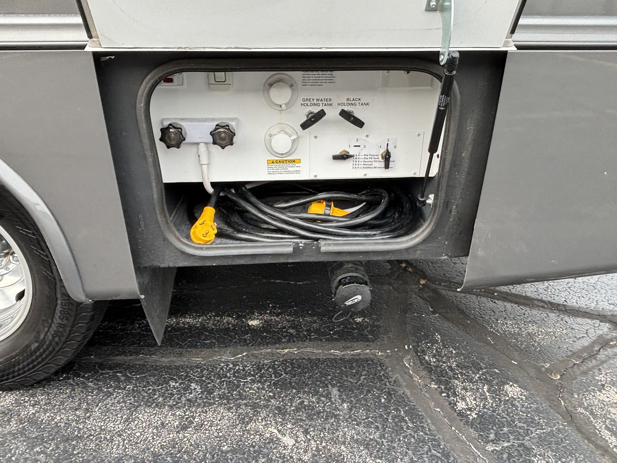 - Additional outdoor features such as external shower, external power entrance step, leveling jacks, and hitch