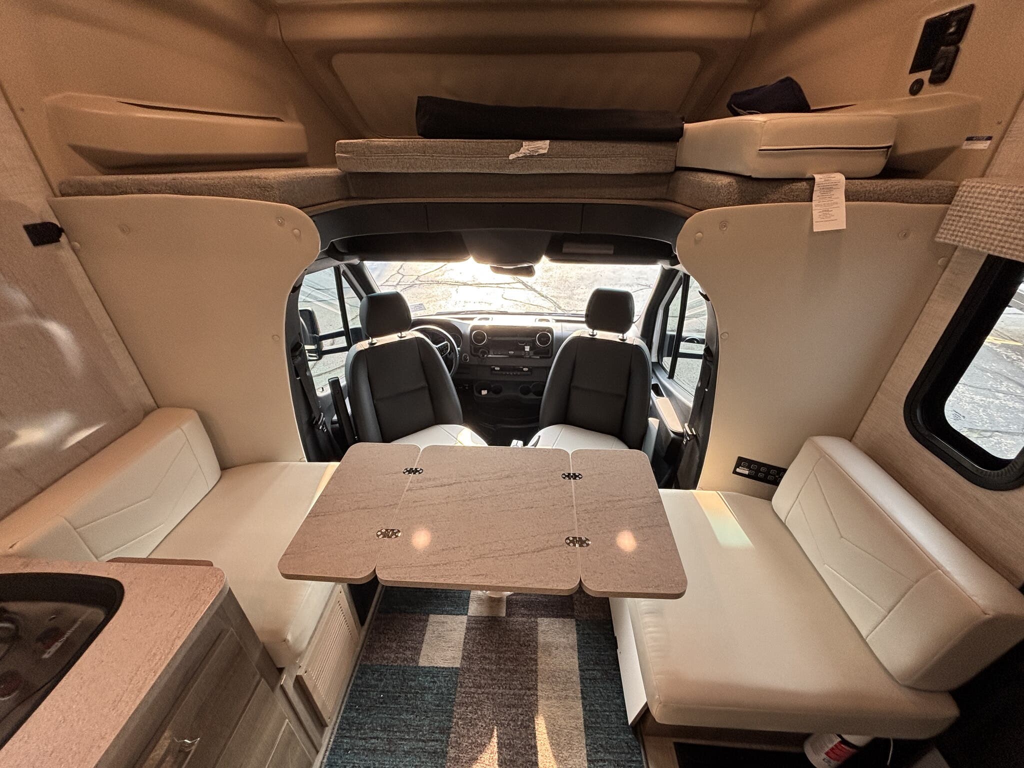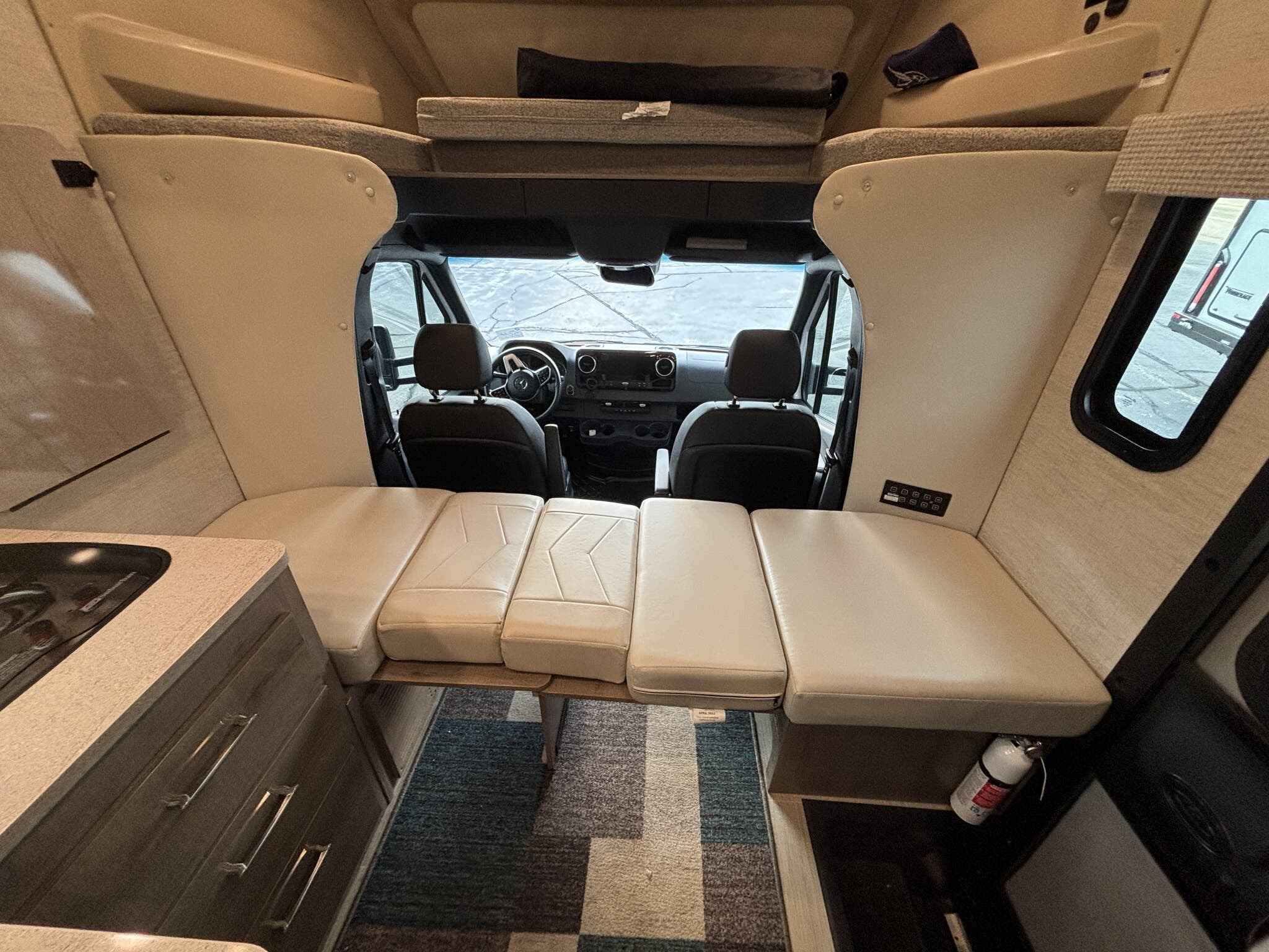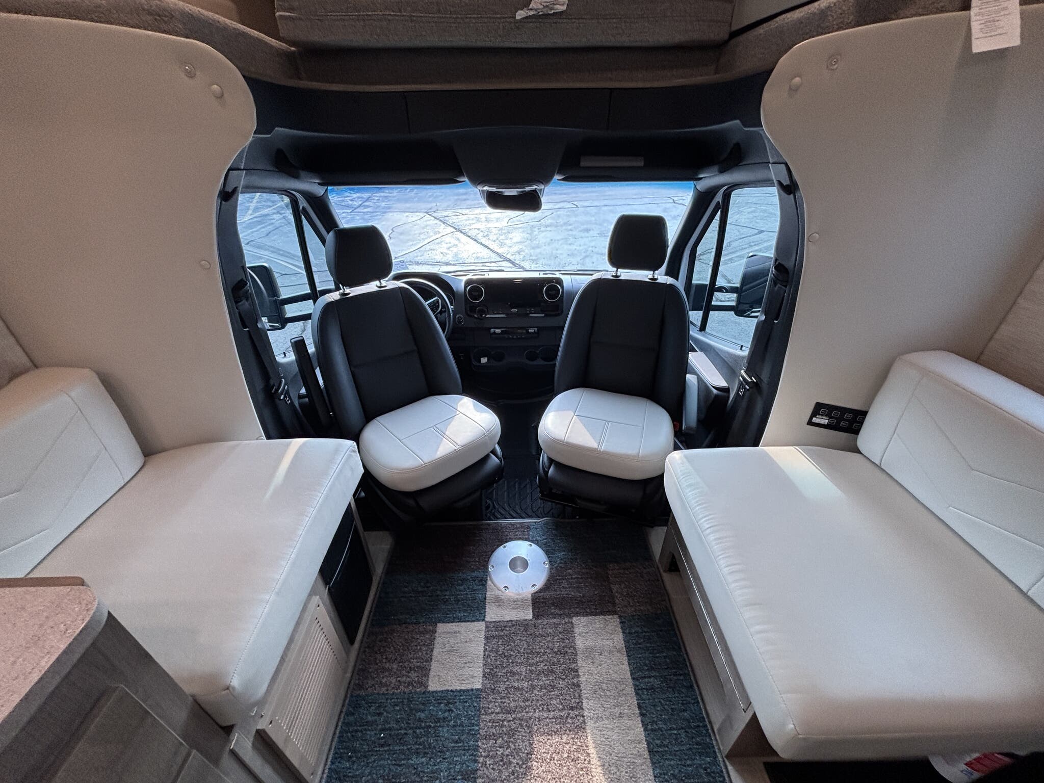 This unit is equipped with -Trailer hitch - Power awning _ Micro convection oven - 7 cu ft ref/freezer - 2 burner gas range - 24" tv TV in dining area - 36" tv in back living area - Ducted A/C - Rear monitor - Mercedes navigation - Inverter - power roof ventilator - Aluminum wheels - Big Foot automatic leveling system
