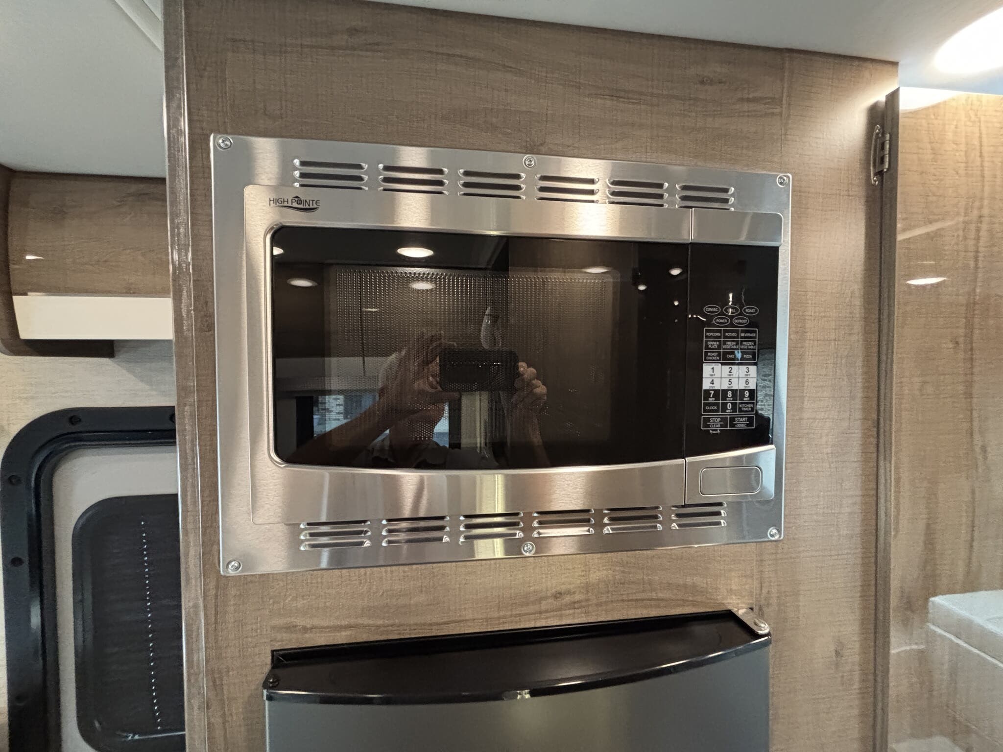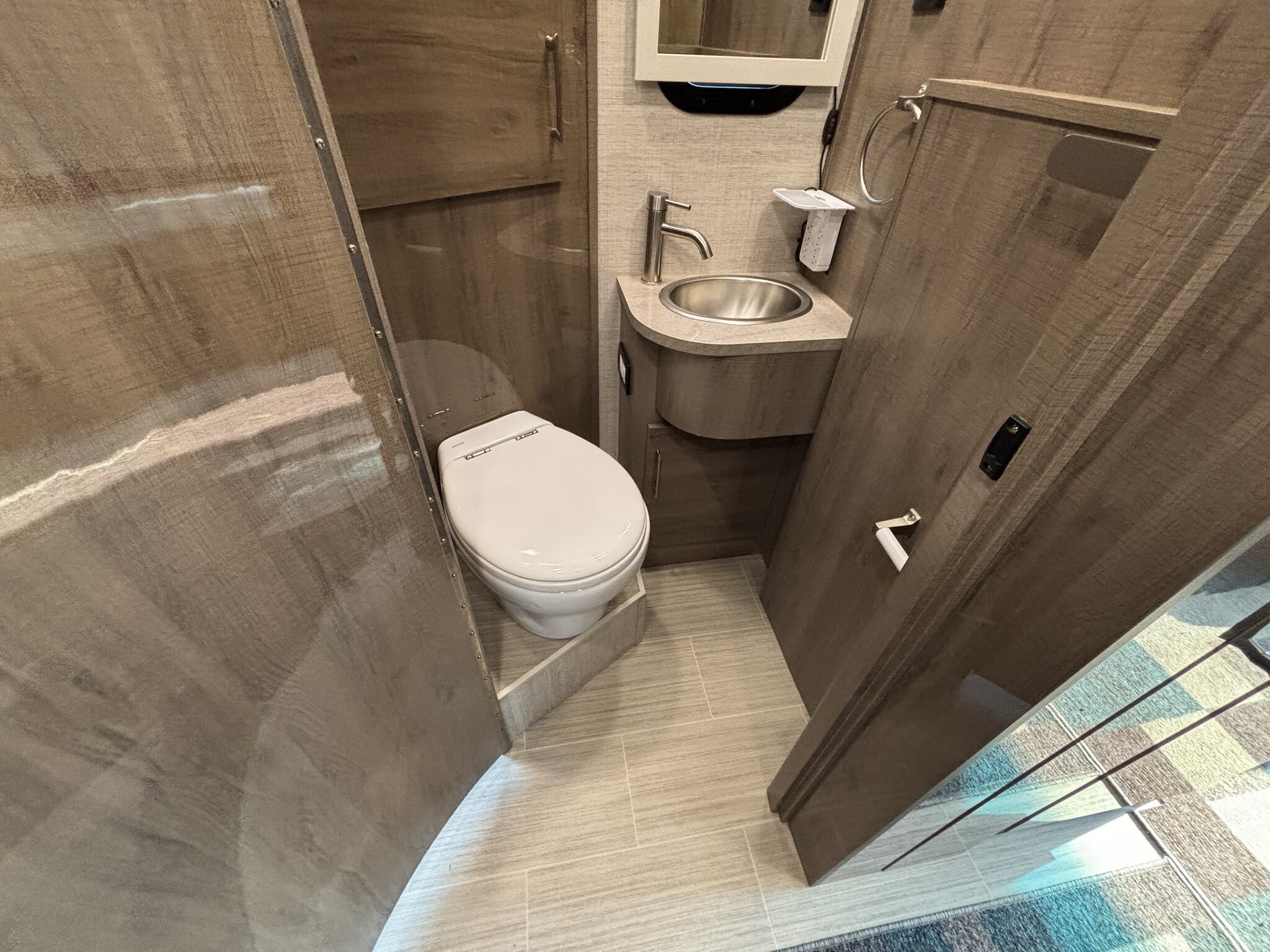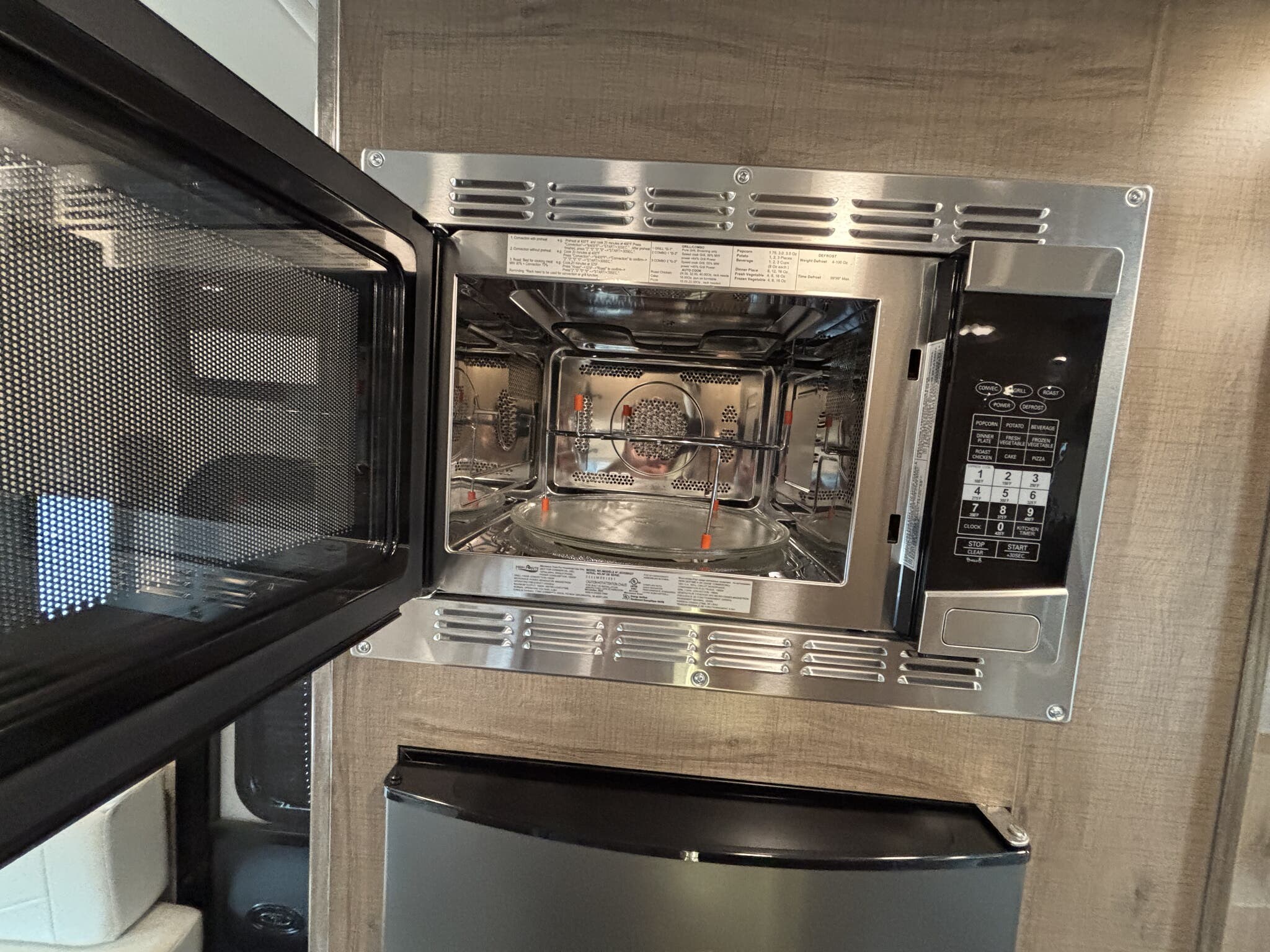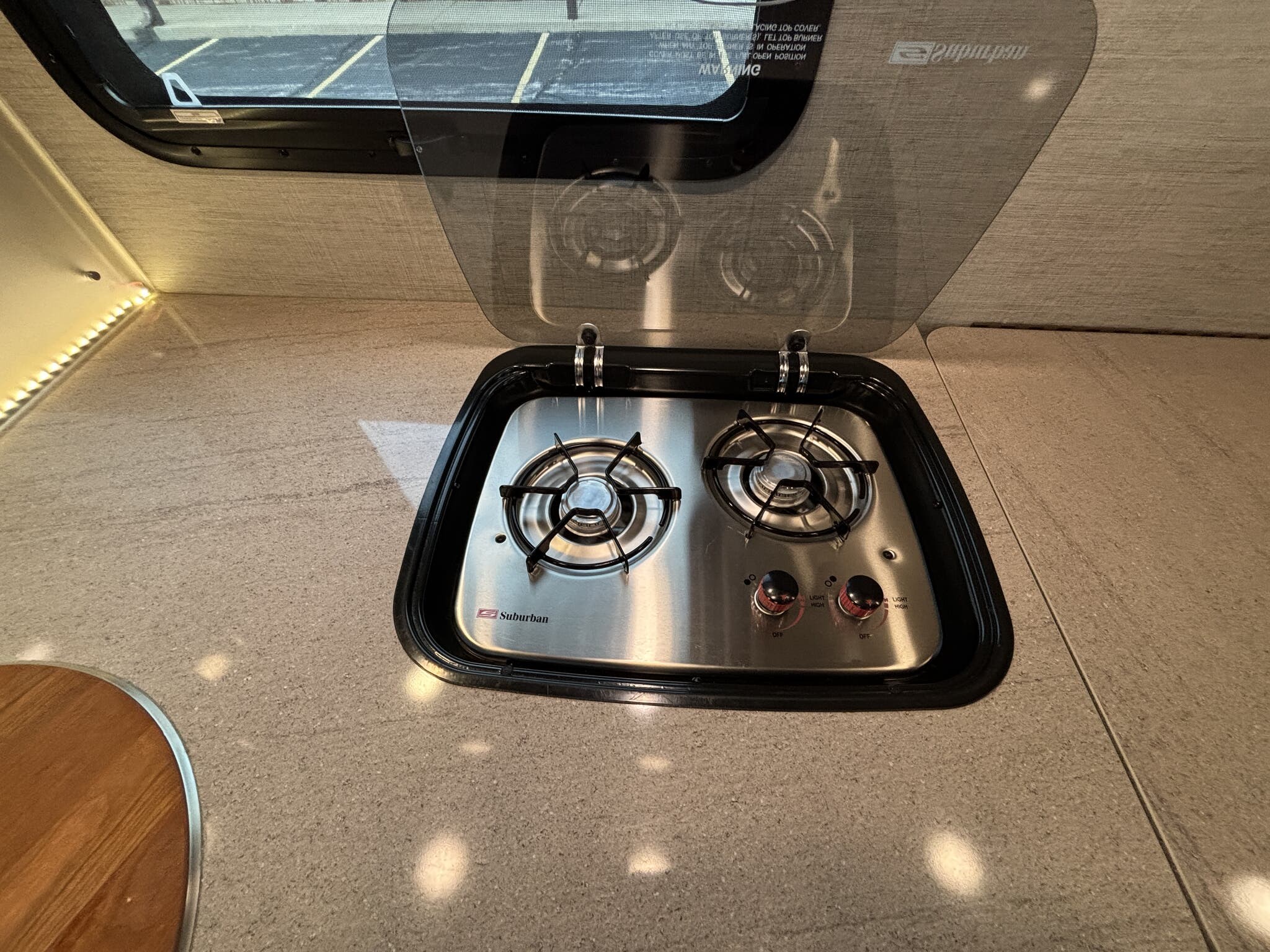 This travel trailer is equipped with everything needed for a self-sufficient motorhome experience, including: