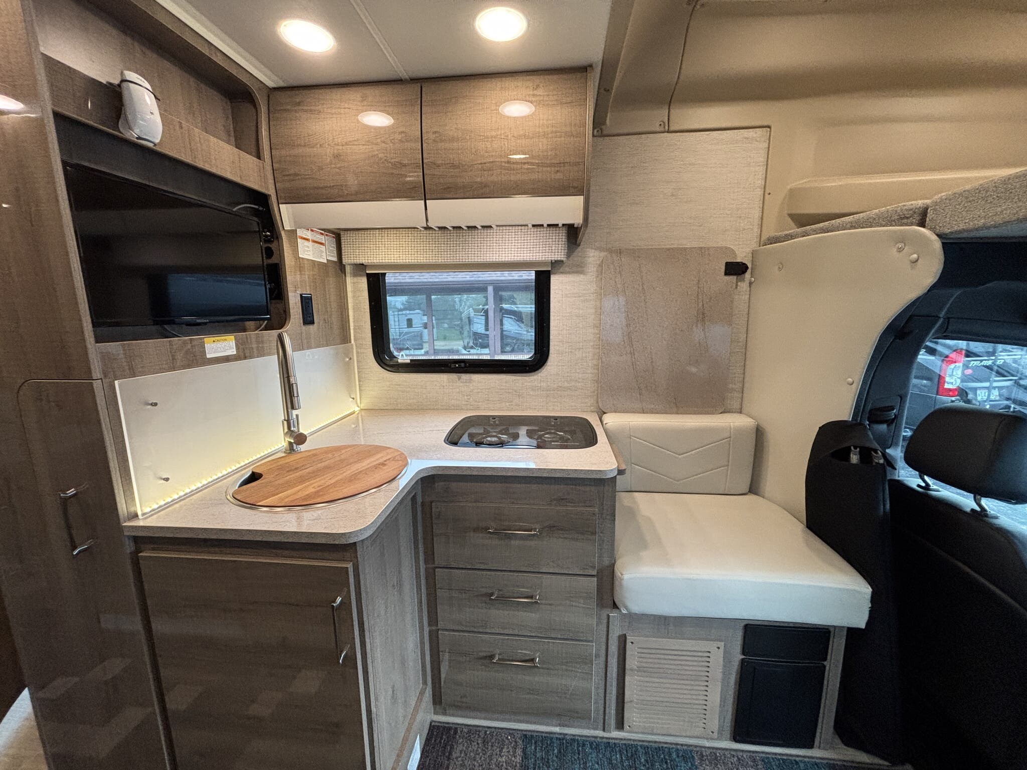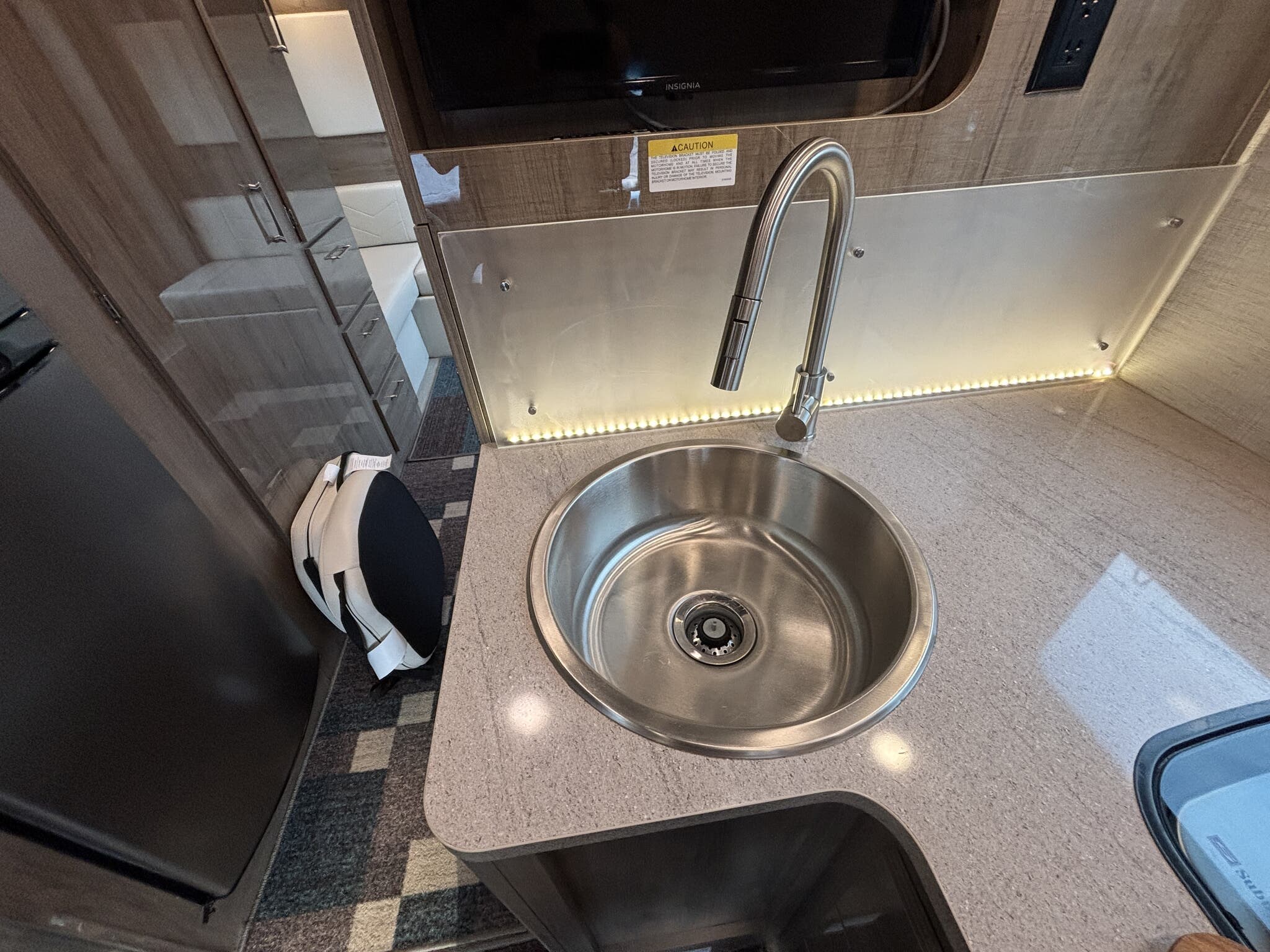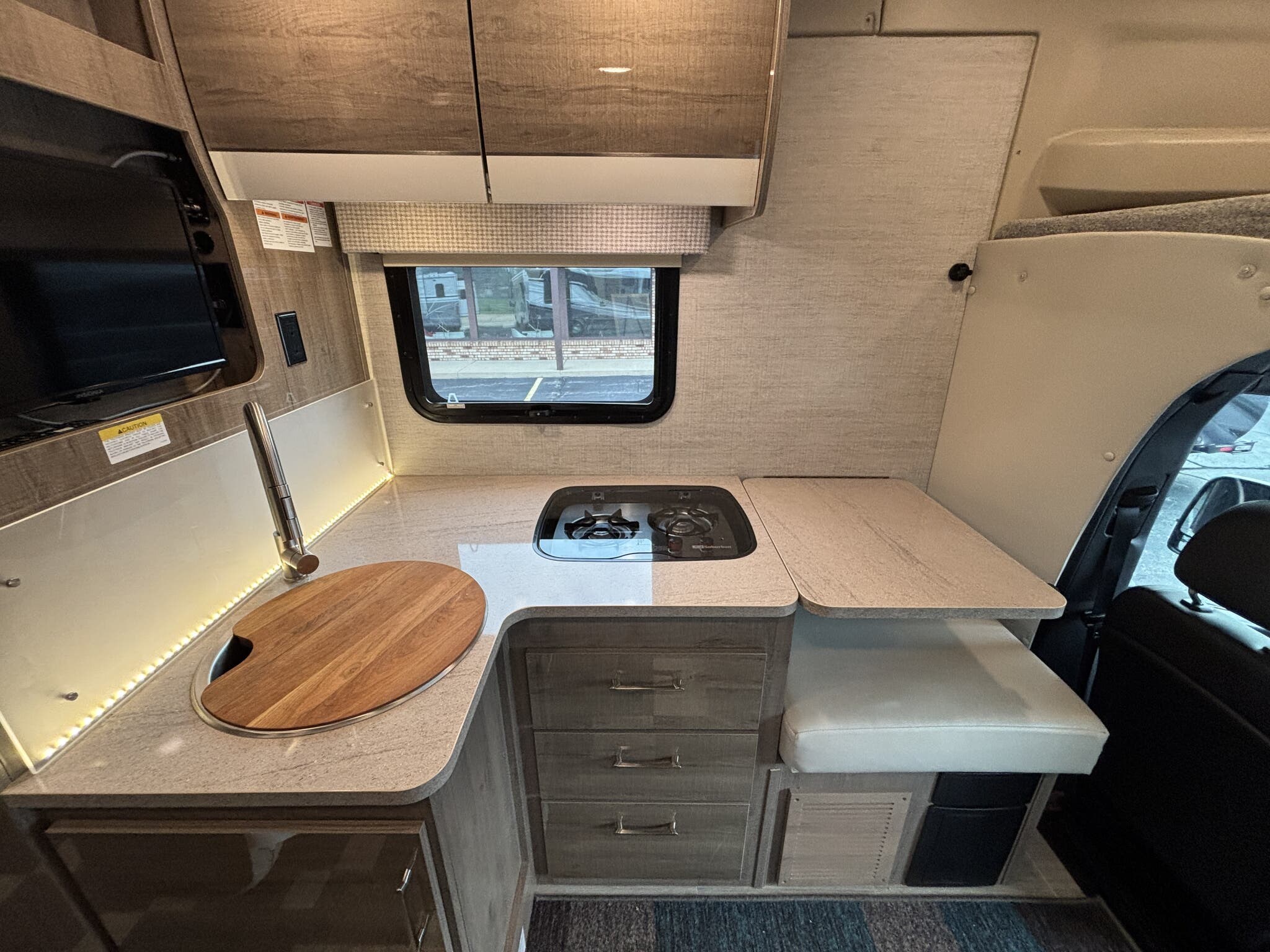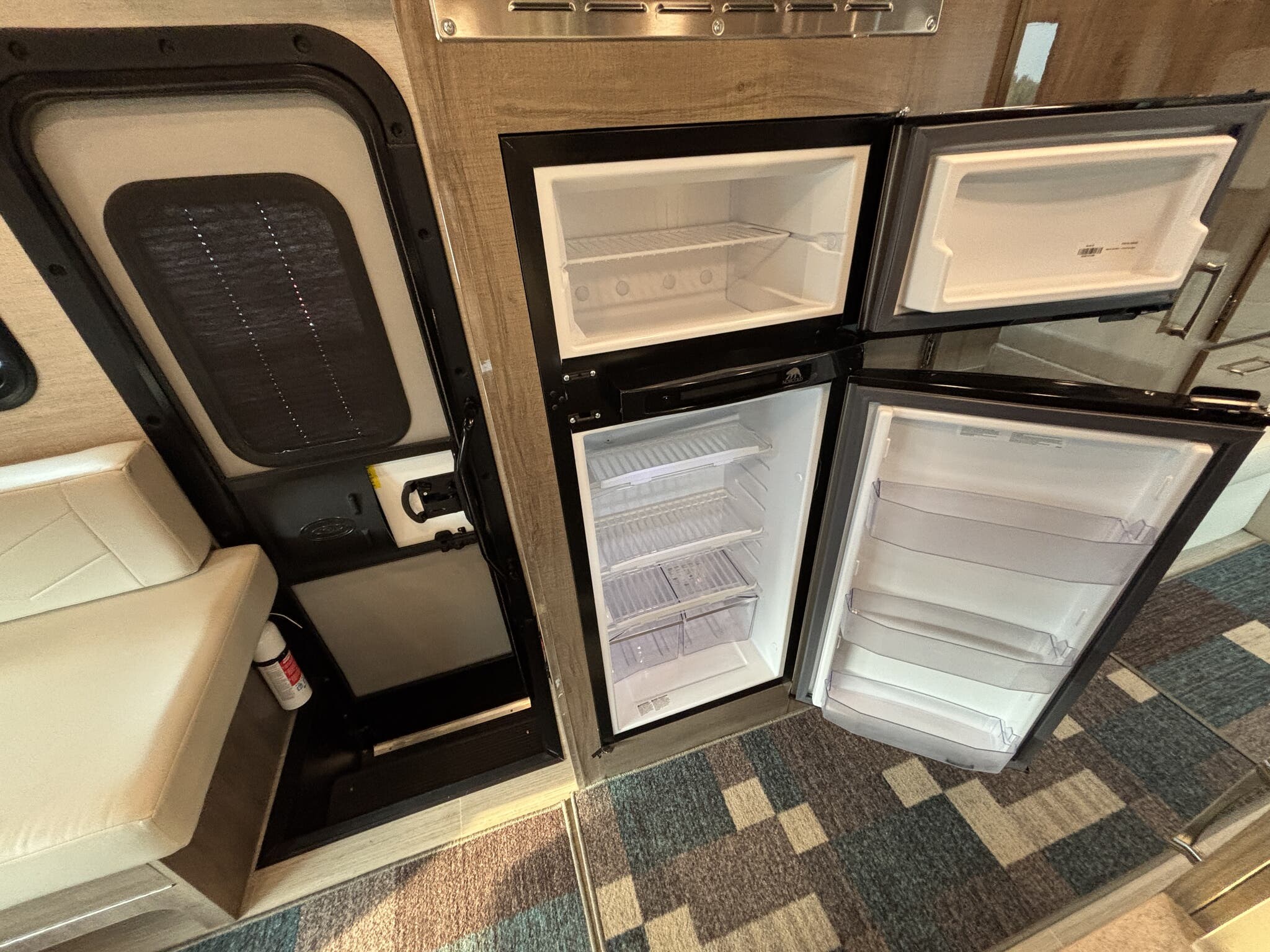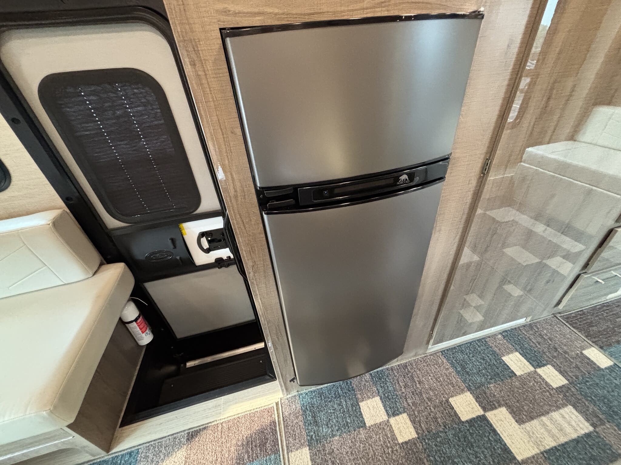 This travel trailer is equipped with everything needed for a self-sufficient motorhome experience, including: