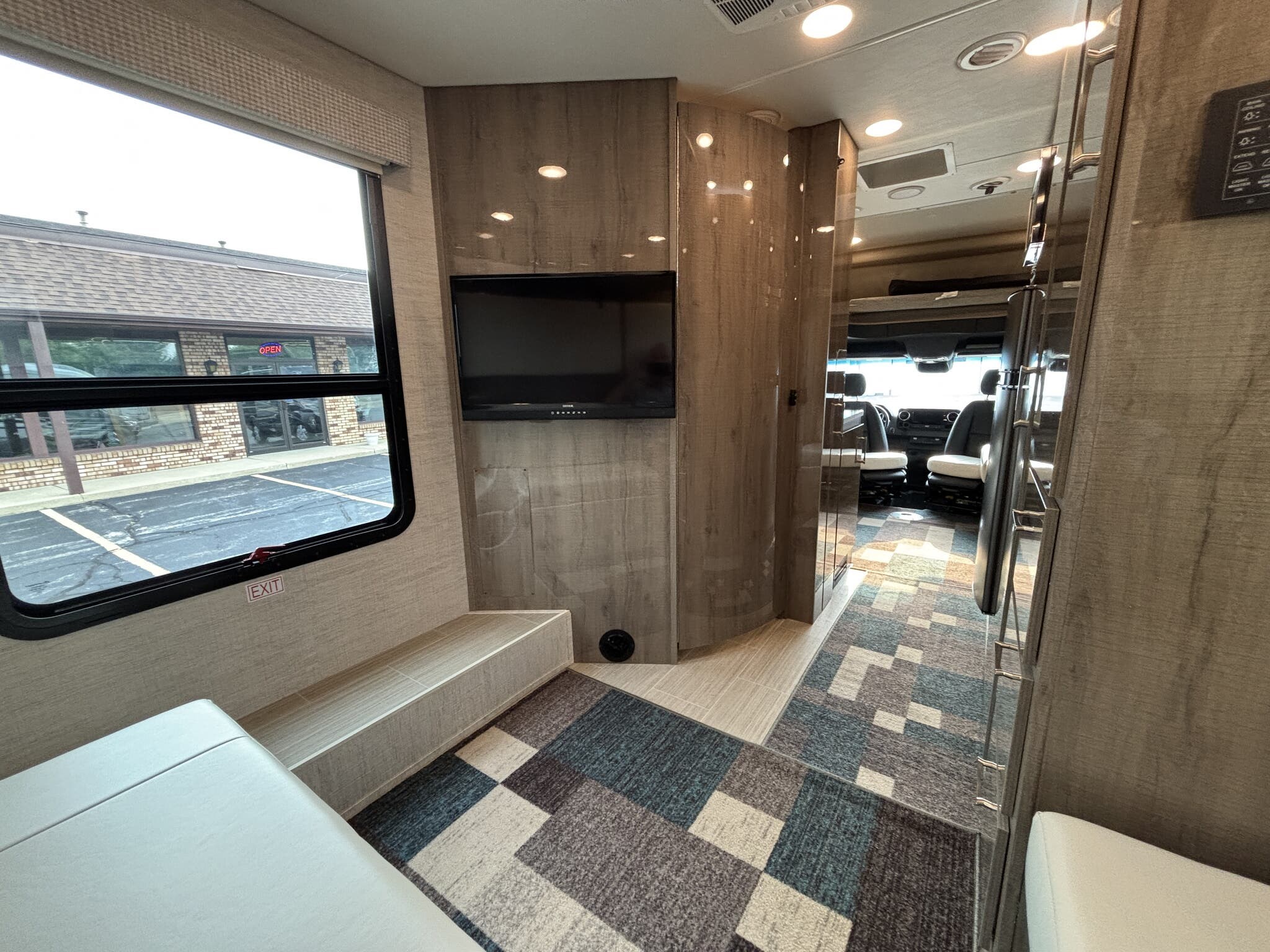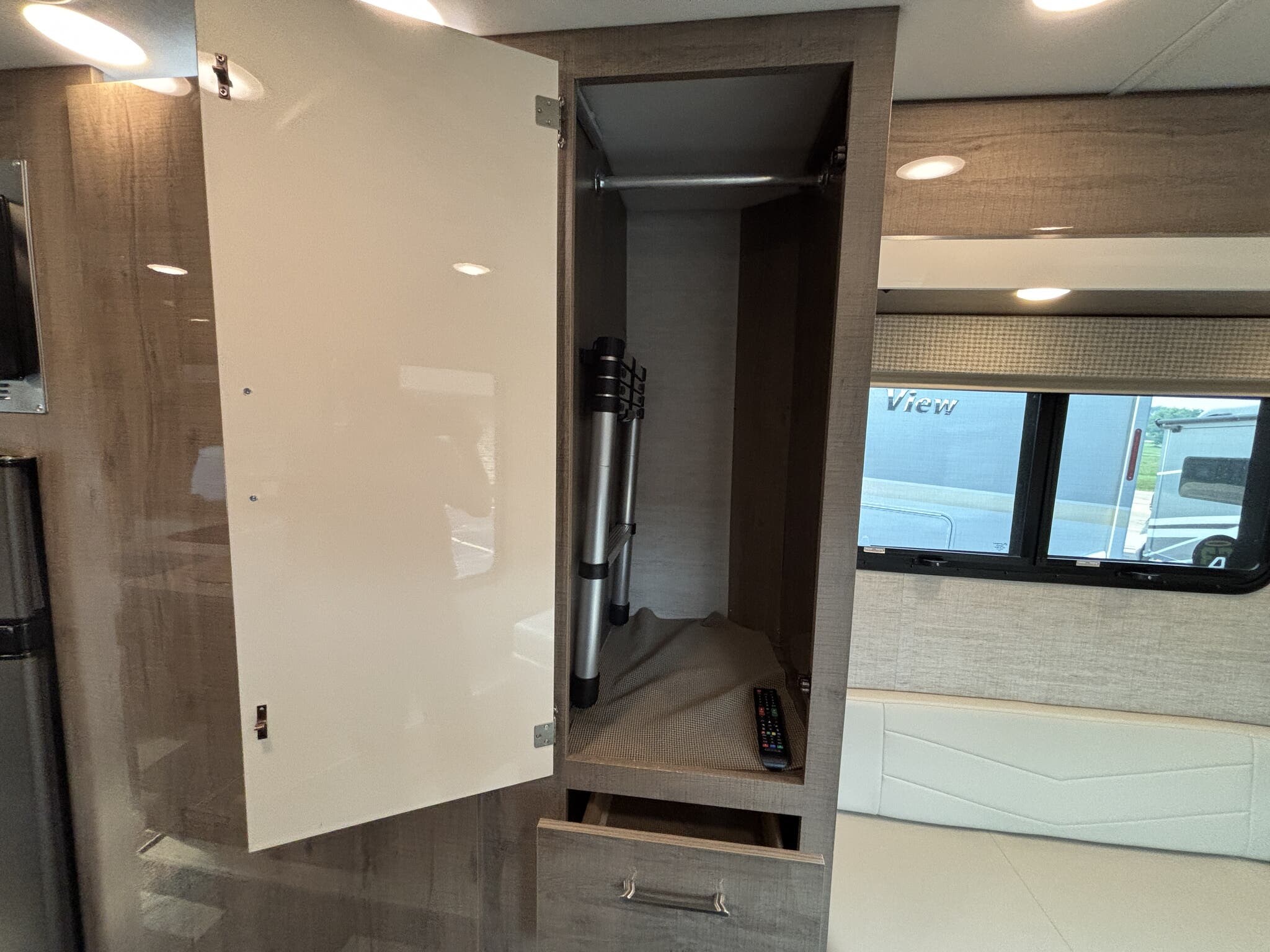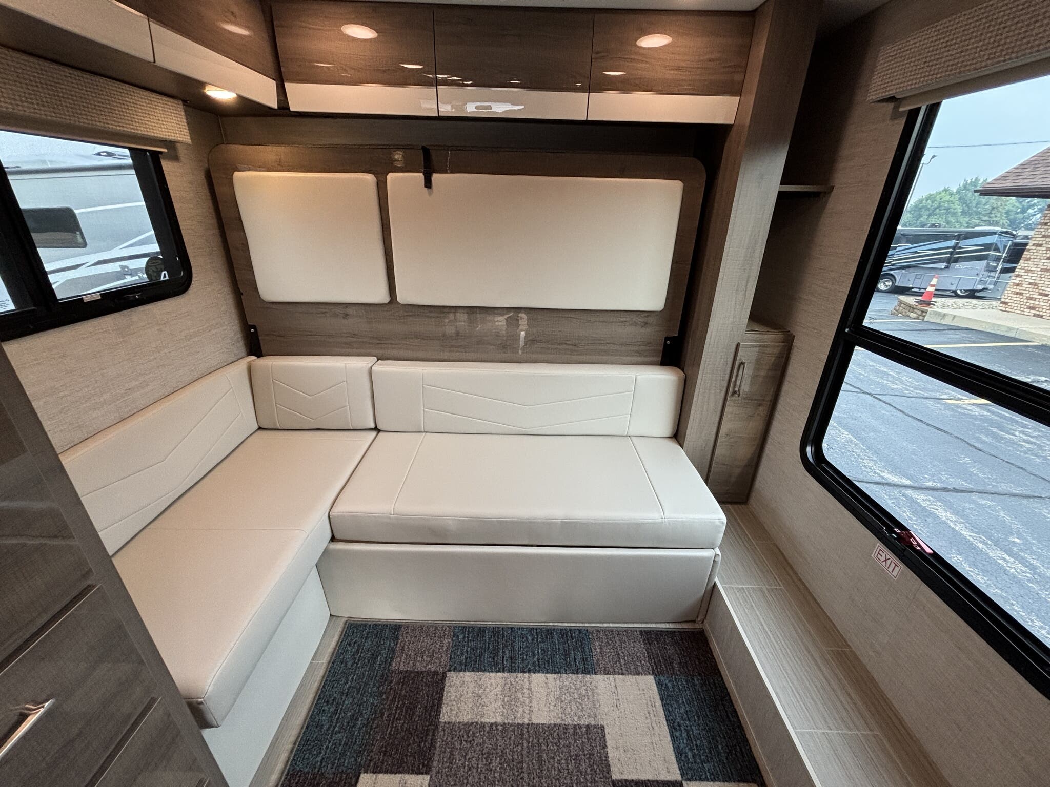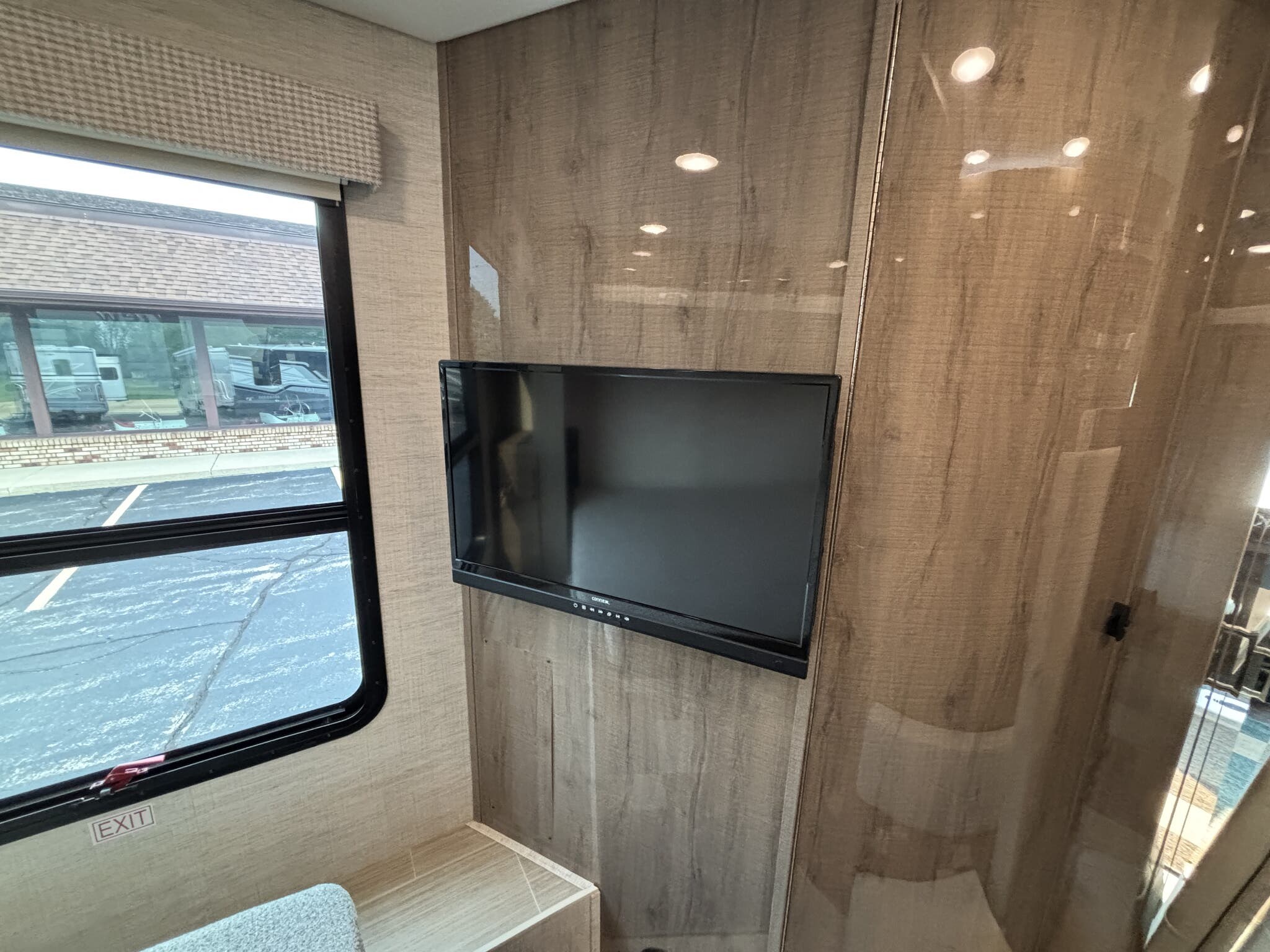 Travel with peace of mind thanks to multiple safety features and easy-entry options. The motorhome's exterior includes an external shower, power entrance step, and an automatic slide-out awning to maximize outdoor comfort and convenience. The inclusion of a GPS navigation system ensures you reach your destination effortlessly, while the backup monitor assists with safe parking and maneuvering.