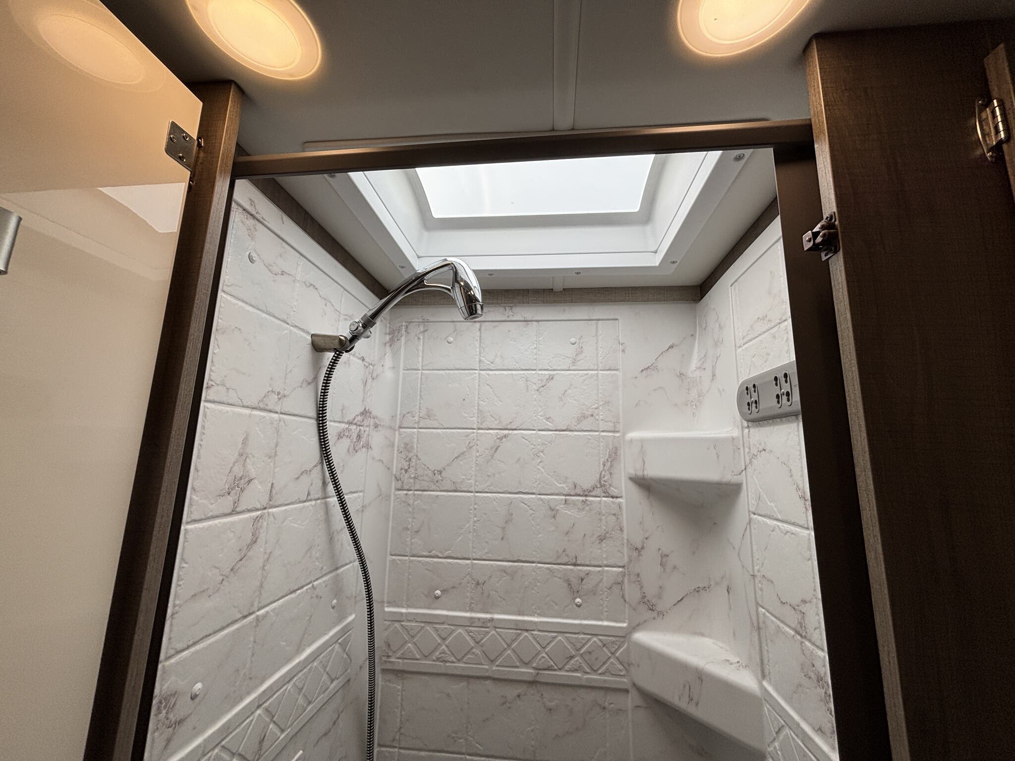 Awning, Backup Monitor, Exterior Speakers, External Shower, Hitch, Leveling Jacks, Power Entrance Step, Power Roof Vent, Skylight, Slide-out Awning -