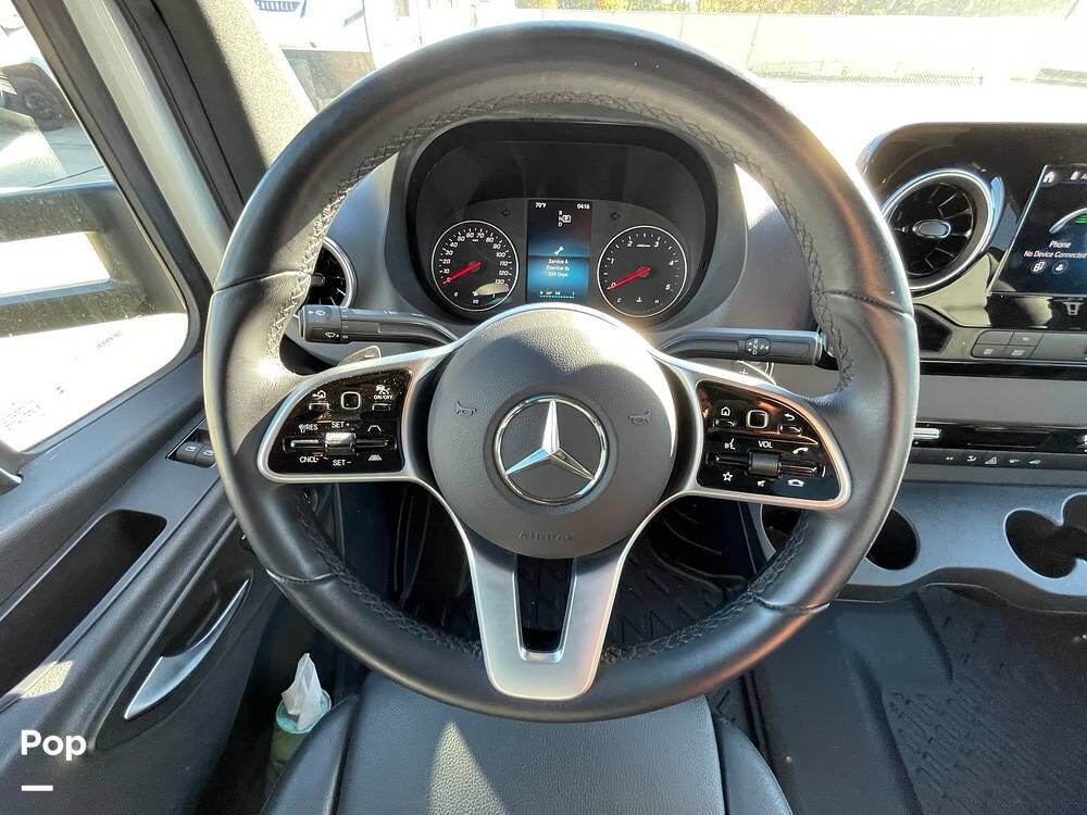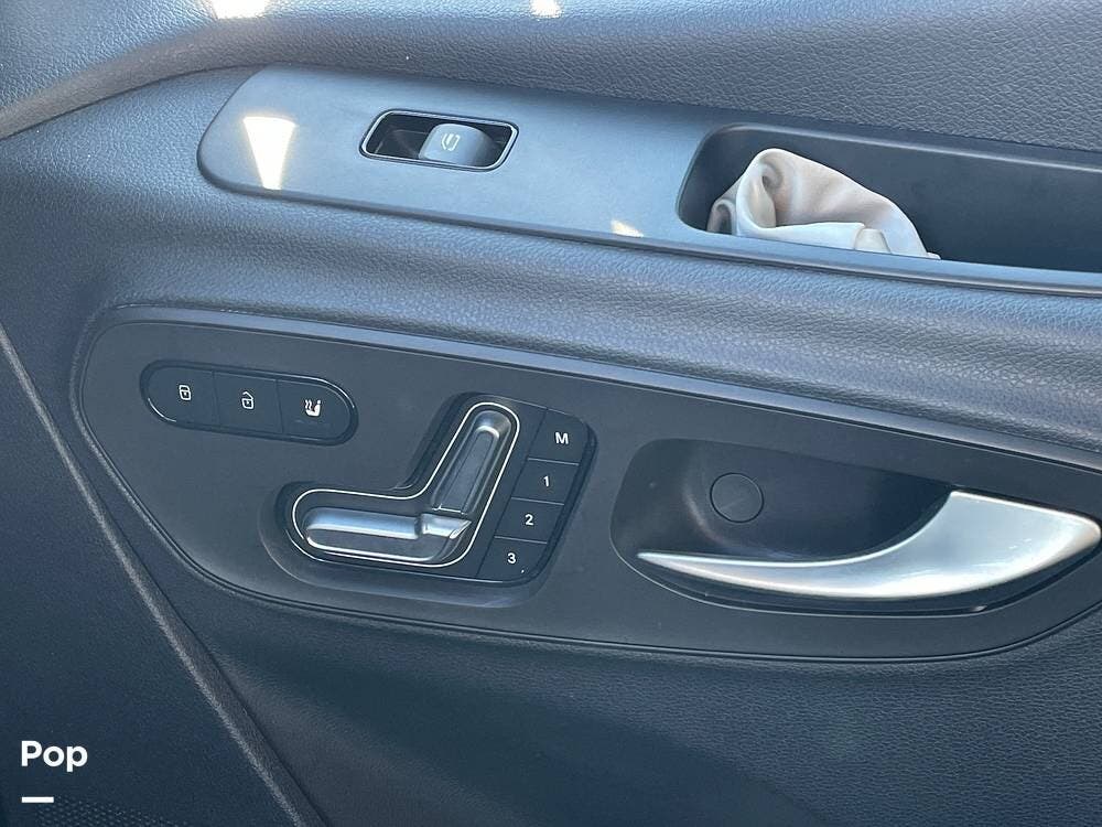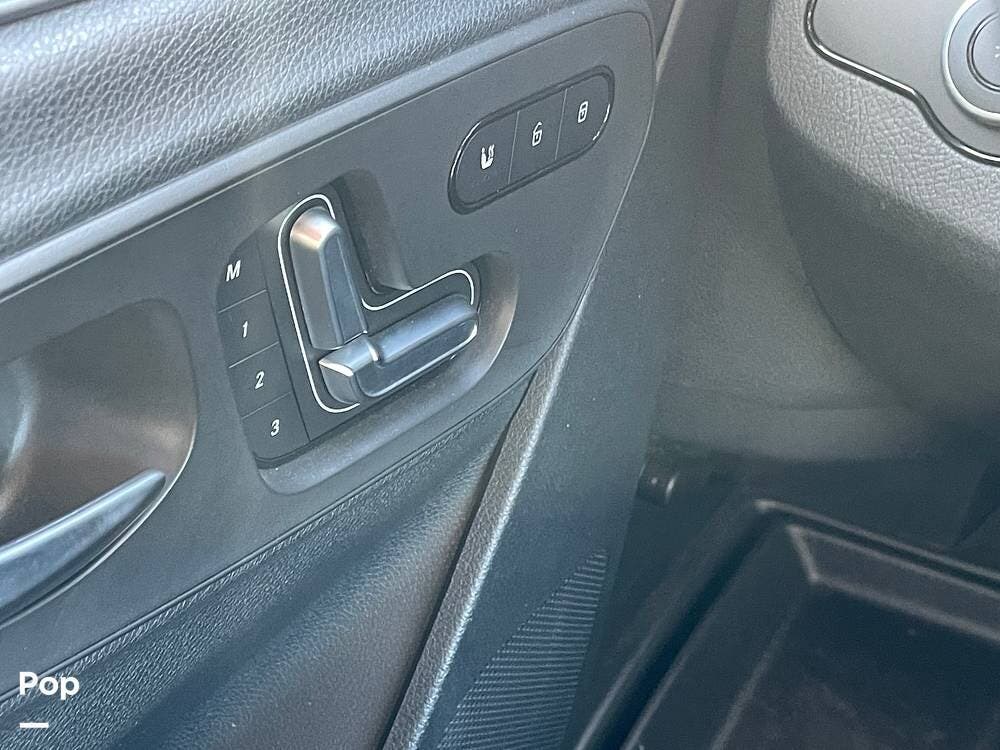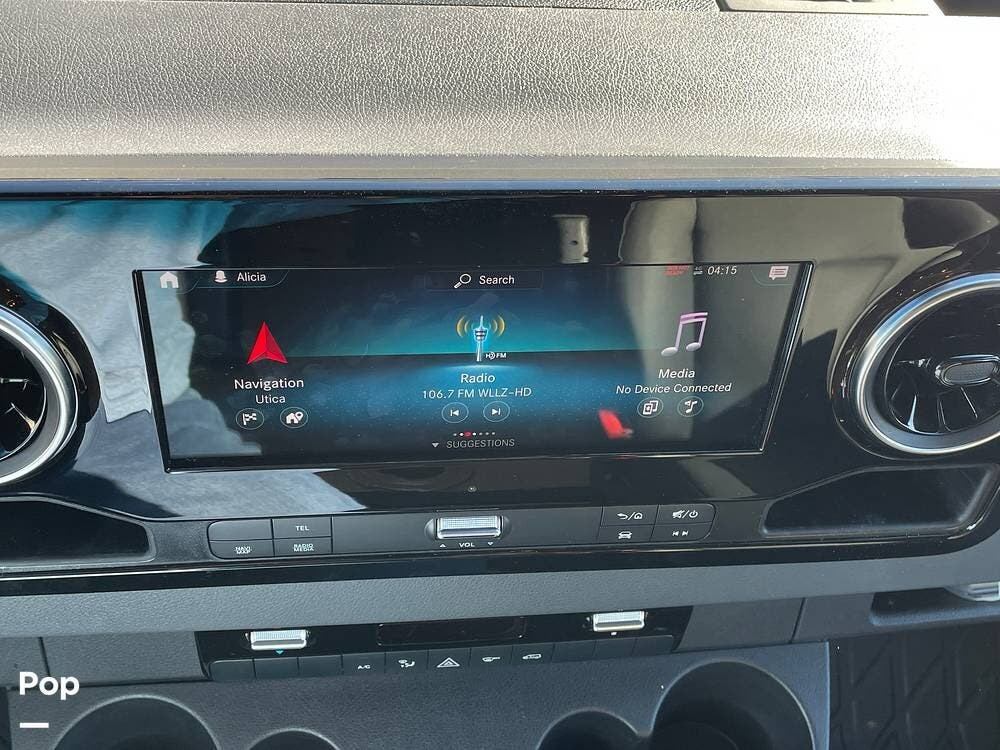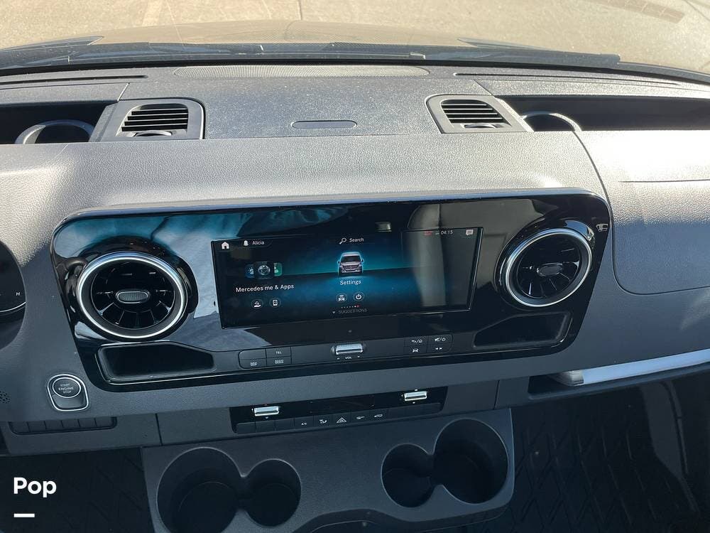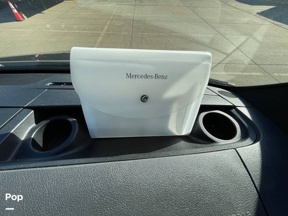 An in-dash control monitor houses a stereo, navigation system, and Mercedes settings/apps. The rearview mirror also displays the backup camera.