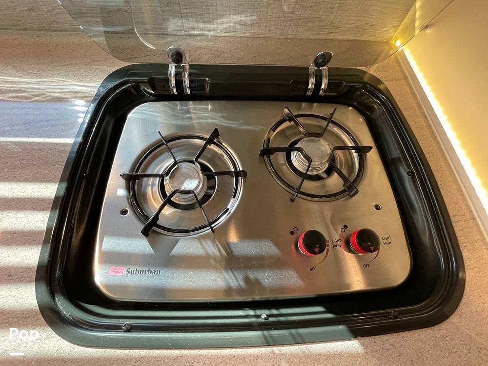 The kitchen features a stainless steel sink with a wood cover and a pull-out spray faucet, a convection/microwave oven, a 2-burner stove with a cover, and an electric/propane-powered refrigerator/freezer.