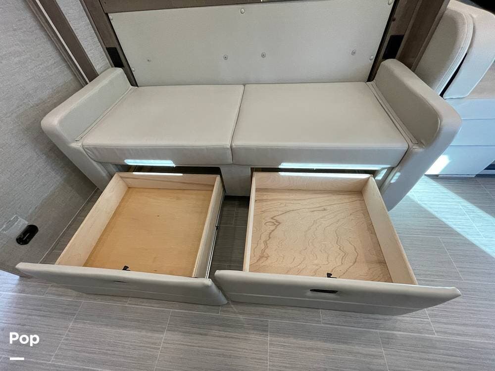 The sofa also has a queen-size Murphy bed that can be opened and closed using the power control on the back wall. Below the sofa, there is pull-out drawer storage. When the Murphy bed is down, there is overhead cabinet storage and a window with a day/night shade.