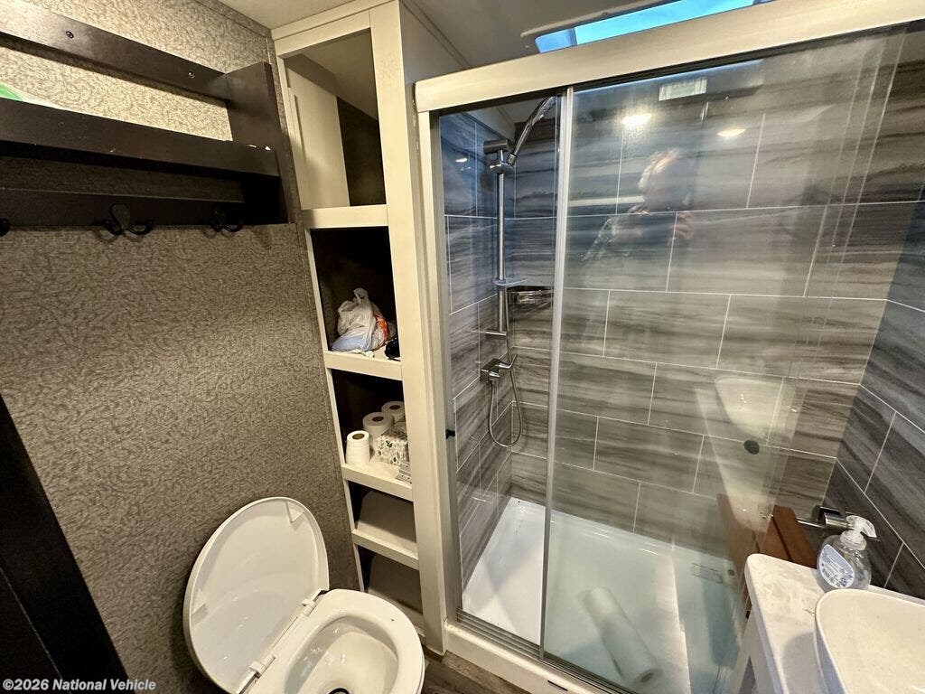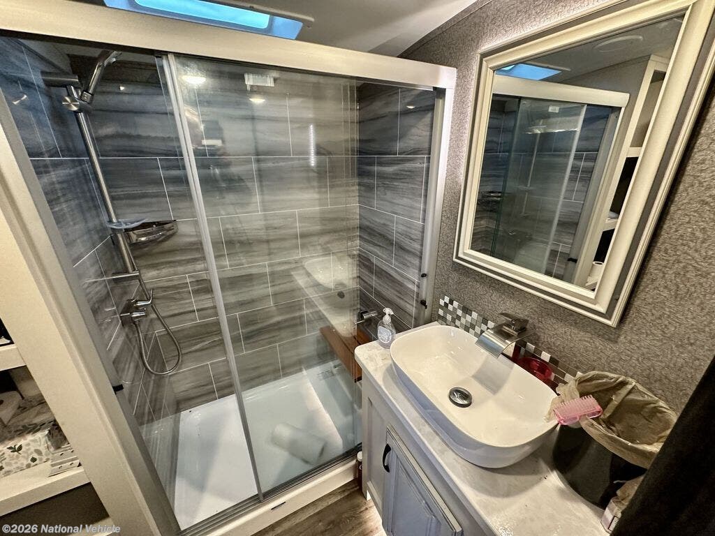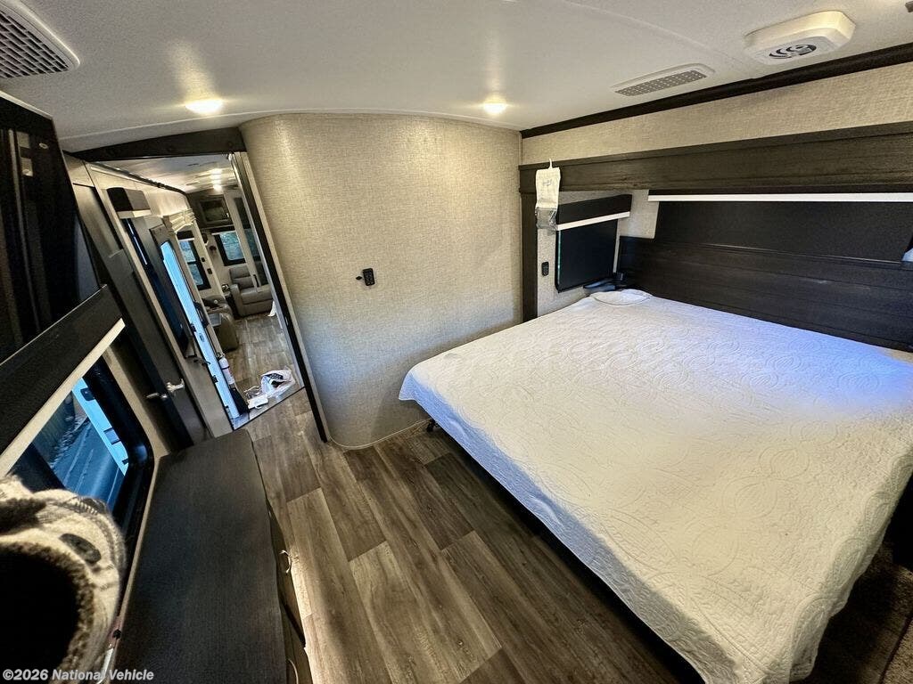 Toward the front, the private master suite offers a quiet retreat with a comfortable king bed, generous wardrobe storage, washer/dryer prep, and its own TV. The spacious bathroom features a large walk-in shower and quality fixtures, delivering a residential feel wherever you travel.
