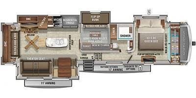 The 377RLBH model is perfectly suited for family fun. Its large rear living layout features ample seating with a ceiling fan, a mid-bun-house, and a king-size master suite.