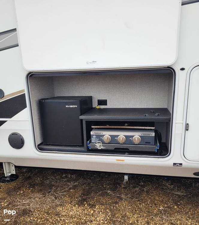 Take the fun outside under the two patio awnings. This unit has an outdoor kitchen featuring a gas griddle and refrigerator, and a quick LP connection that can be used for a grill or a fireplace.