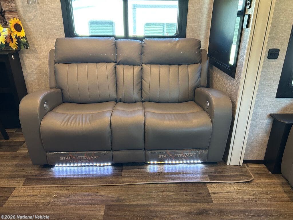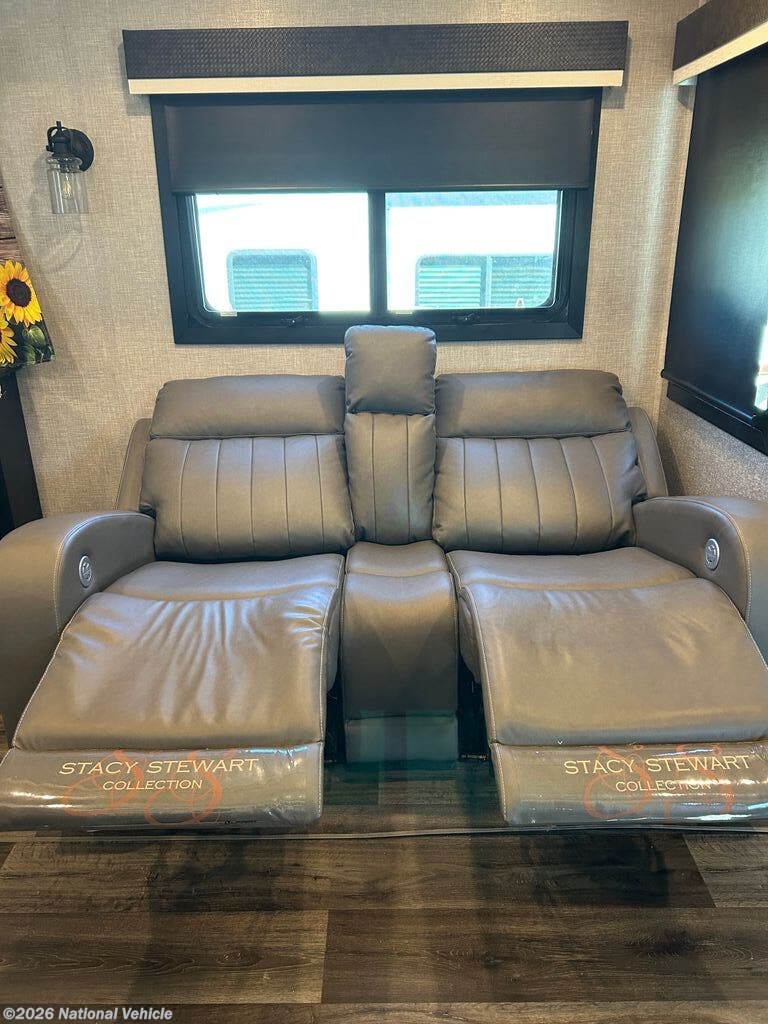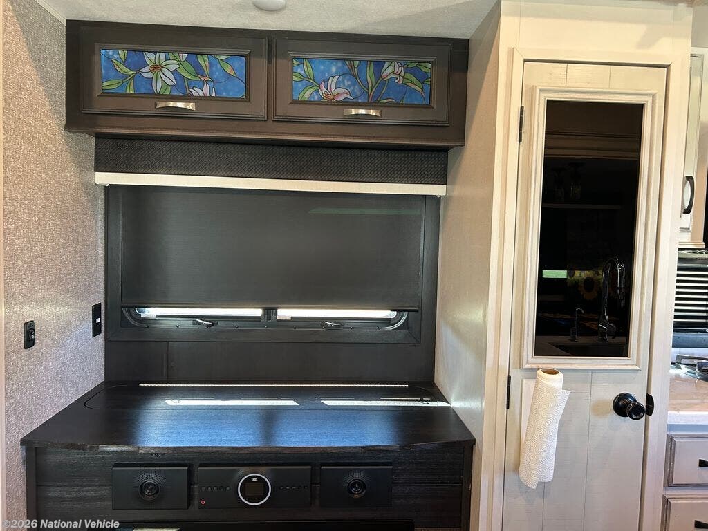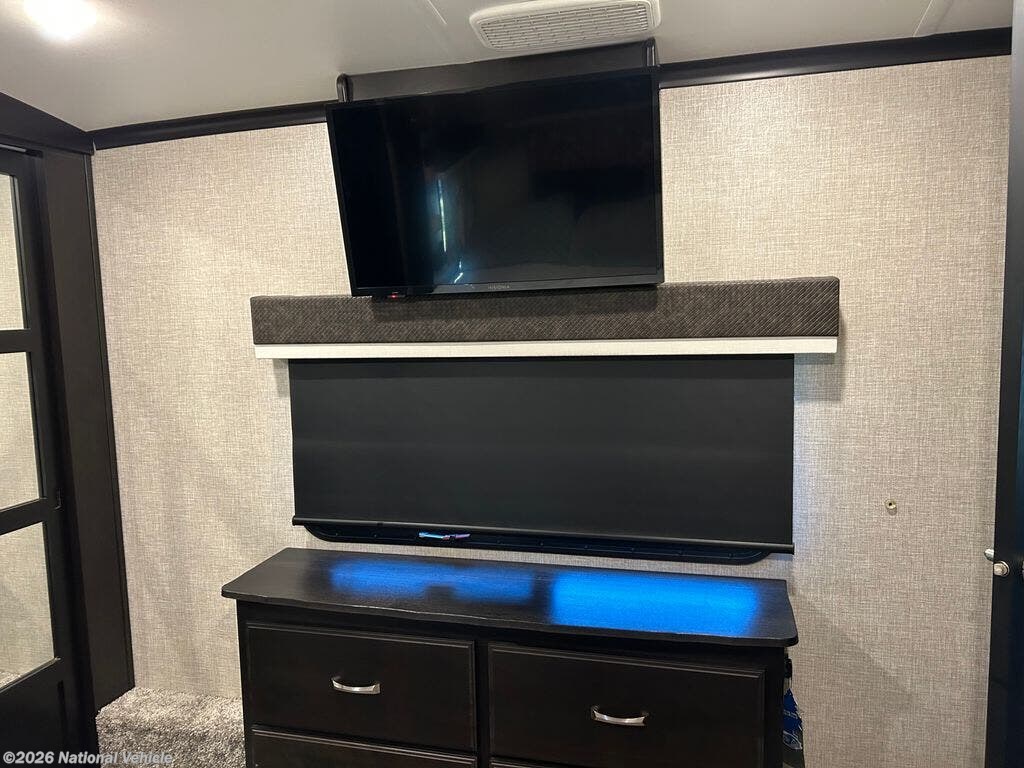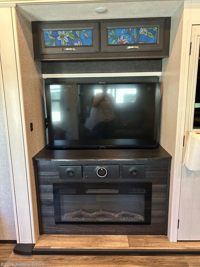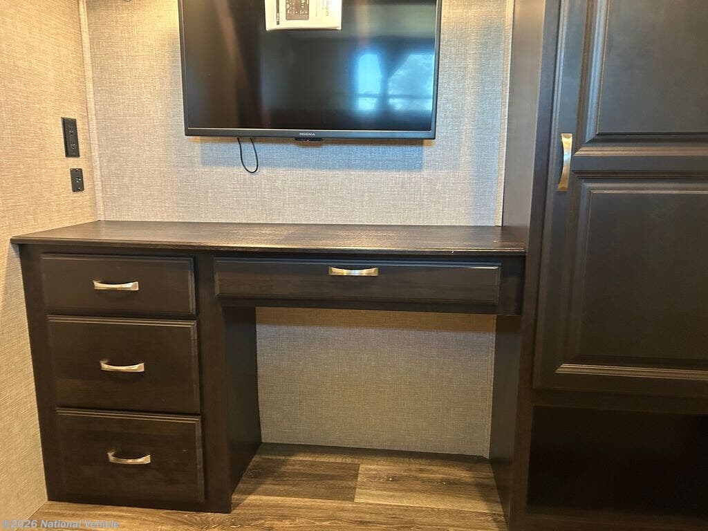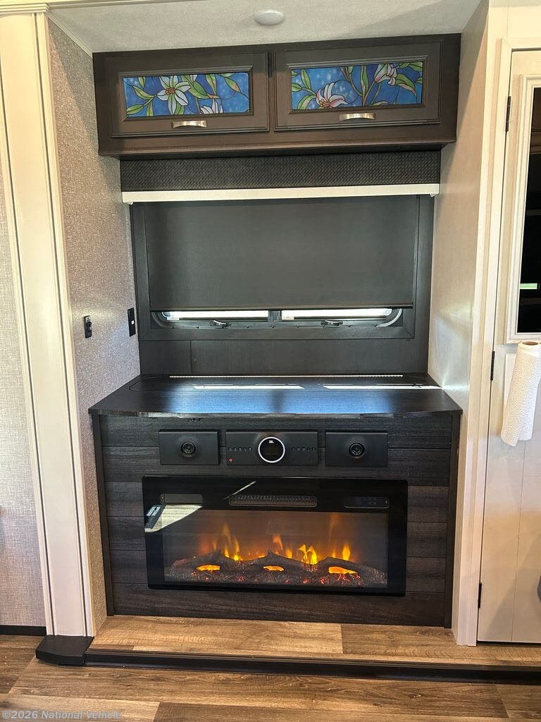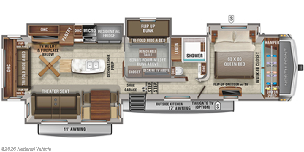You can work from anywhere with this fifth wheel thanks to the middle bonus room that offers a desk with TV above, a tri-fold sofa with removable table, a flip-up bunk and a closet. This multi-use room works for just about anything including an extra living area and bunkhouse. The shoe storage under the interior steps, the linen cabinet in the full bathroom, the walk-in closet in the master bedroom, and the overhead cabinets plus exterior storage allows you to bring whatever you want. Enjoy cooking in the kitchen that provides an island, a 21 cu. ft. residential refrigerator, a pantry and everything you need to keep everyone fed. The theater seats, the tri-fold sofa and the free standing table without a pedestal are great places to sit while watching the 50" Smart LED HDTV with fully digital HDMI output and JBL home entertainment system with subwoofer plus there is a fireplace below for those chilly evenings.