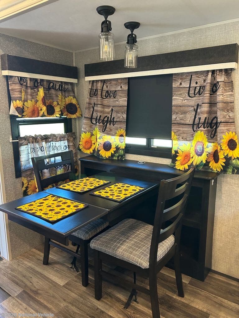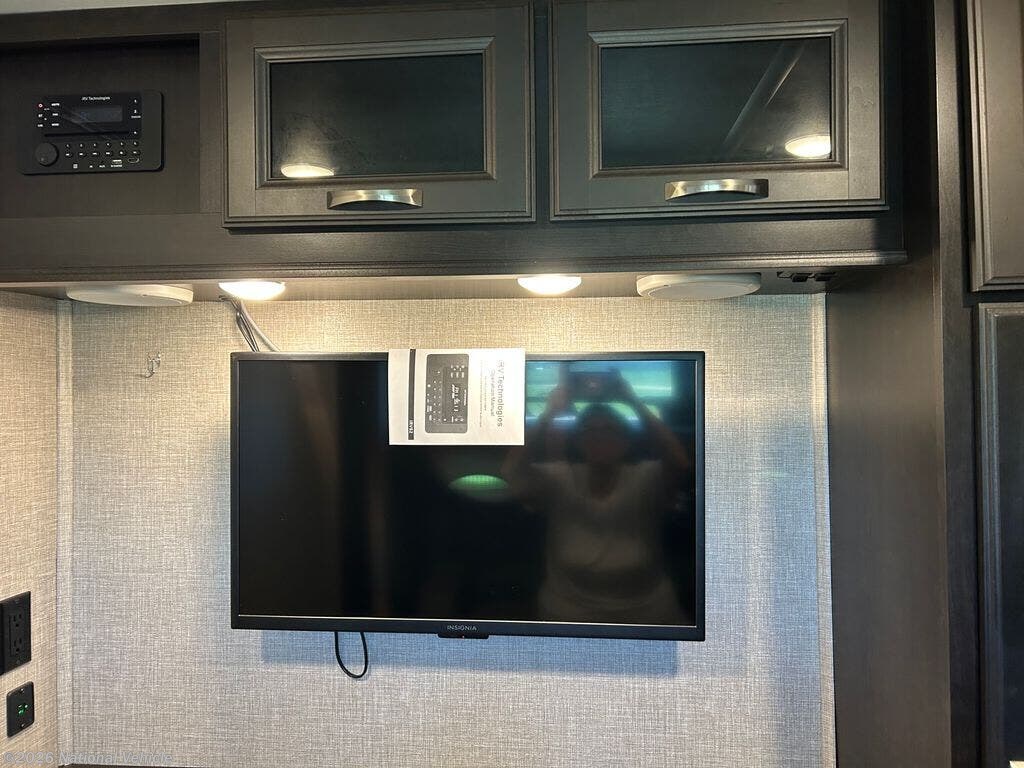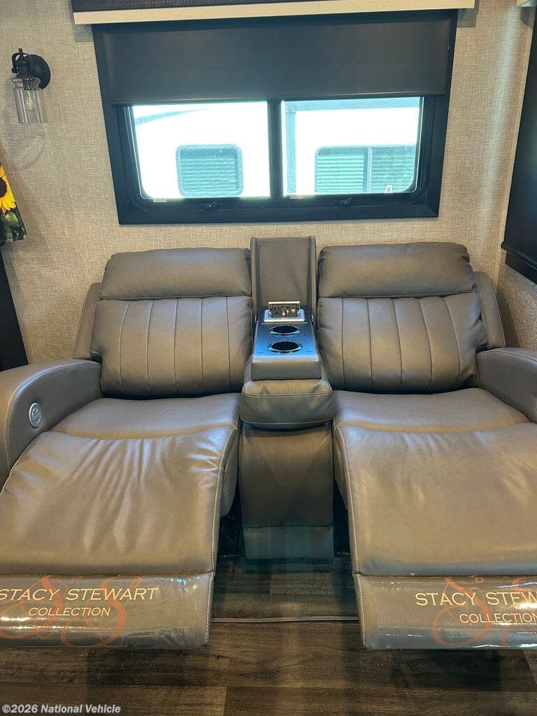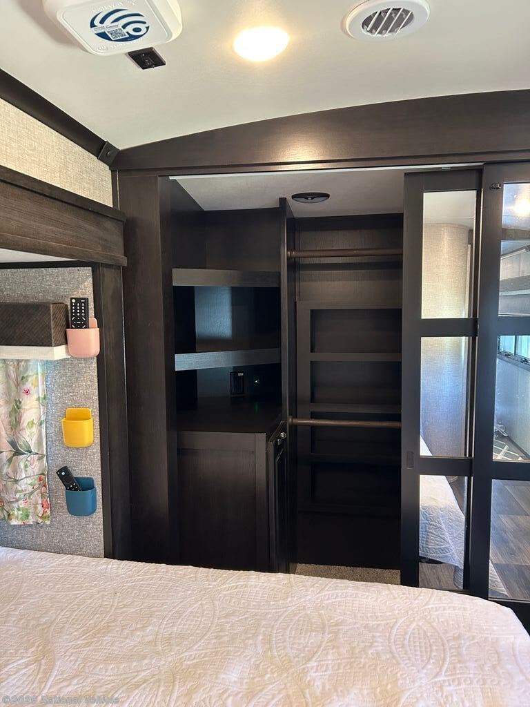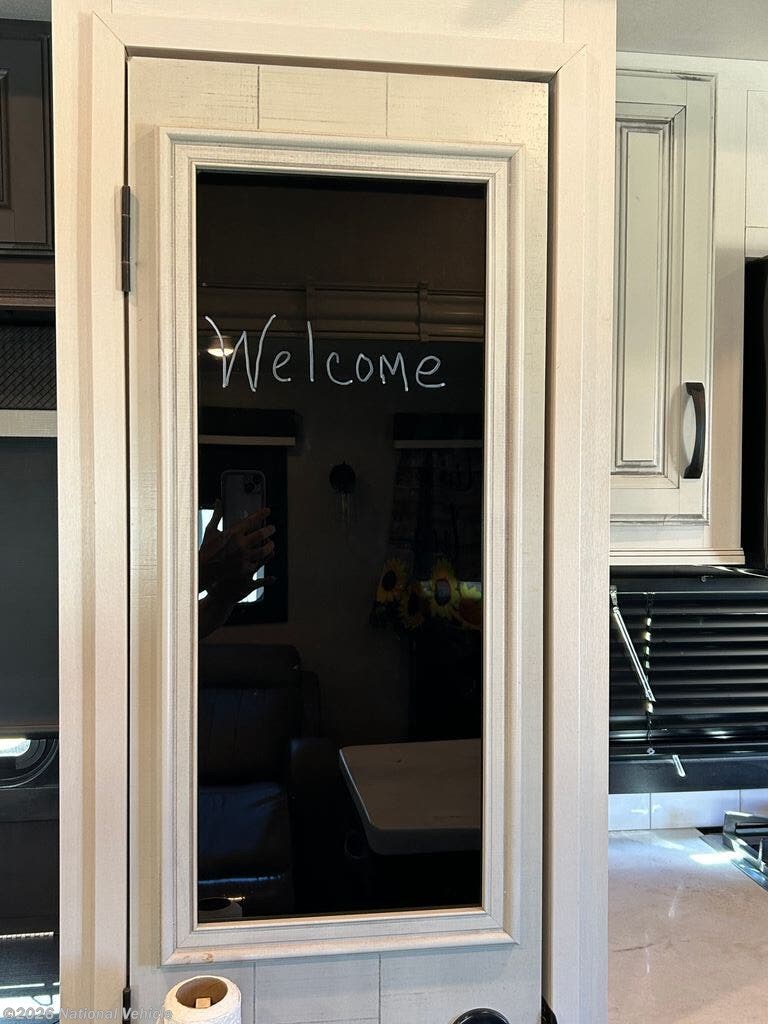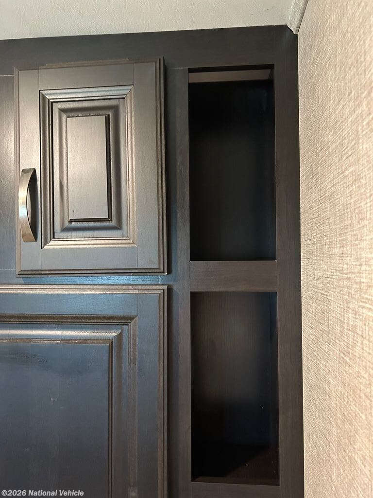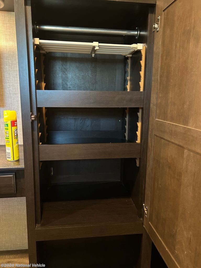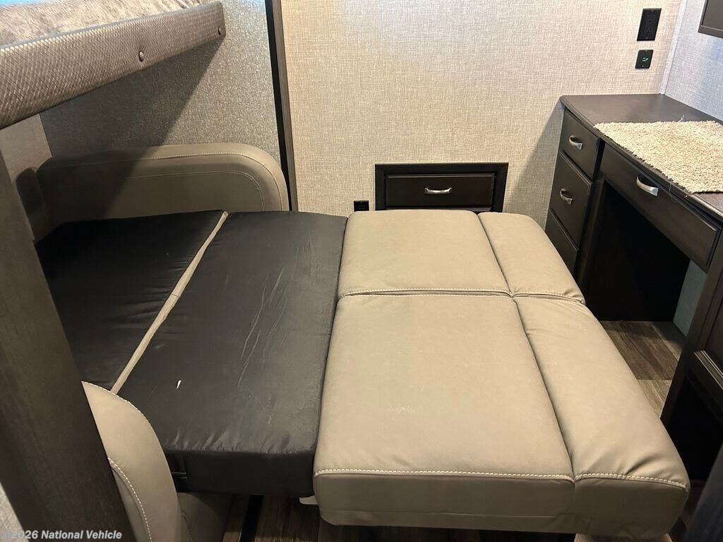 You can work from anywhere with this fifth wheel thanks to the middle bonus room that offers a desk with TV above, a tri-fold sofa with removable table, a flip-up bunk and a closet. This multi-use room works for just about anything including an extra living area and bunkhouse. The shoe storage under the interior steps, the linen cabinet in the full bathroom, the walk-in closet in the master bedroom, and the overhead cabinets plus exterior storage allows you to bring whatever you want. Enjoy cooking in the kitchen that provides an island, a 21 cu. ft. residential refrigerator, a pantry and everything you need to keep everyone fed. The theater seats, the tri-fold sofa and the free standing table without a pedestal are great places to sit while watching the 50" Smart LED HDTV with fully digital HDMI output and JBL home entertainment system with subwoofer plus there is a fireplace below for those chilly evenings.