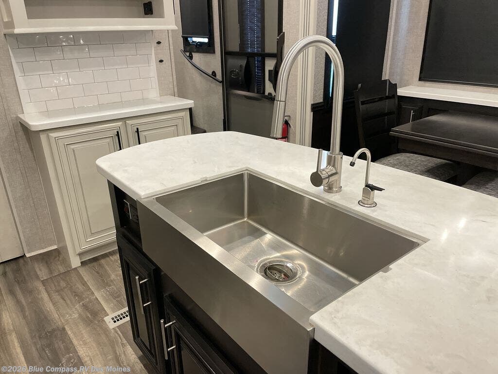 Each Pinnacle fifth wheel features Stronghold VBL lamination for the lightest, yet strongest construction in the RV industry. Add that to the Magnum Truss XL6 roof system and Climate Shield zero-degree tested weather protection and you'll be enjoying your fifth wheel for years to come. Some of the exterior conveniences you will appreciate are the Keyed-Alike lock system, the fully enclosed, universal docking center, and the 6-point hydraulic auto-leveling system for quick and easy set up. The 5 Star Handling Package will make towing a fifth wheel a walk in the park, and the two Whisper Quiet A/C units will keep you comfortable during the hot summer months. Inside, you'll enjoy the farmhouse stainless steel sink, the handcrafted hardwood glazed cabinetry, the vinyl flooring throughout, plus many more comforts. There is even a central vacuum system, a wireless remote control system, USB ports throughout, plus many more conveniences to make each trip enjoyable.