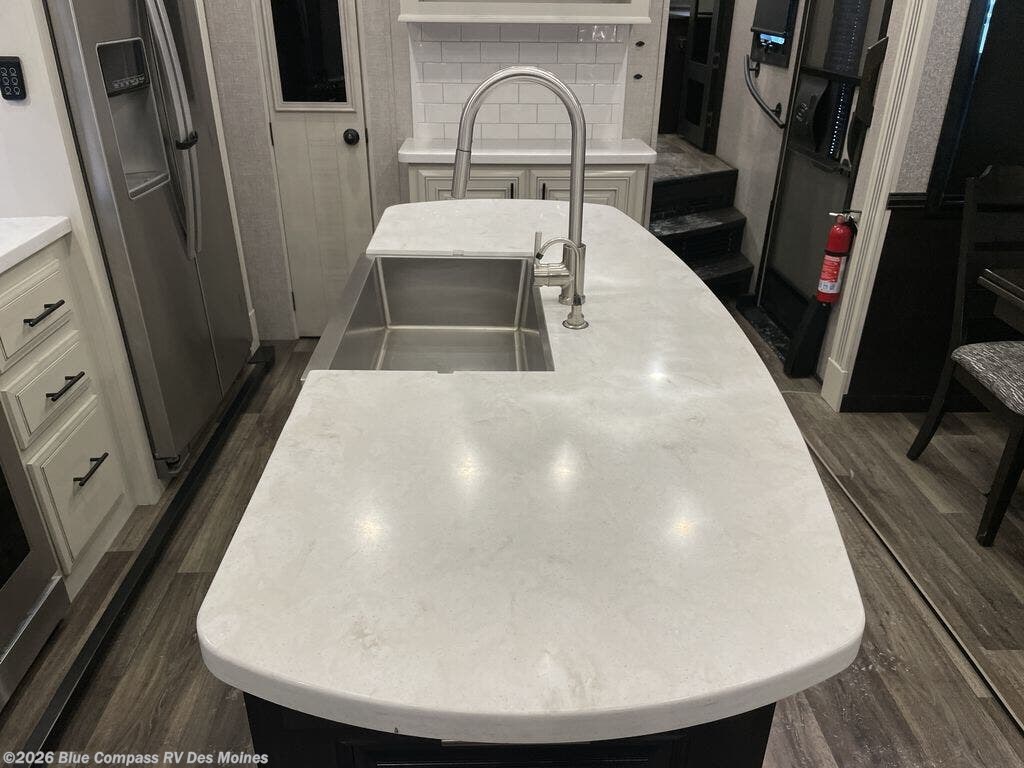 Trips to the lake are made comfortable in this triple slide out fifth wheel. Once you arrive at the campground, set up the two power awnings with LED lights, and there is an exterior TV for the big game. Head inside to relax on the theater seat directly across from the TV lift and fireplace, or play a game at the free-standing table. The chef of your group will love this Pinnacle kitchen with its residential refrigerator, kitchen island, a pantry, plus additional storage for canned goods or paper products. The full bath will allow you to stay clean throughout your trip, and you'll find residential bath backsplash, plus a shower with a seat for added comfort. Nothing says luxury like your own king bed slide out in the front bedroom, a walk-in closet for wrinkle-free clothes, and a flip-up dresser with a 32" TV!