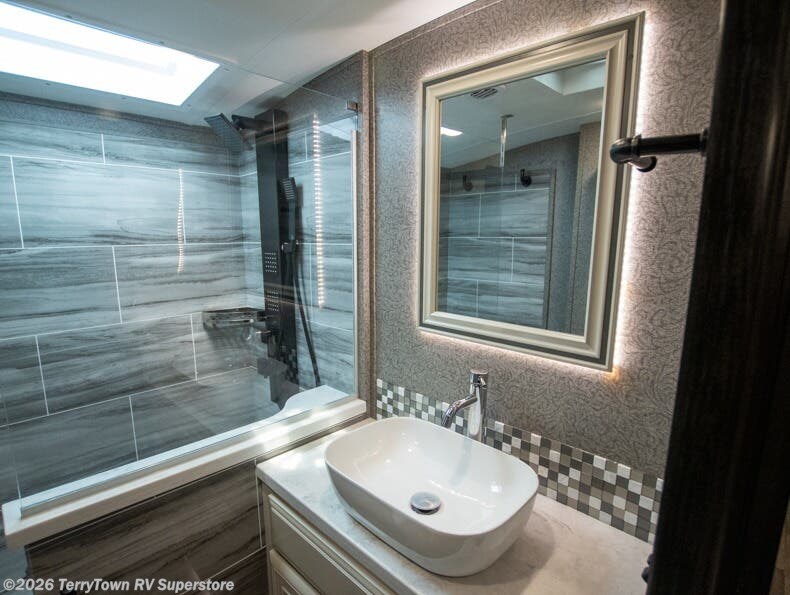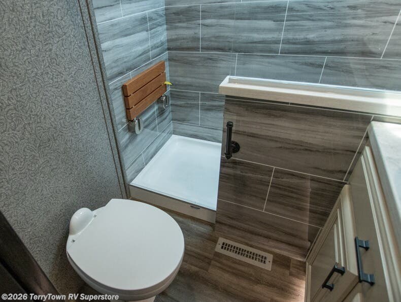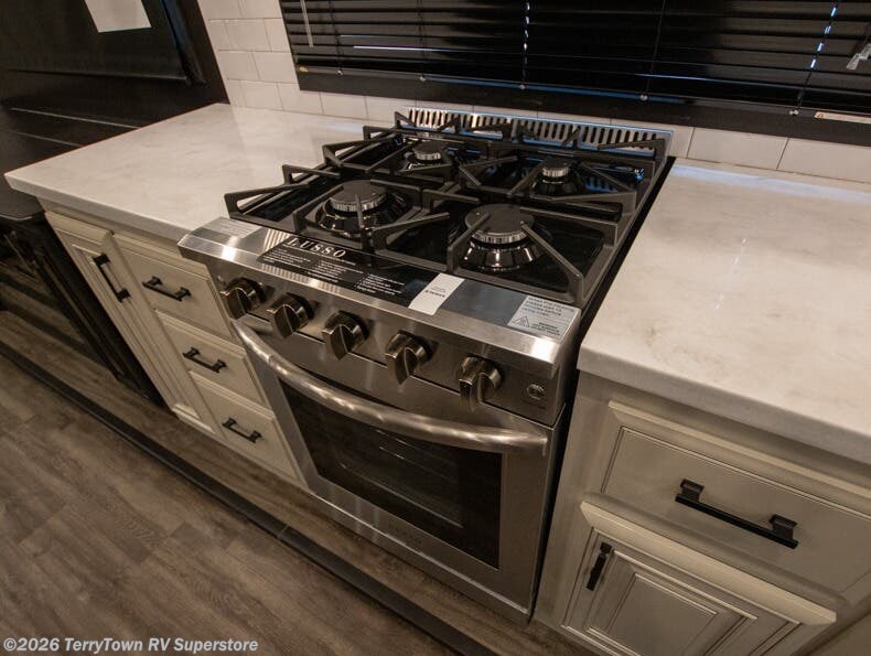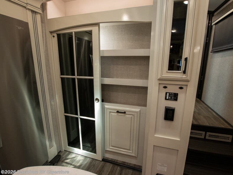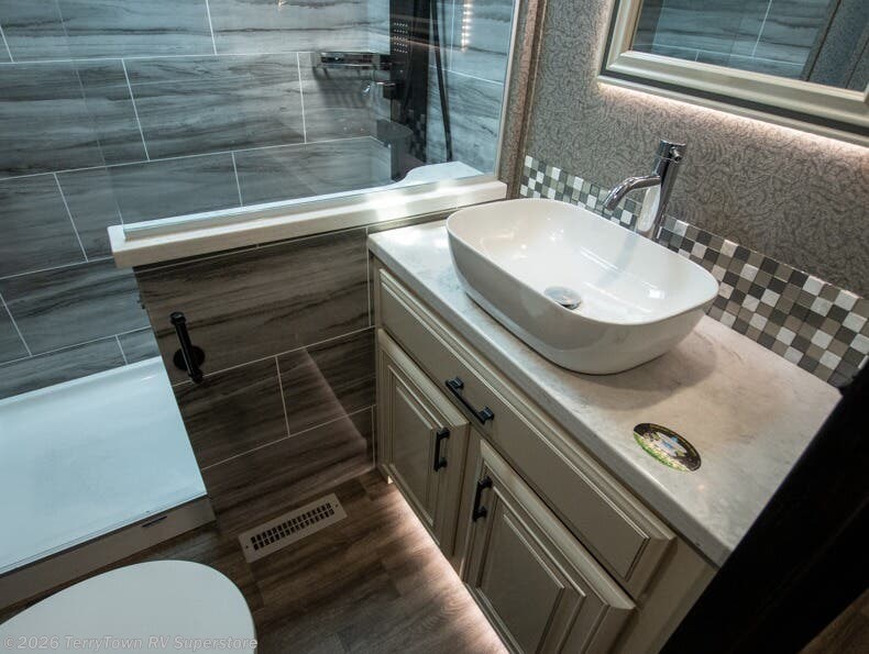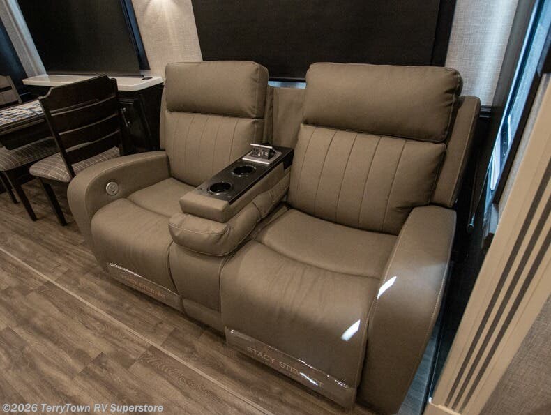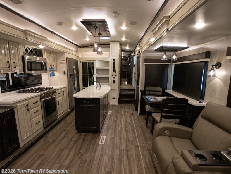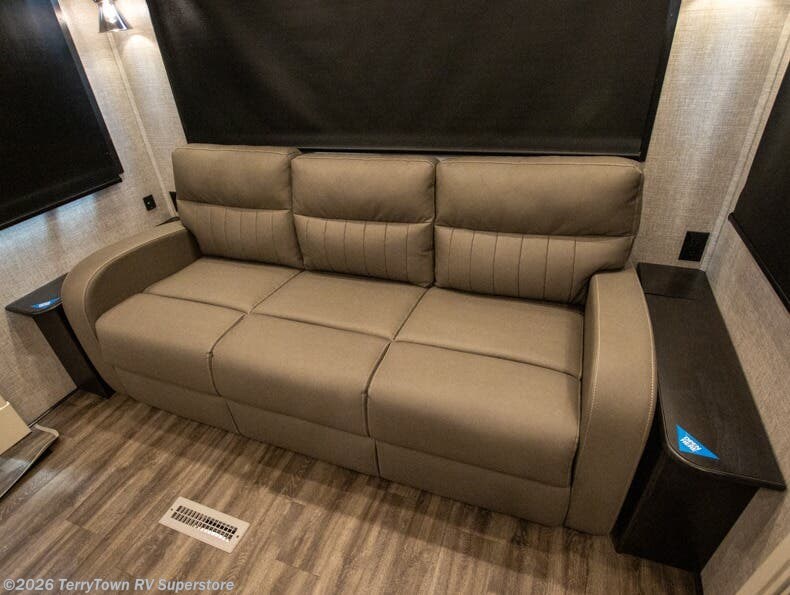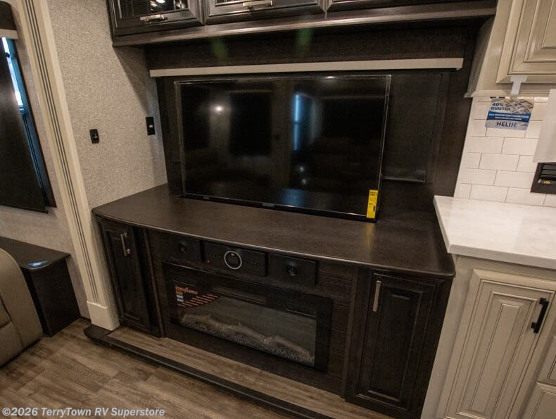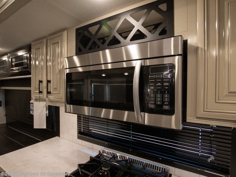 Your search is over the perfect luxury fifth wheel for your crew of four. Once you get settled at the campground, take a load off on the theater seat across from the TV lift and fireplace. There is also free-standing table here and a tri-fold sofa that will double as additional seating and sleeping space. The kitchen island includes a pull-out countertop extension for tons of prep space, and there is a 24" Insignia oven and a residential microwave to cook your meals in. Head to the full bath that includes a walk-in shower with a seat, an LED backlit custom framed mirror, plus residential bath backsplash for added luxury. You're gong to love the front private bedroom with its king bed slide out, 32" TV, plus a walk-in closet complete with a hamper and washer and dryer prep!