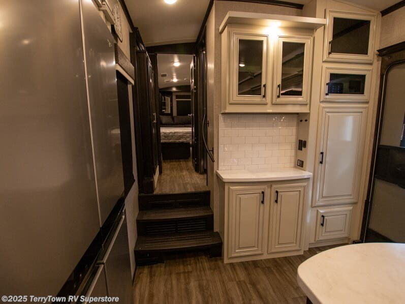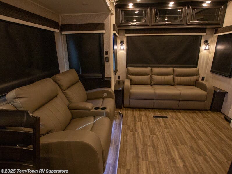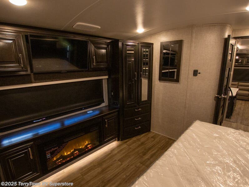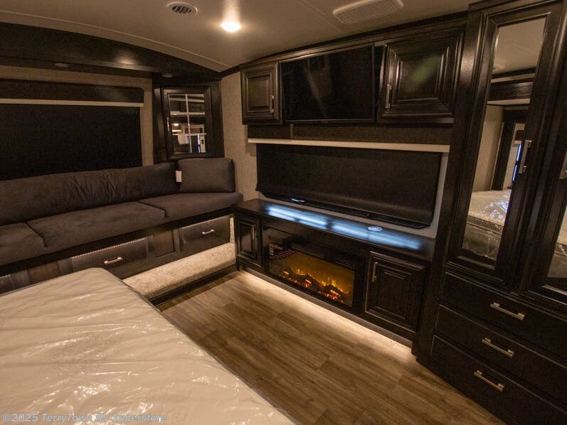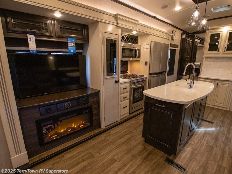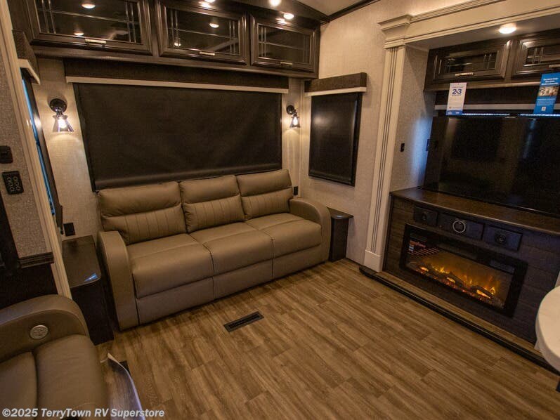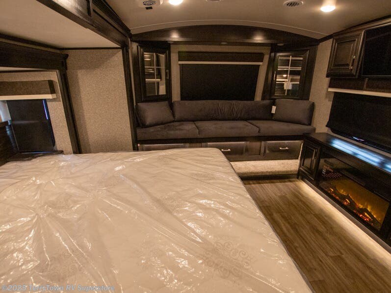Take your camping trips up a notch in this luxurious fifth wheel! Your family will love to visit in the rear living area on the tri-fold sofa or theater seat, plus there is a free-standing table here to dine at together. The TV lift and fireplace will make it feel more like home, along with the kitchen island and residential refrigerator. Head up the steps to find cabinets for the optional washer and dryer, a full bath with a large bath vanity, plus a private bedroom up front you are sure to love. When you aren't resting on the king bed slide out, read a book on the front window seat, or watch a movie with the bedroom TV provided. There is even a bedroom fireplace for added comfort. And check out the exterior with two power awnings with LED lights and a 32" TV!