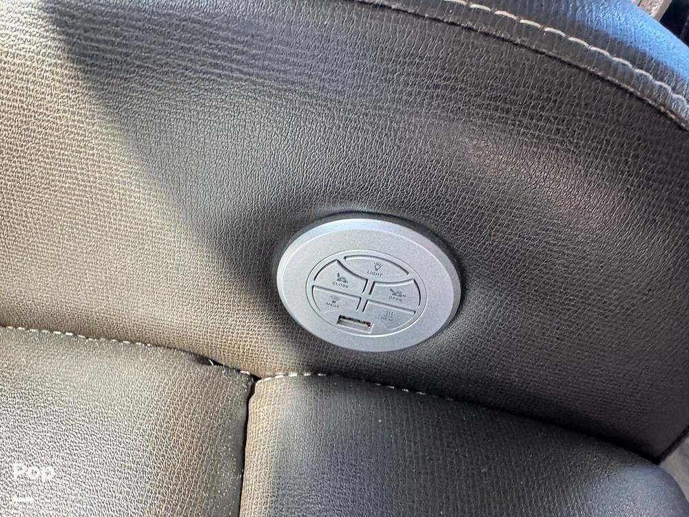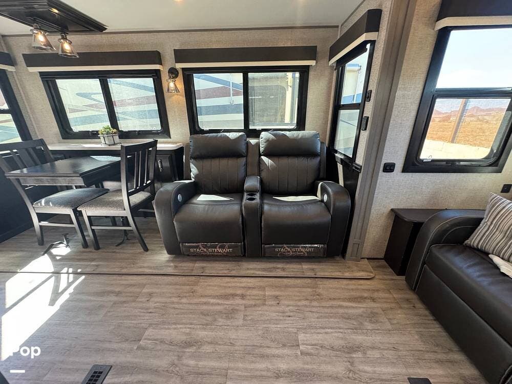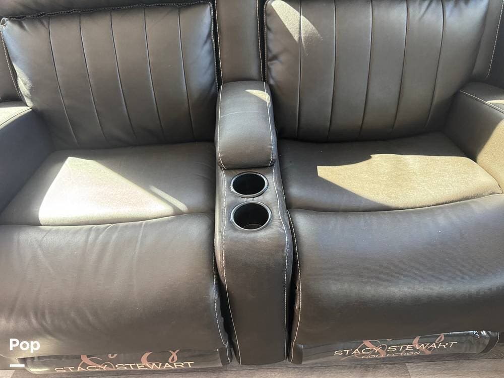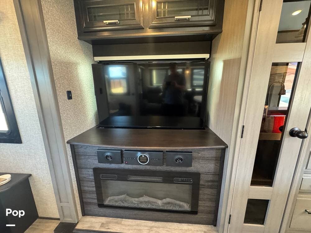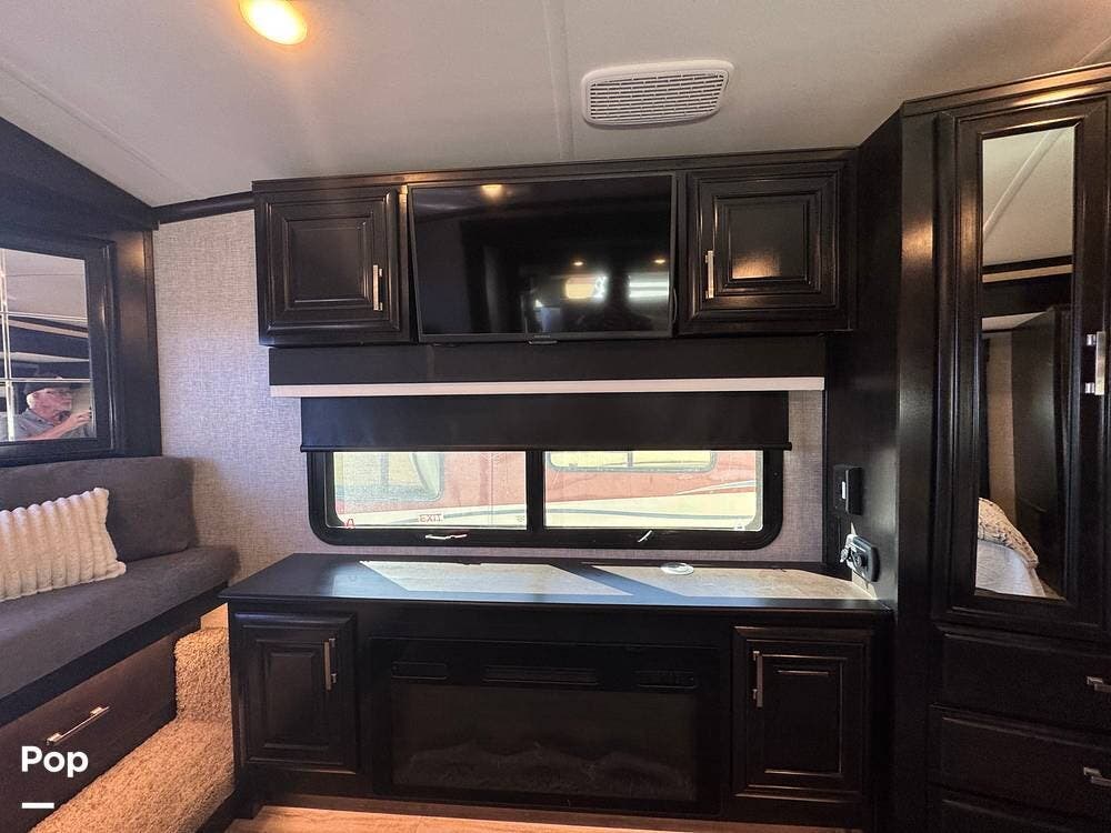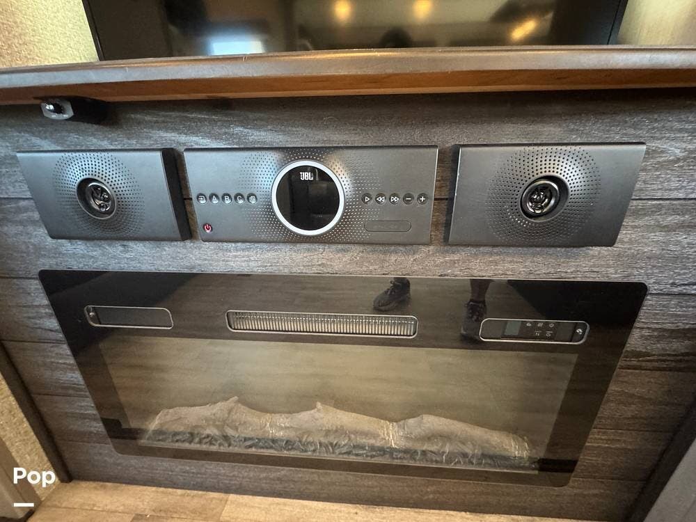The living area is a true retreat, featuring a plush tri-fold sofa, theatre seating, and a cozy electric fireplace crowned by a large LED TV on a lift, which tucks away to reveal a beautiful picture window. Soft LED lighting, rich wood cabinetry, and residential finishes throughout amplify the upscale ambiance.