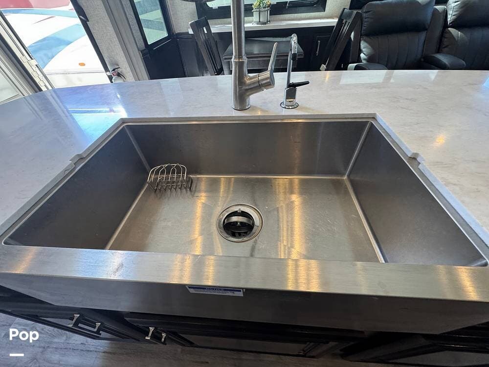 The gourmet kitchen is a chef's delight. It features a residential refrigerator, large solid-surface countertops, a spacious pantry, and a kitchen island with a deep stainless-steel sink -- perfect for meal prep or entertaining. Overhead cabinets and under-counter storage ensure that everything has its place.