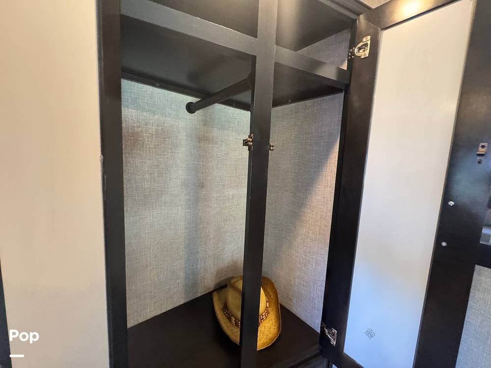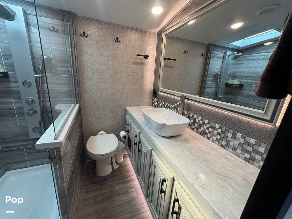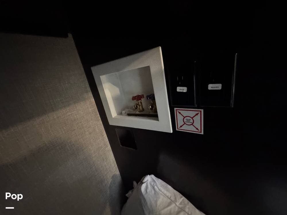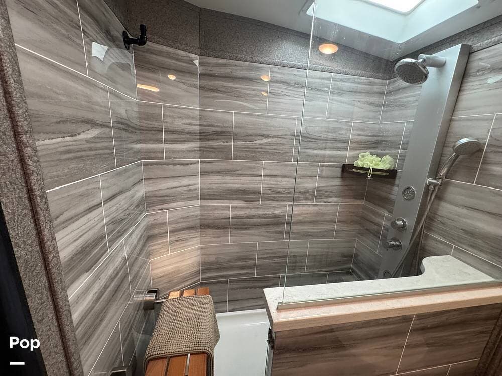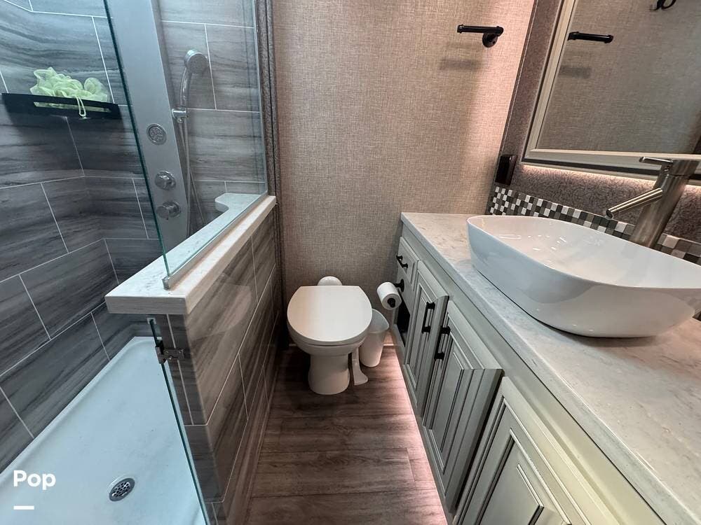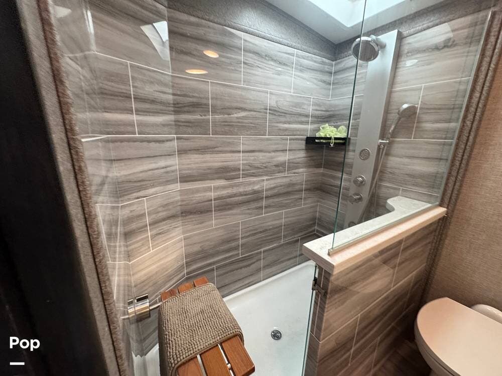 Step up into the master suite, and you'll find a king bed on a slide-out, creating even more space. Opposite the bed, an expansive wardrobe and dresser provide generous storage, while a washer/dryer prep area is hidden behind cabinet doors. The adjoining bathroom is equally luxurious, featuring a spacious shower with glass doors, a porcelain toilet, and an elegant vanity with a backlit mirror.