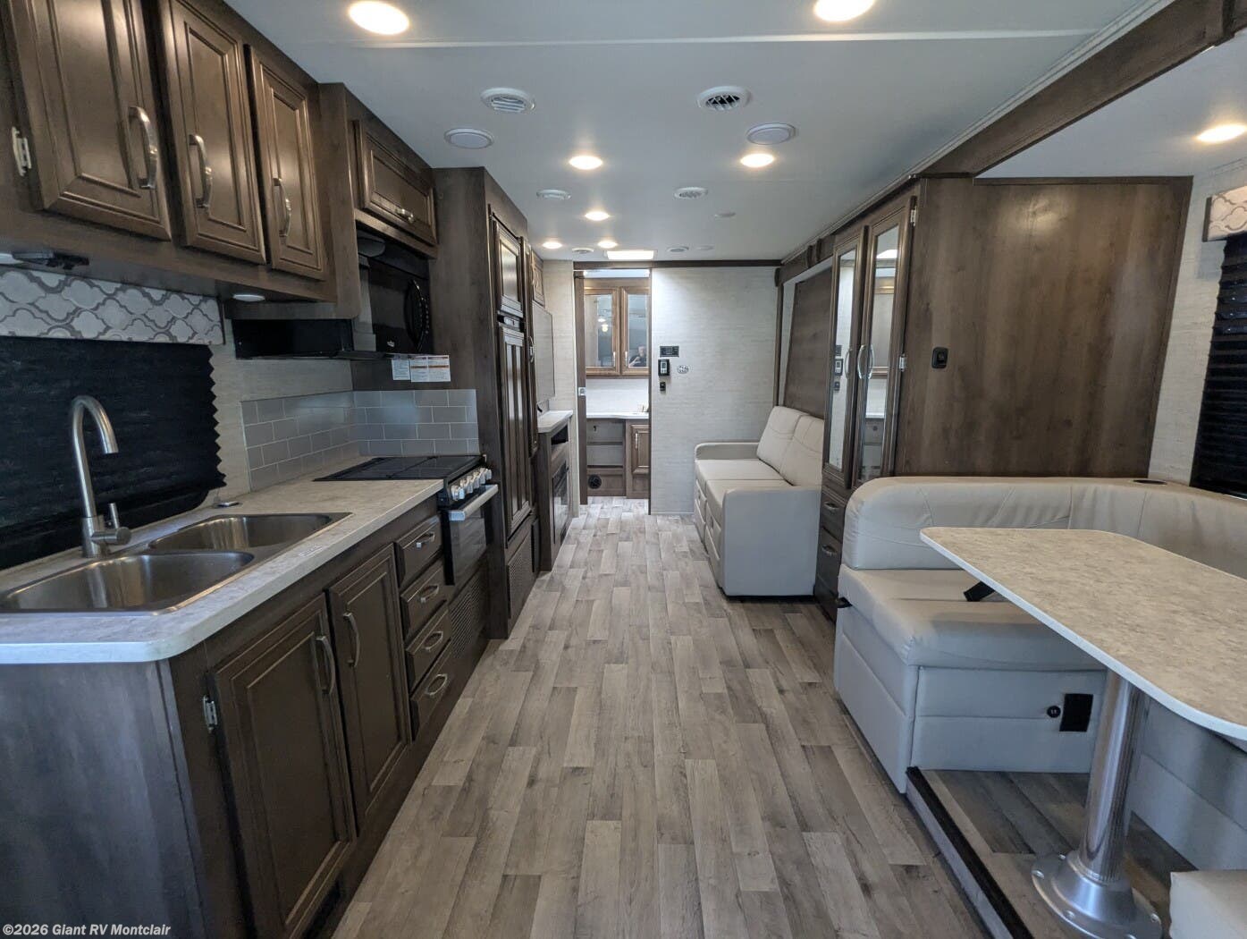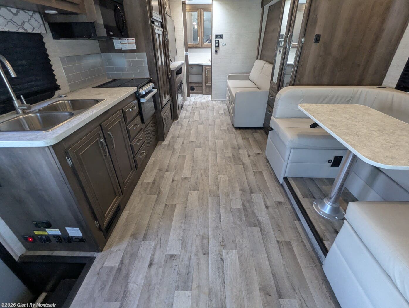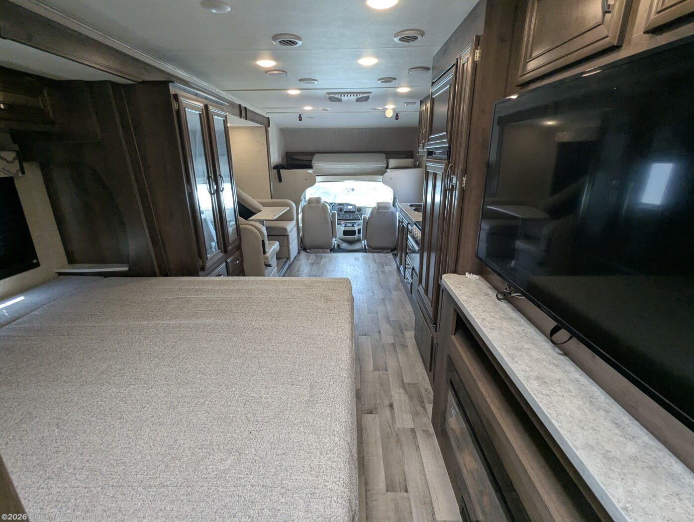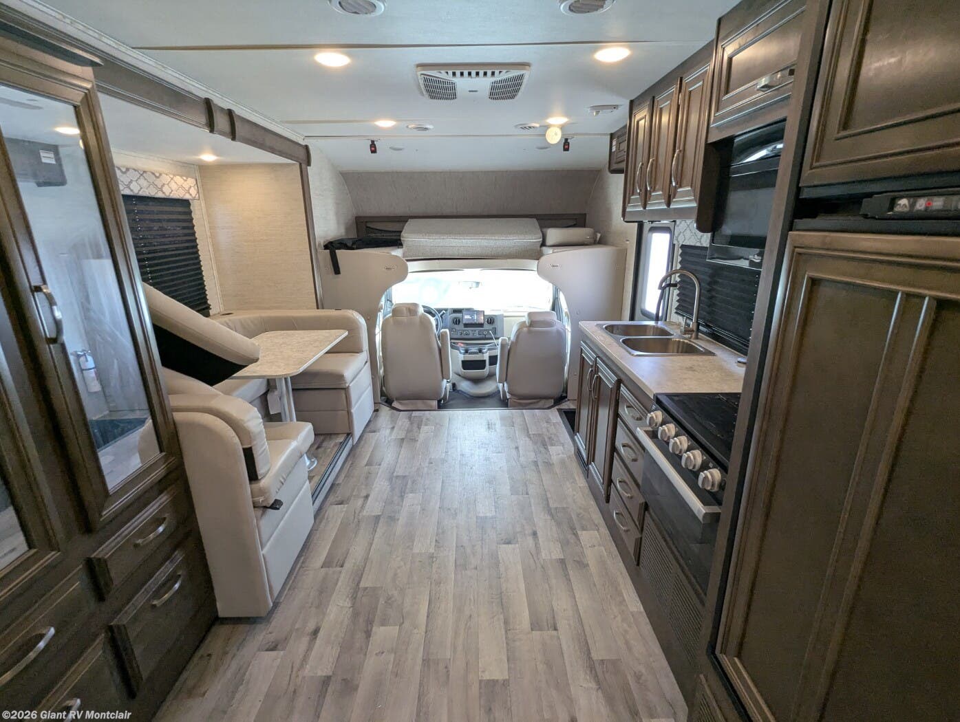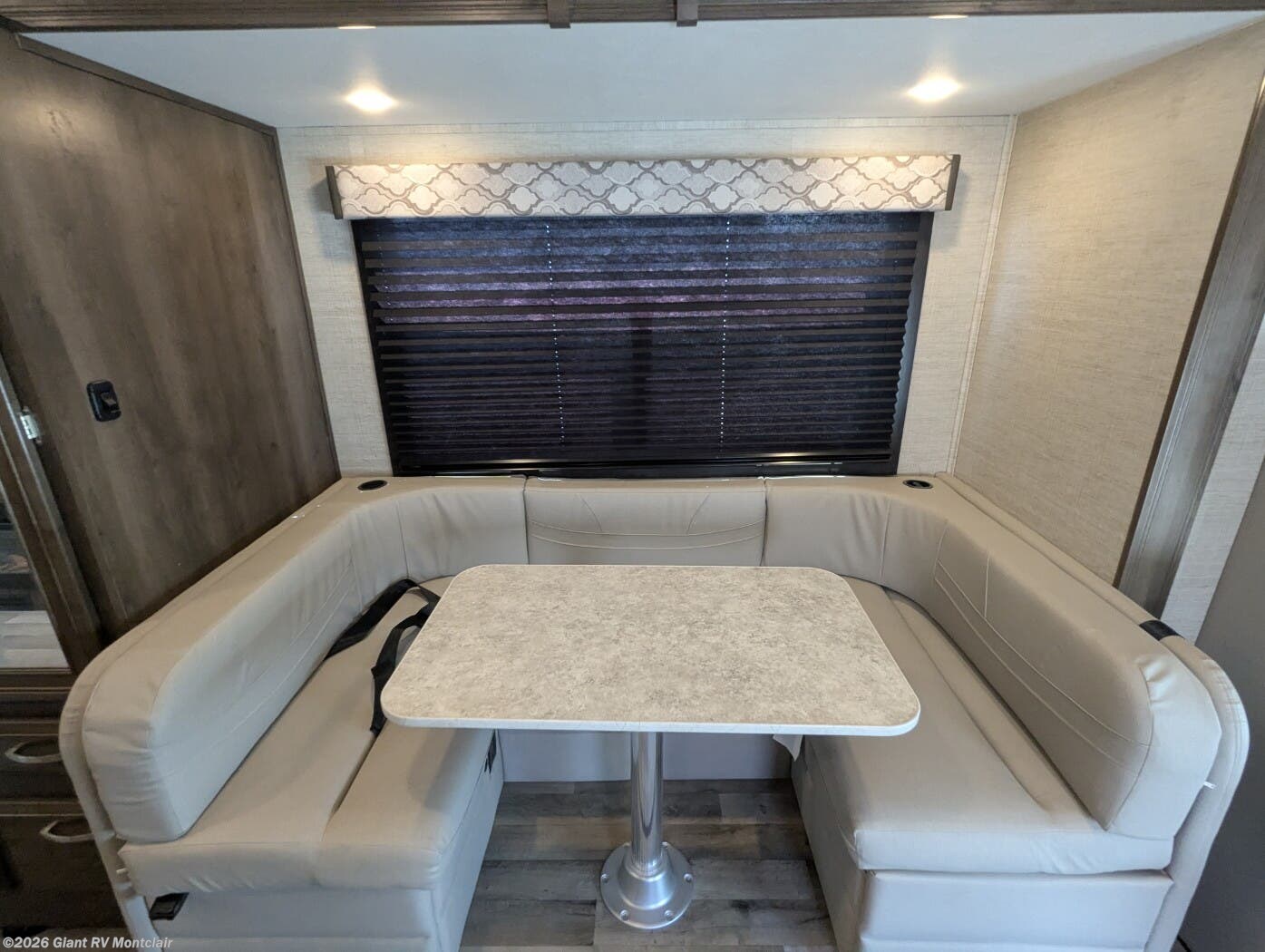 • Slide-Out Living Area with dinette, sofa, overhead bunk, Smart TV, and large windows — creating an open, relaxing space