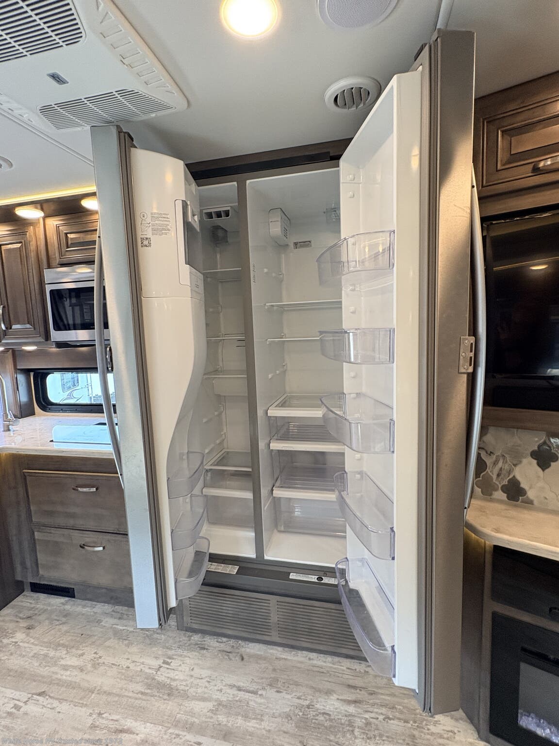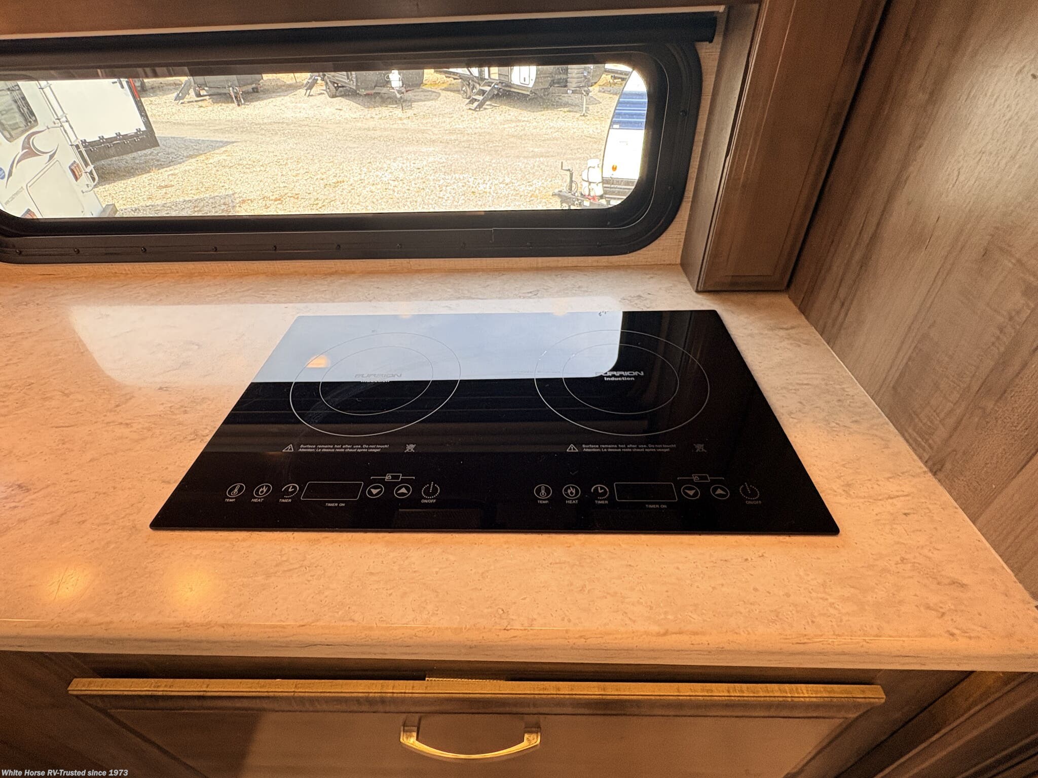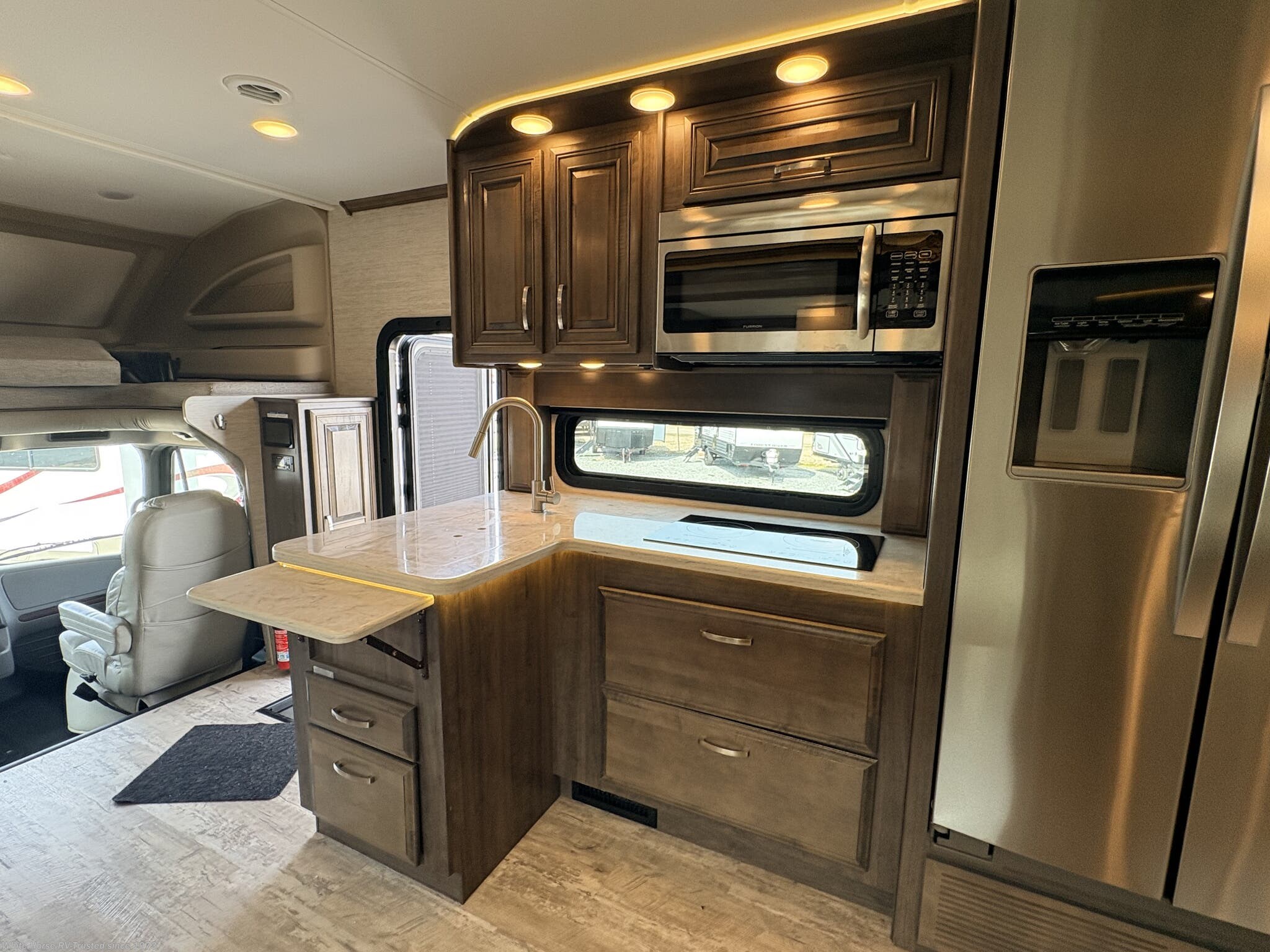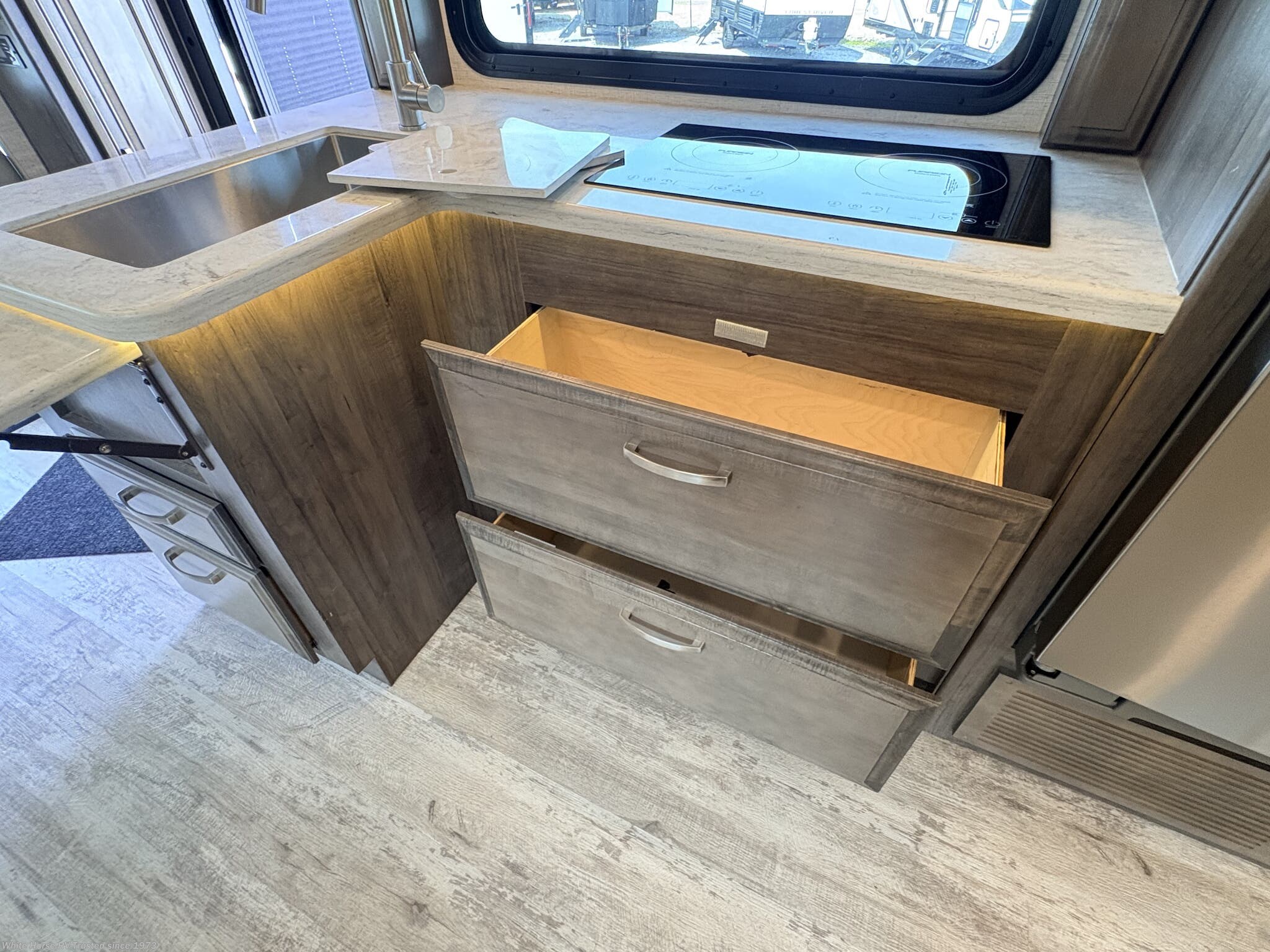 - 21 cu ft. side by side Residential Refrigerator w/ ice & water in door, Residential size convention microwave, Overhead Cabinetry, 2 burner induction cooktop & Solid surface countertops w/ large integrated stainless steel sink w/ sink covers