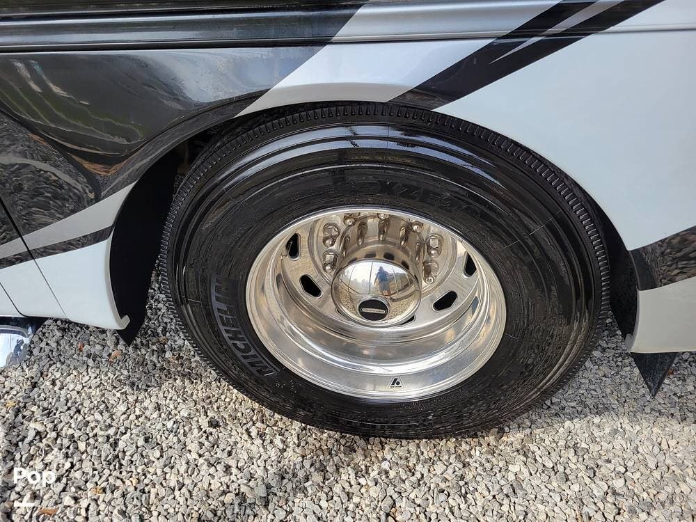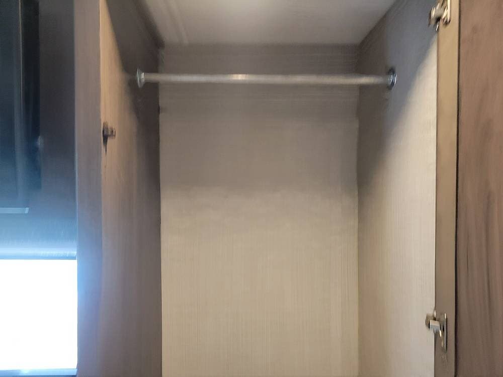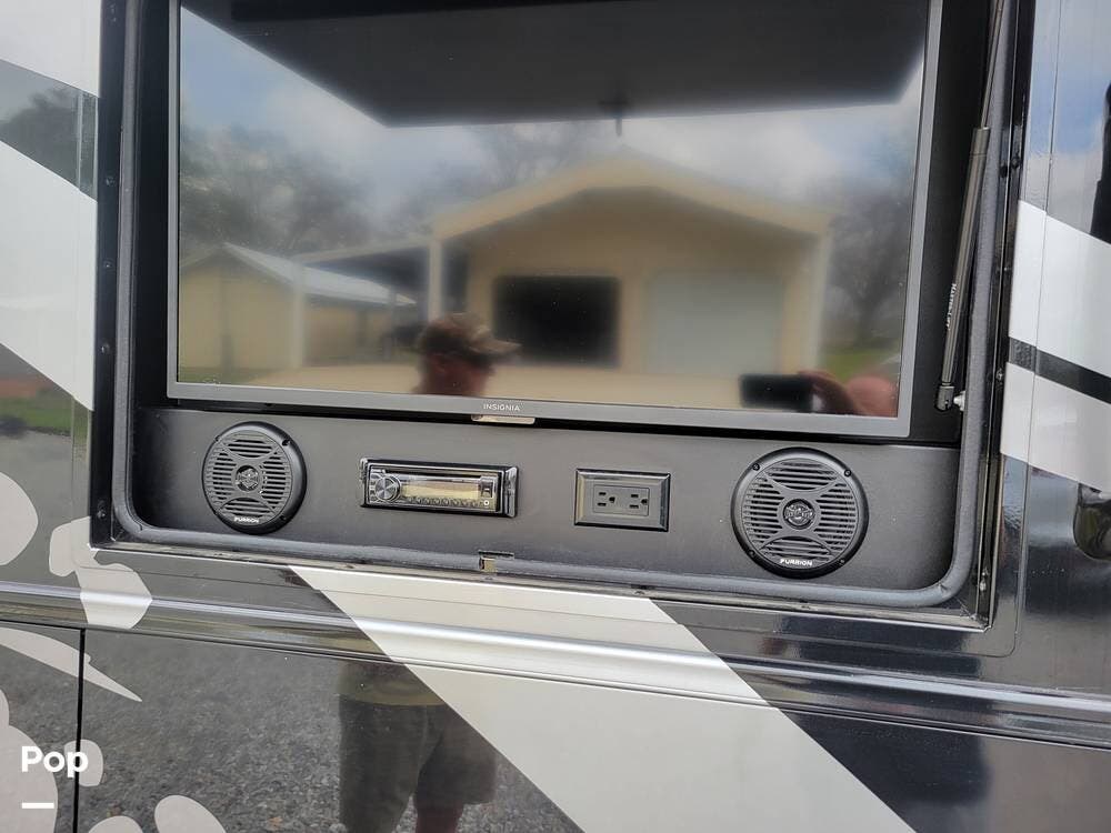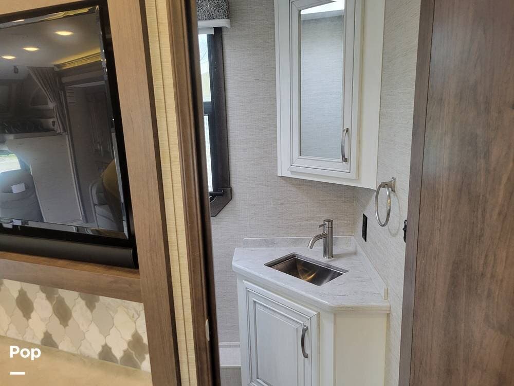 The half bath located mid coach, before the bedroom, provides convenience to guests and family. The bedroom suite features a king-size bed, TV, wardrobe, nightstands, dresser, and plenty of storage. Located at the rear of the coach is the well-appointed full bath with its large, roomy shower, accent lighting, and all the amenities you would expect a luxury bathroom to have.