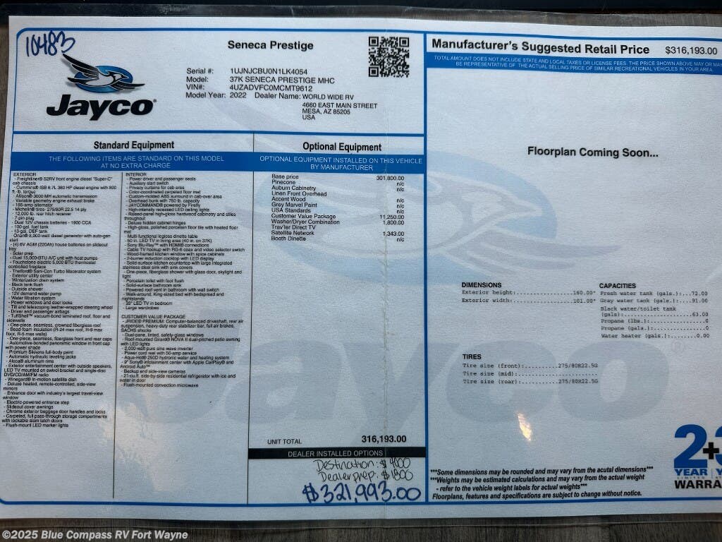 Request More Info on this 2022 Jayco Seneca Prestige 37k Offered for sale by Blue Compass RV Fort Wayne
