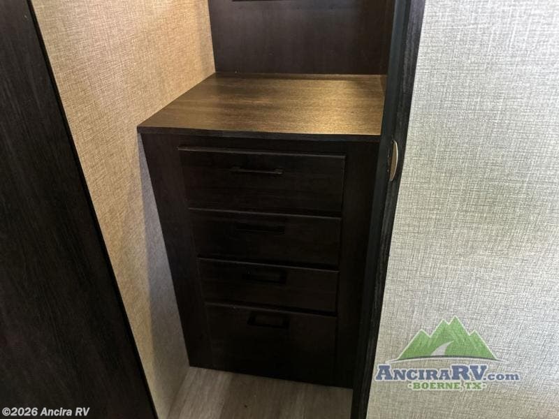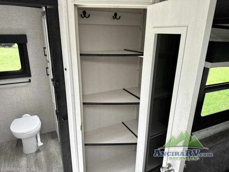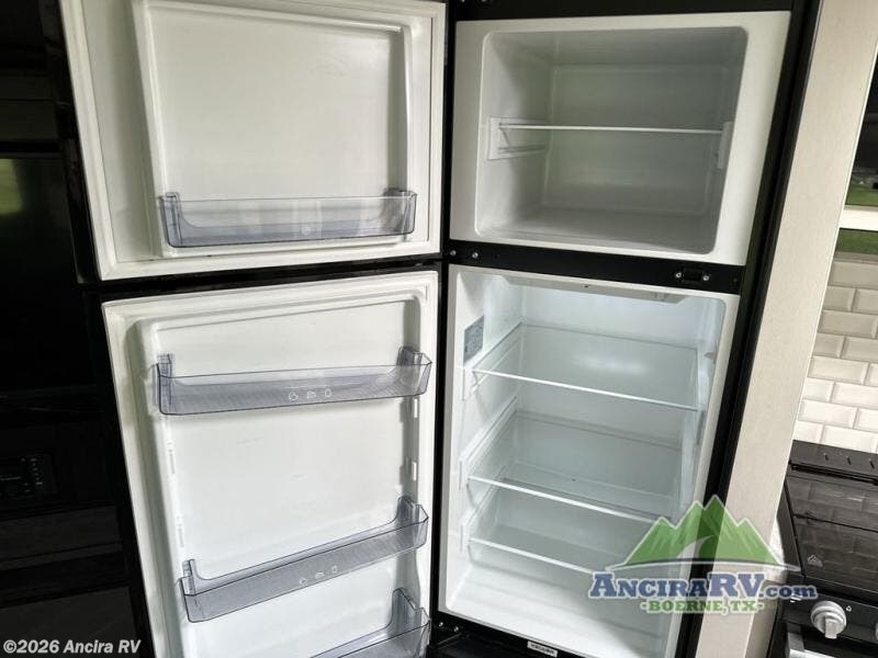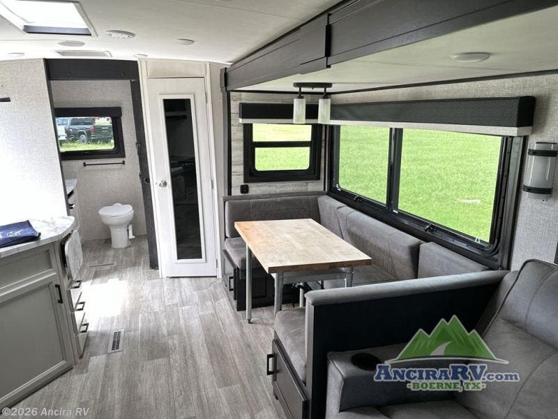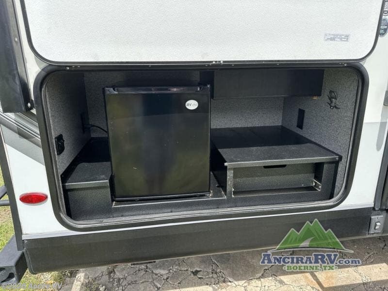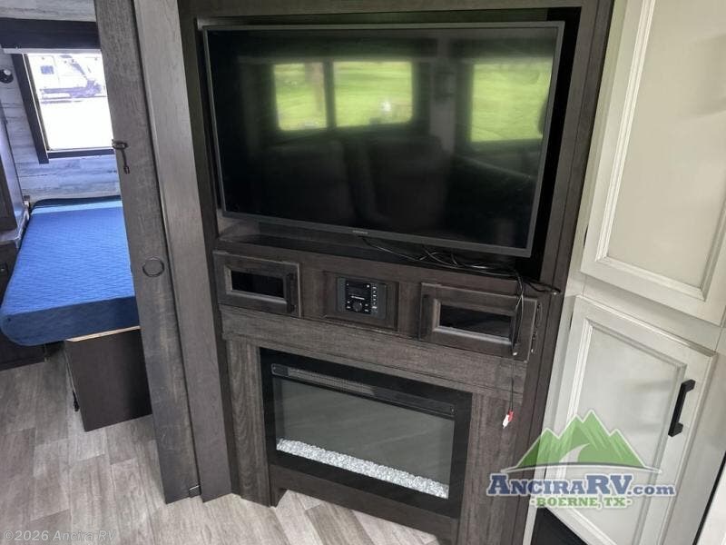 Your family will love camping every other weekend in this spacious travel trailer. The full rear bath is tucked away in the back for privacy, and there are dual entry doors for convenience. When you're not outside cooking on the outdoor kitchen, gather around the U-shaped dinette for game night. You'll find the LED TV and fireplace will make this area feel more like home, and there are two pantries to store snacks and dry goods. When it comes time to call it a night, head to the front private bedroom for a great night's rest on the queen bed, and you'll find two wardrobes plus a closet to keep your clothes tidy.
