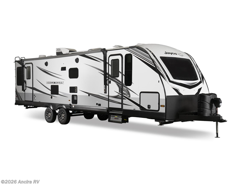 The lightweight White Hawk travel trailers by Jayco will blow you away with their roomy interiors, luxurious amenities, and durable construction. The Magnum Truss Roof System can withstand 50% more weight than the competition, and the Stronghold VBL lamination is the lightest, yet strongest in the industry. Each model includes the JAYCOMMAND "Smart RV" system with a tire pressure monitor system, plus American-made Goodyear tires for maximum durability and carrying capacity. You will love the sleek look of the front molded fiberglass cap with an automotive windshield and blue LED accent lighting, along with the frameless windows and automotive-style aluminum rims. The White Hawk travel trailers also include an arched interior ceiling, a kitchen skylight with a shade, residential vinyl flooring with cold crack resistance, and an electric fireplace.