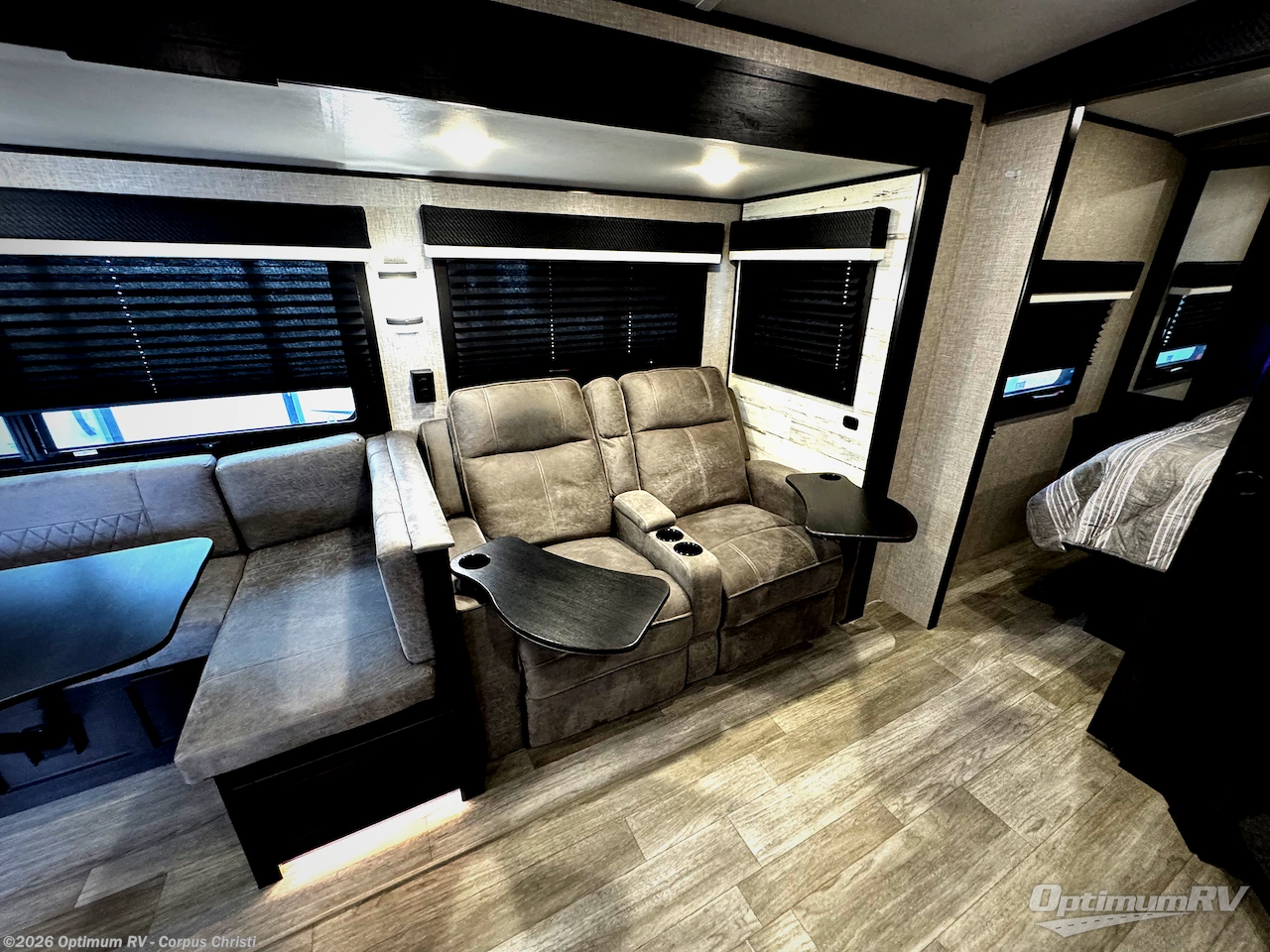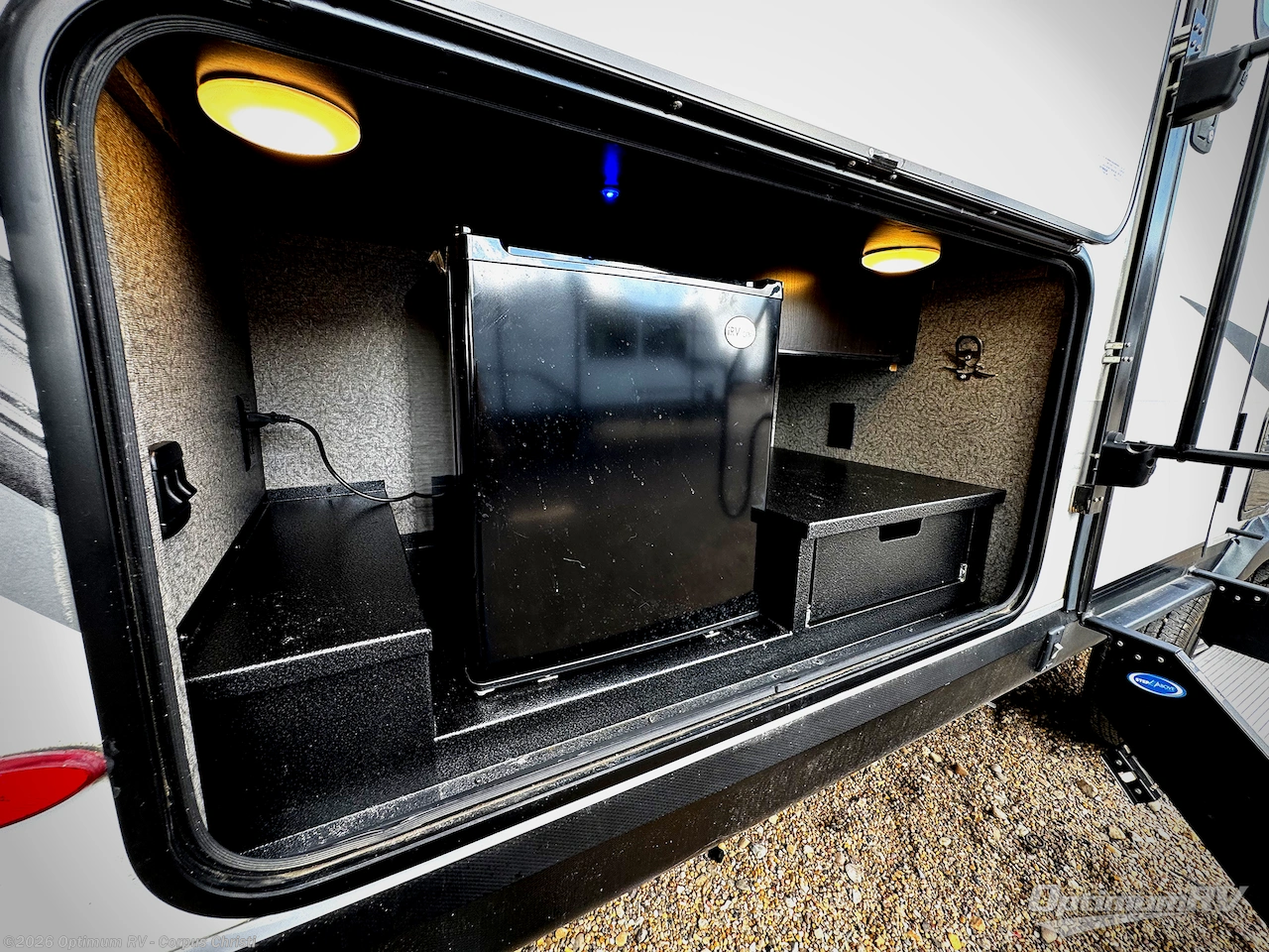 Your family will love camping every other weekend in this spacious travel trailer. The full rear bath is tucked away in the back for privacy, and there are dual entry doors for convenience. When you're not outside cooking on the outdoor kitchen, gather around the U-shaped dinette for game night. You'll find the LED TV and fireplace will make this area feel more like home, and there are two pantries to store snacks and dry goods. When it comes time to call it a night, head to the front private bedroom for a great night's rest on the queen bed, and you'll find two wardrobes plus a closet to keep your clothes tidy.
