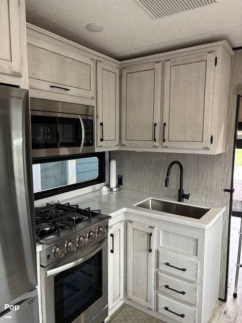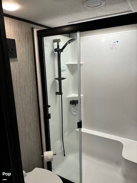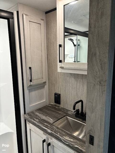 The spacious bathroom includes a residential shower, vanity, and medicine cabinet, ensuring comfort wherever you travel.